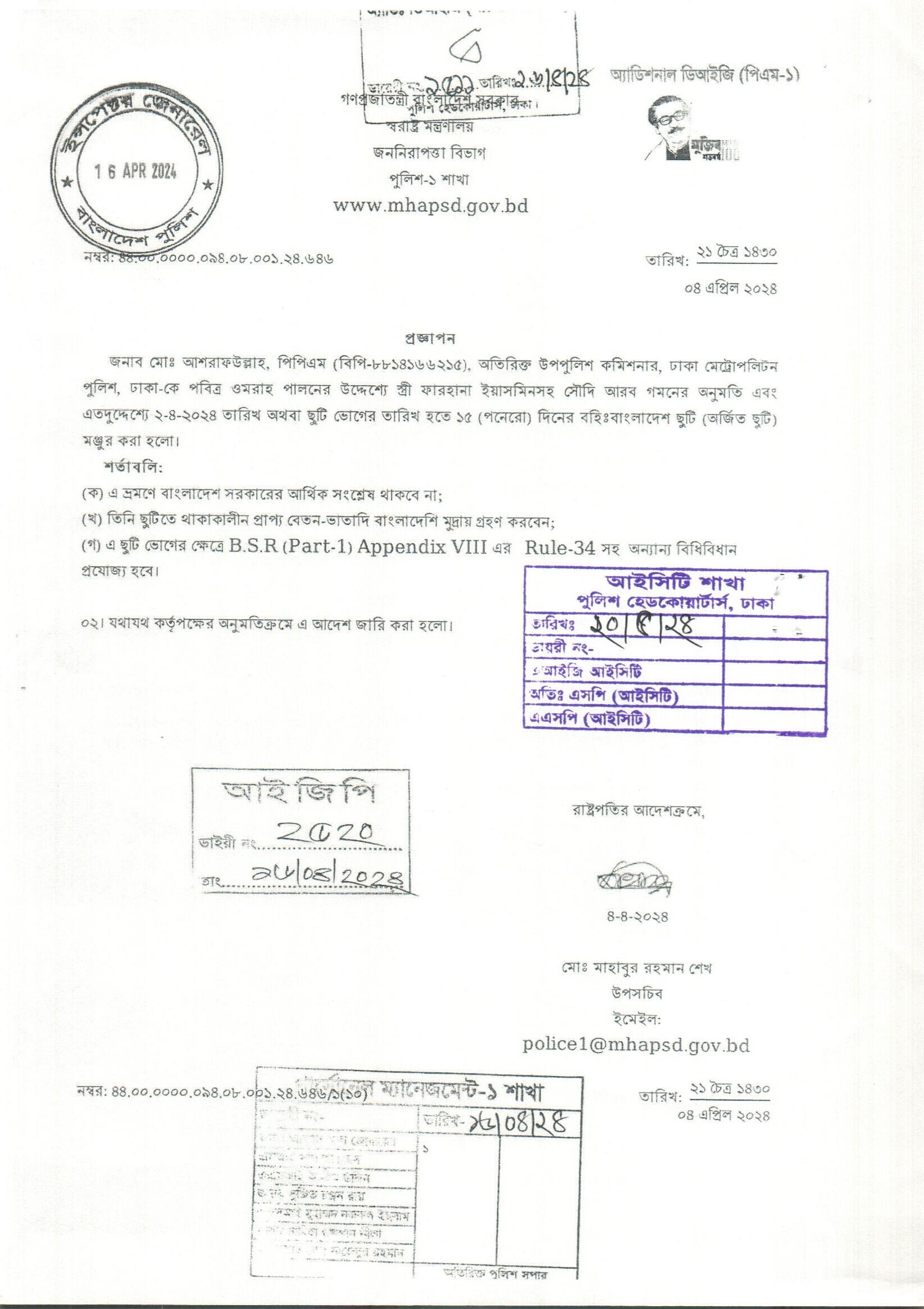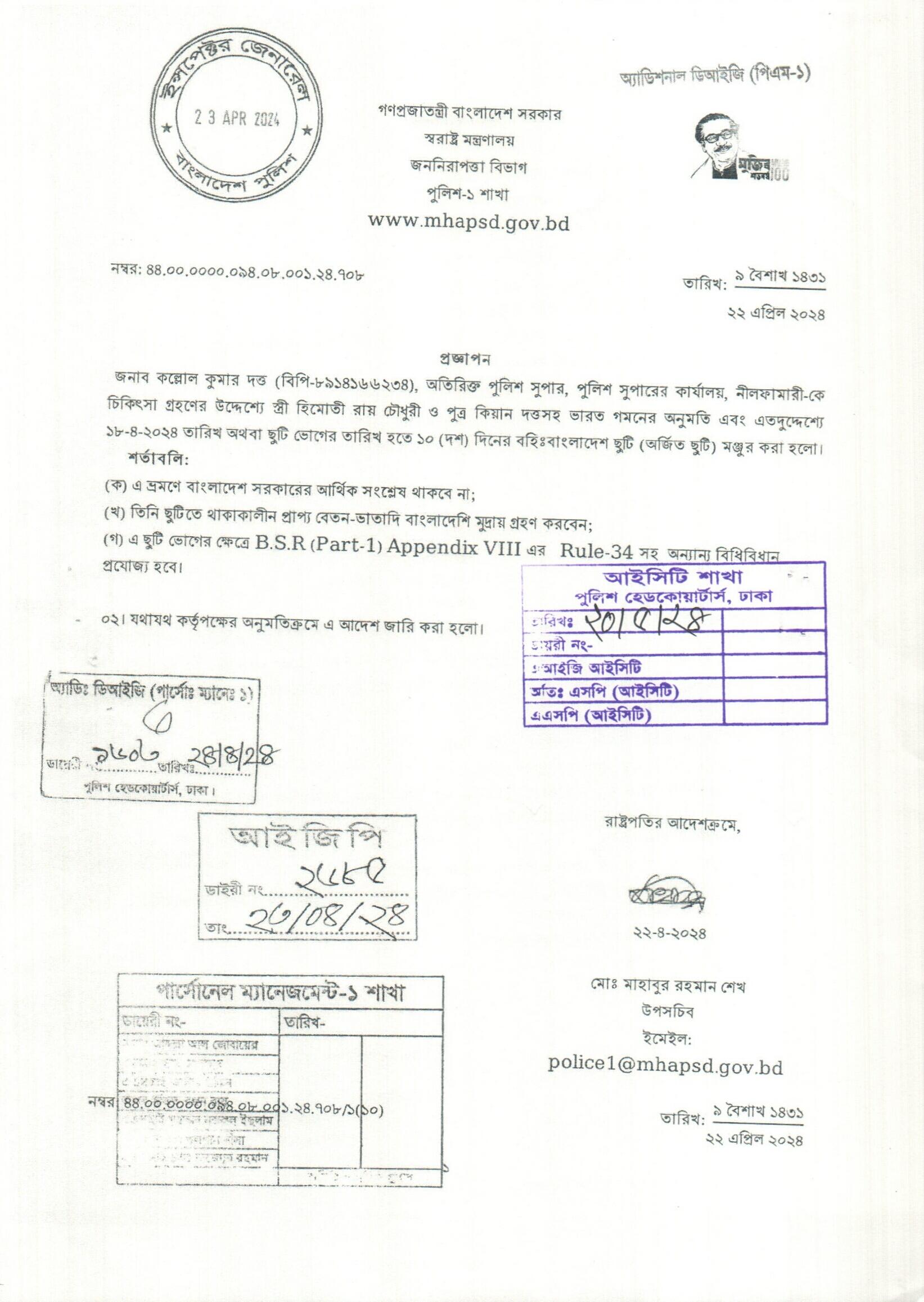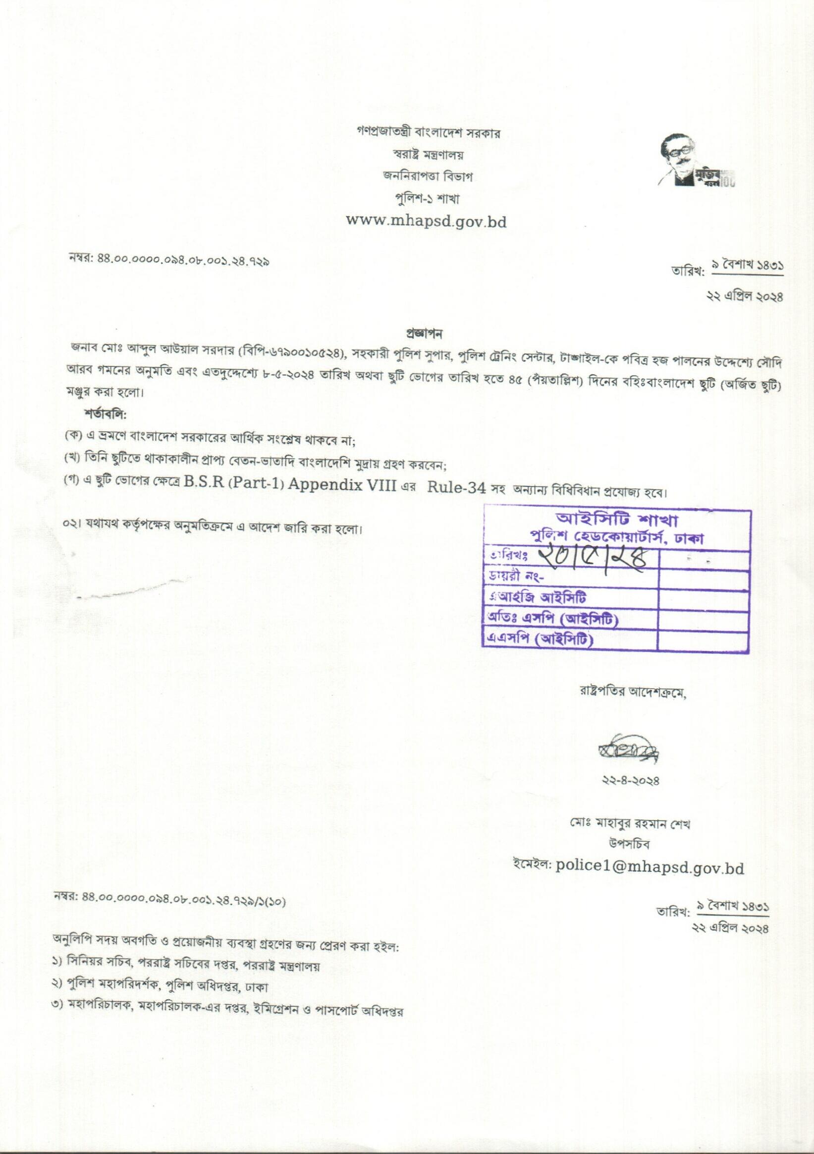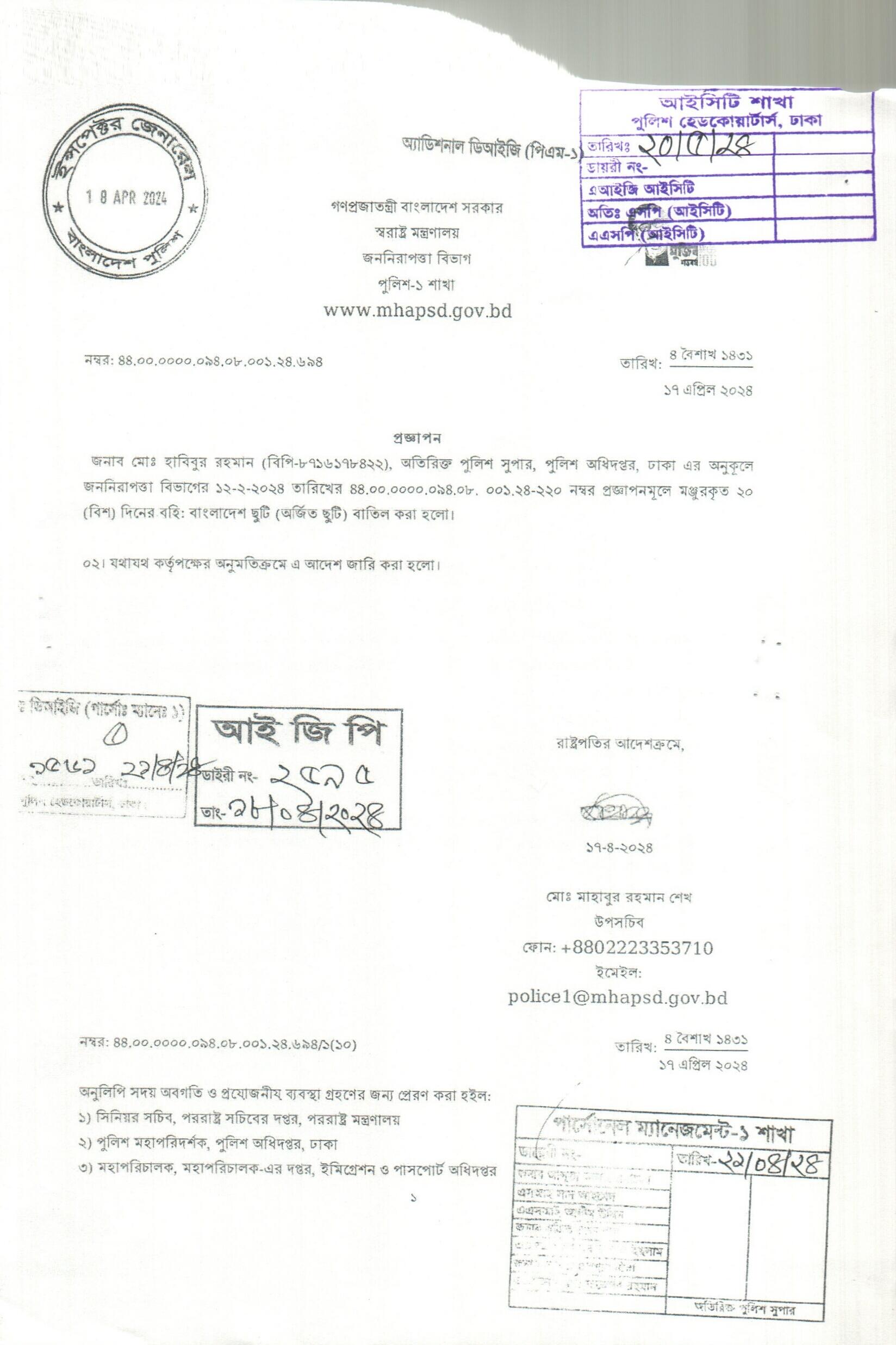 বহিঃ বাংলাদেশ ছুটি, প্রজ্ঞাপন নং- ৭২১, তারিখঃ ২২/০৪/২০২৪ খ্রিঃ।