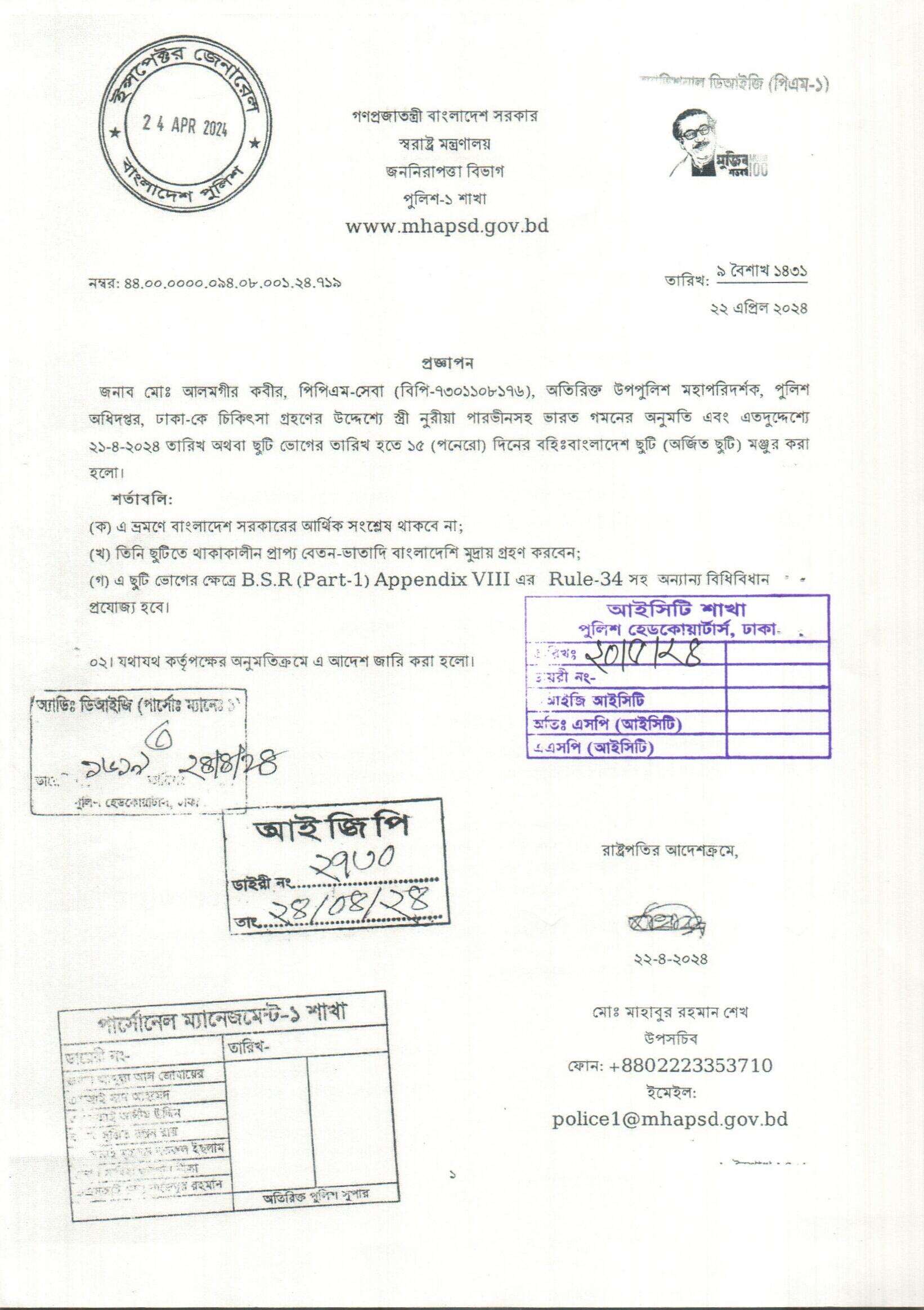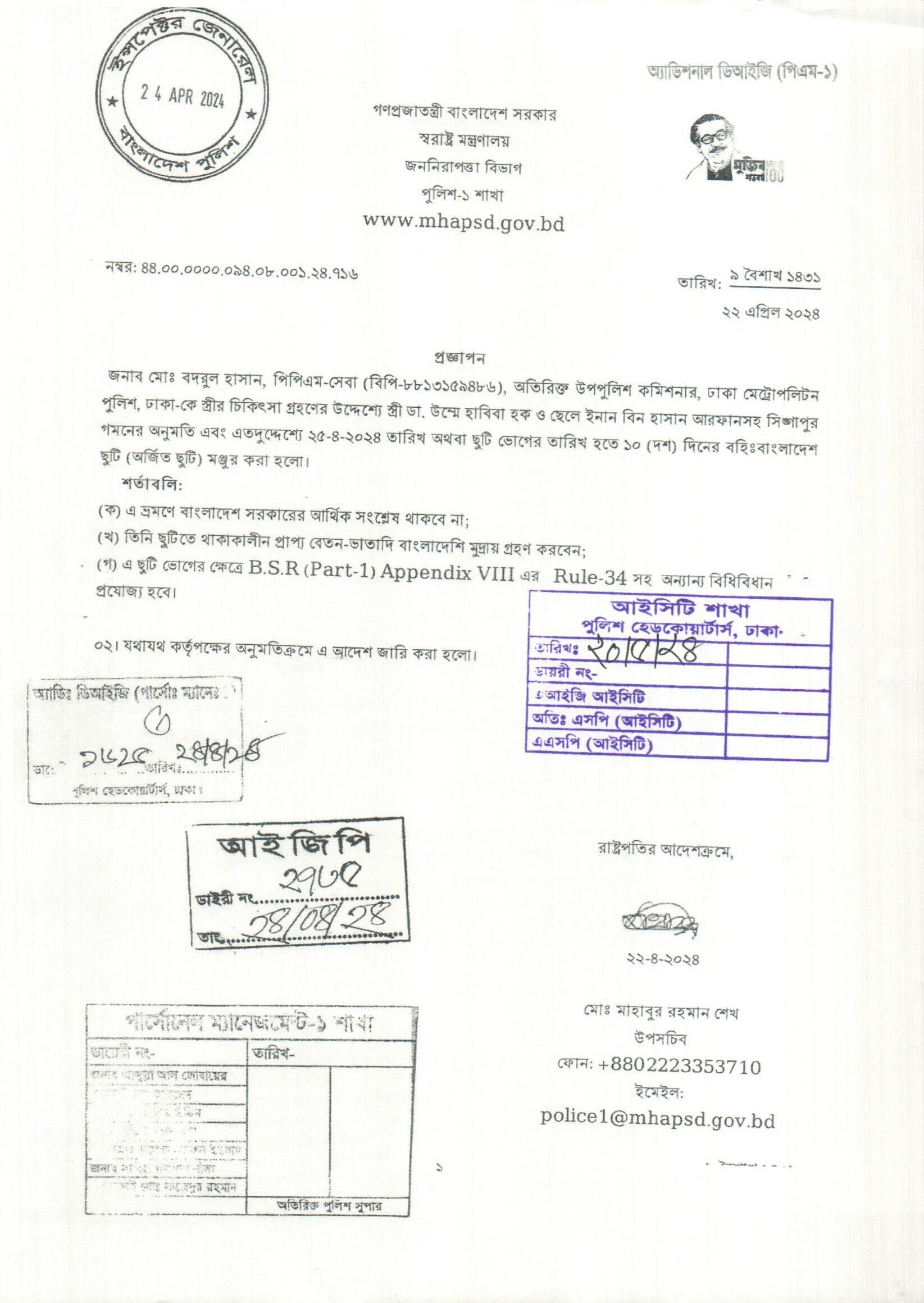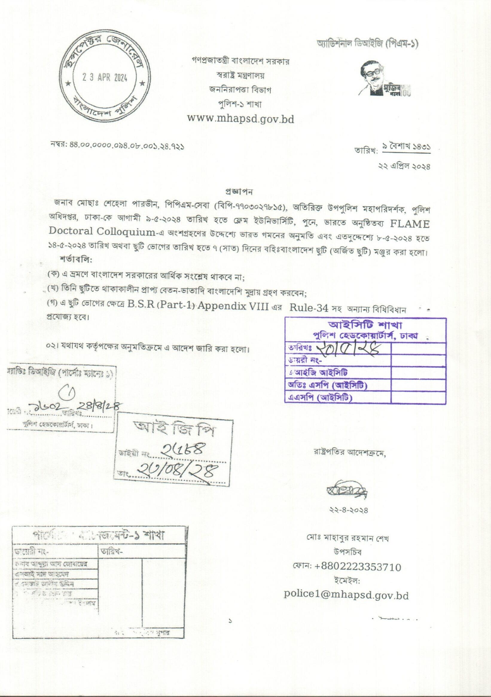 বহিঃ বাংলাদেশ ছুটি, প্রজ্ঞাপন নং- ৭২১, তারিখঃ ২২/০৪/২০২৪ খ্রিঃ।