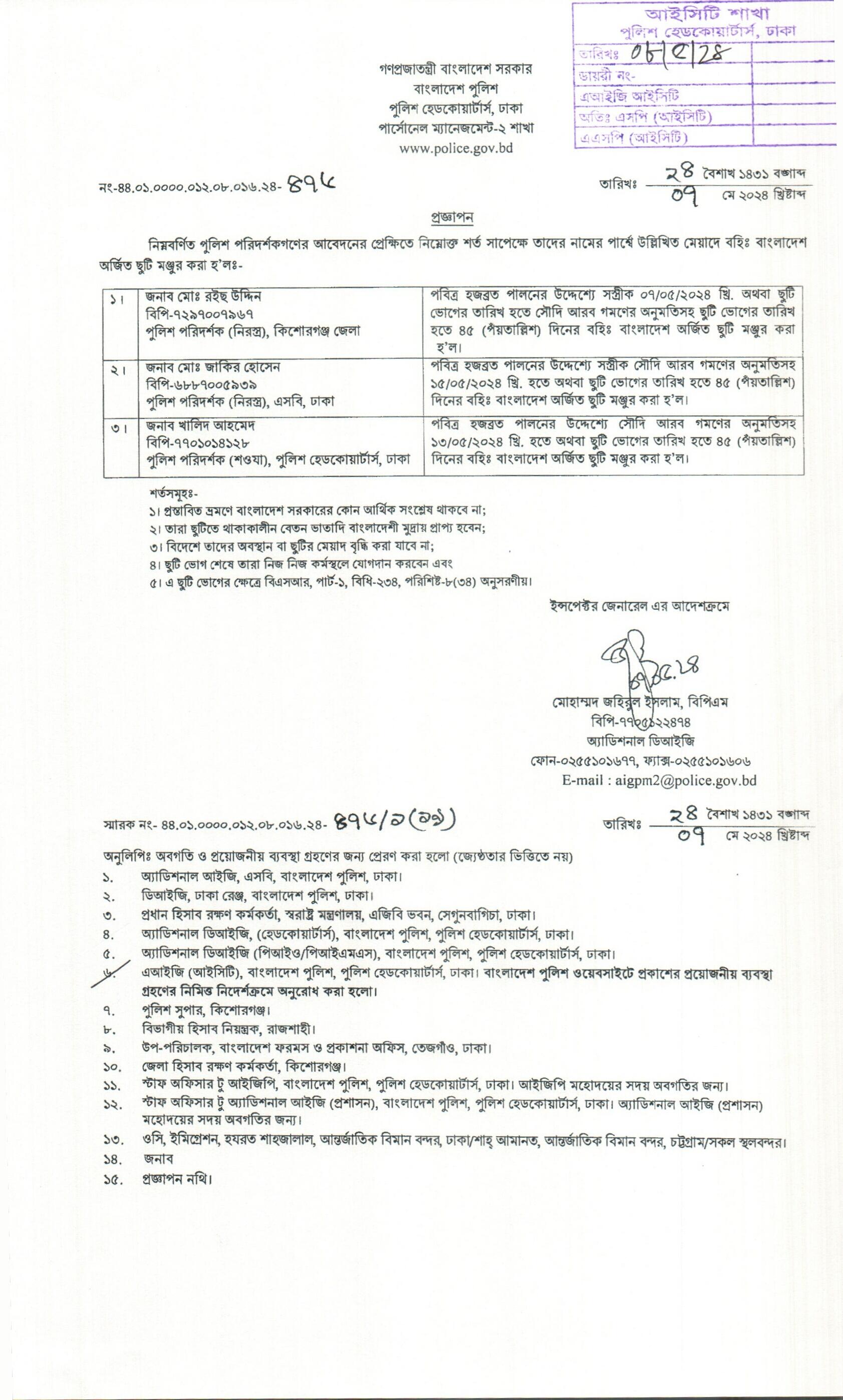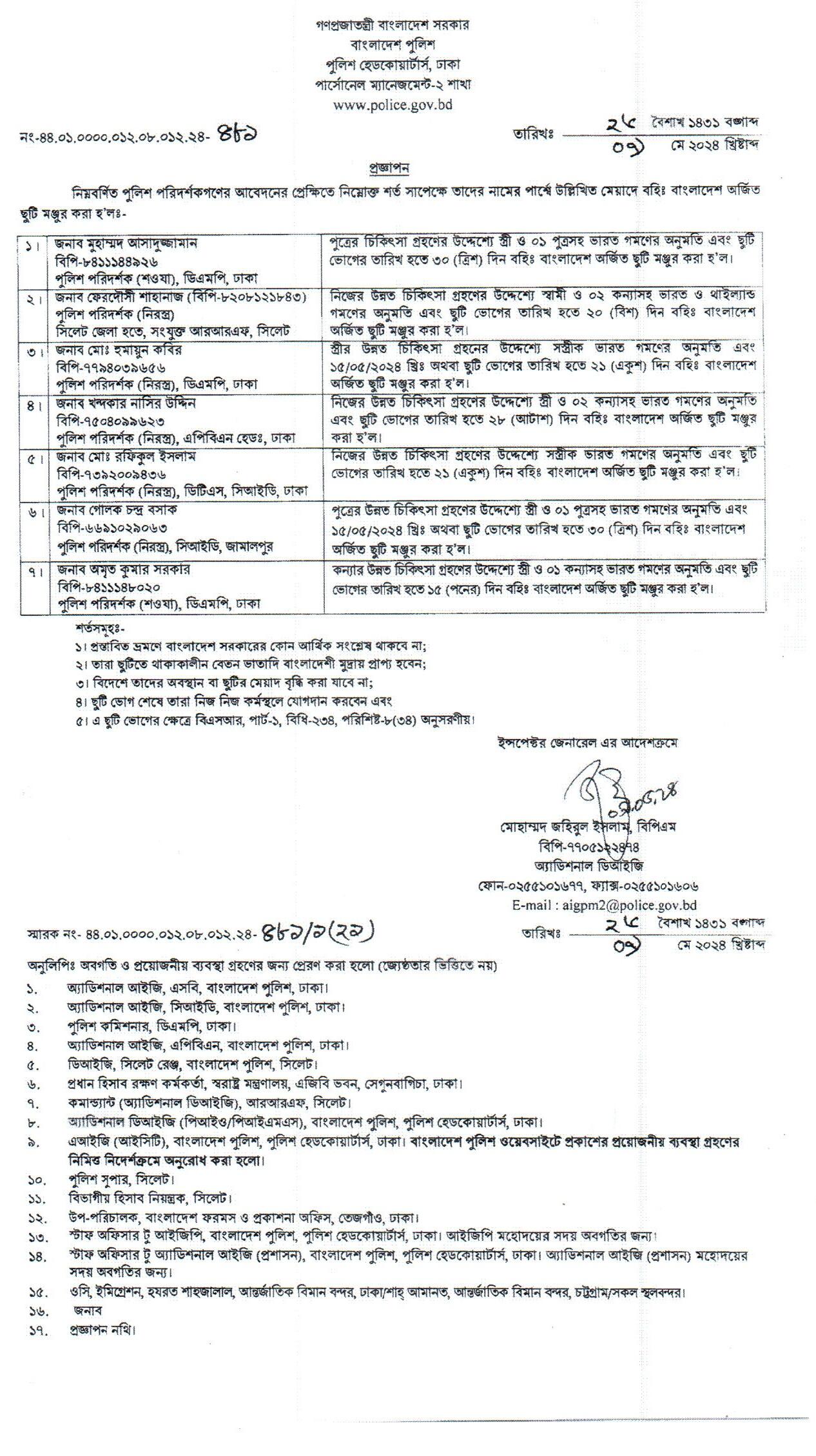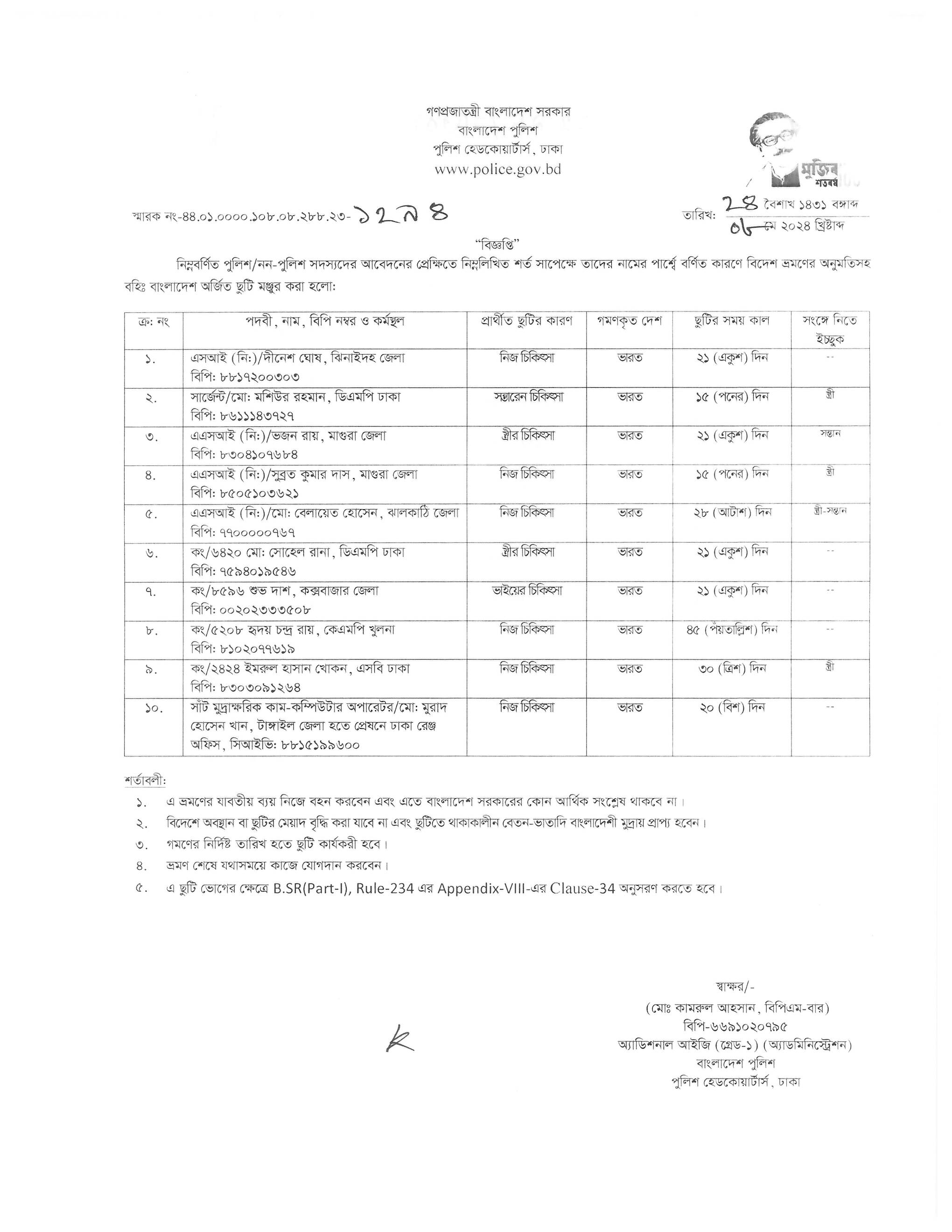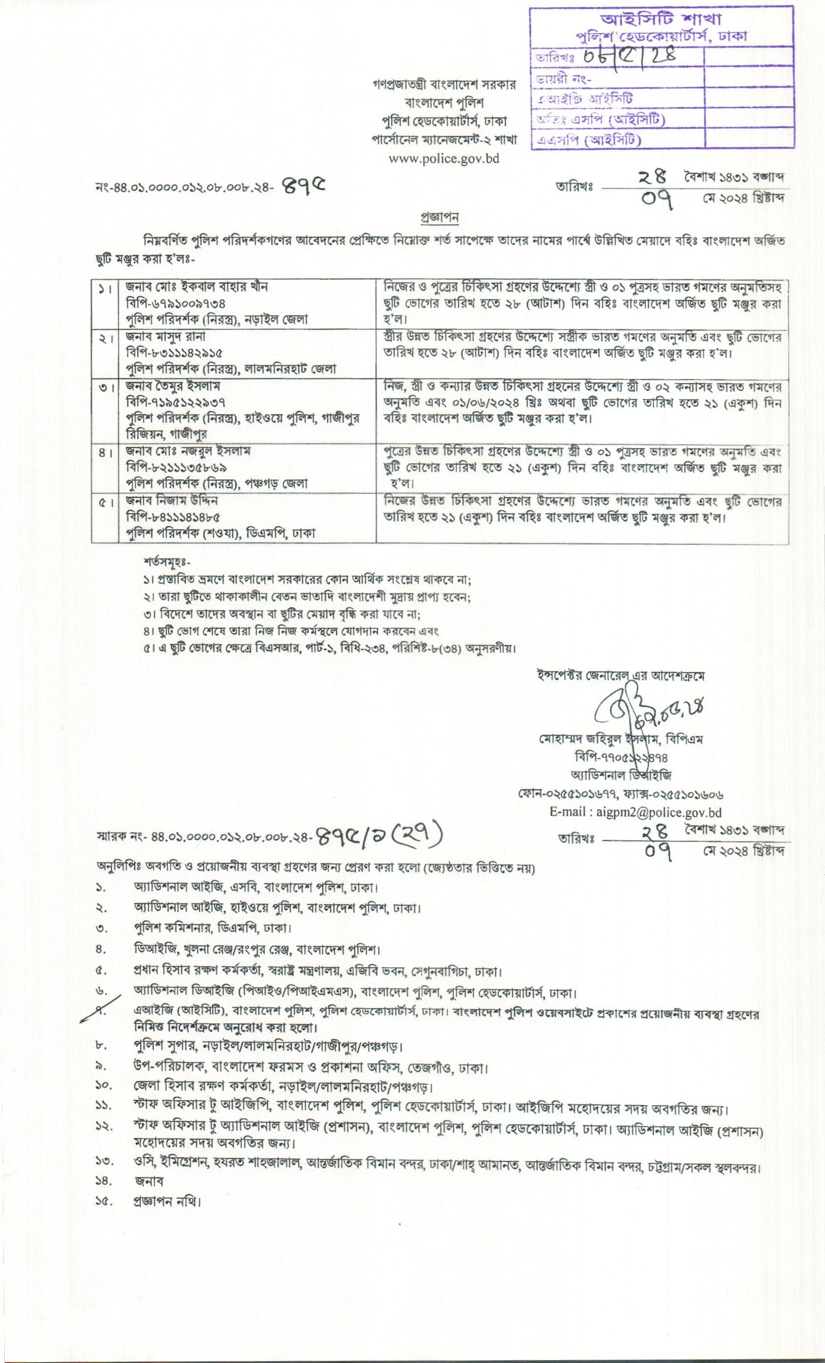 বহিঃ বাংলাদেশ ছুটি, বিজ্ঞপ্তি নং- ১২৯৪ , তারিখঃ ০৮/০৫/২০২৪ খ্রিঃ।