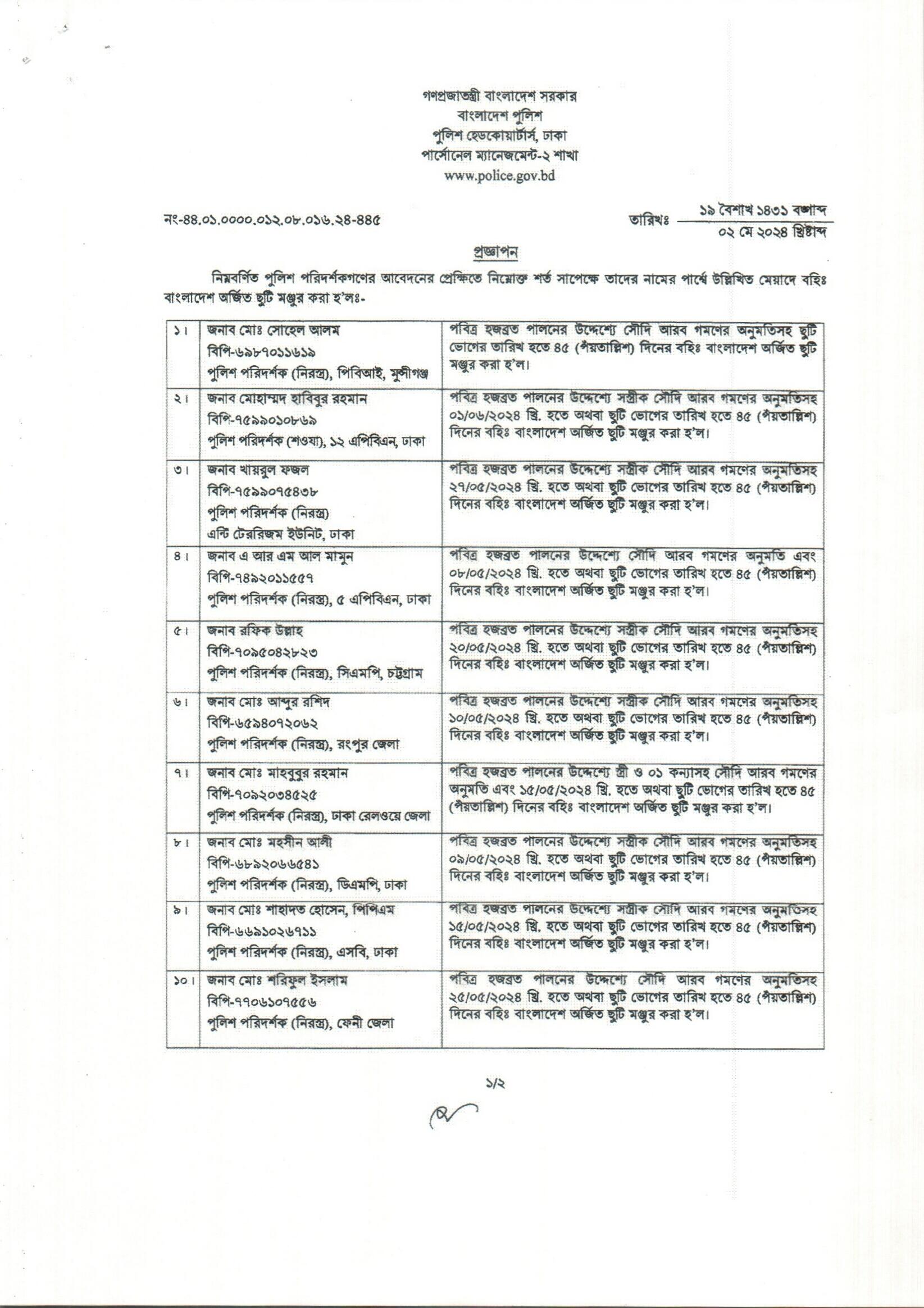 বহিঃ বাংলাদেশ ছুটি(হজ্ব), প্রজ্ঞাপন নং-৪৪৫(পৃ-১), তারিখঃ ০২/০৫/২০২৪ খ্রিঃ।