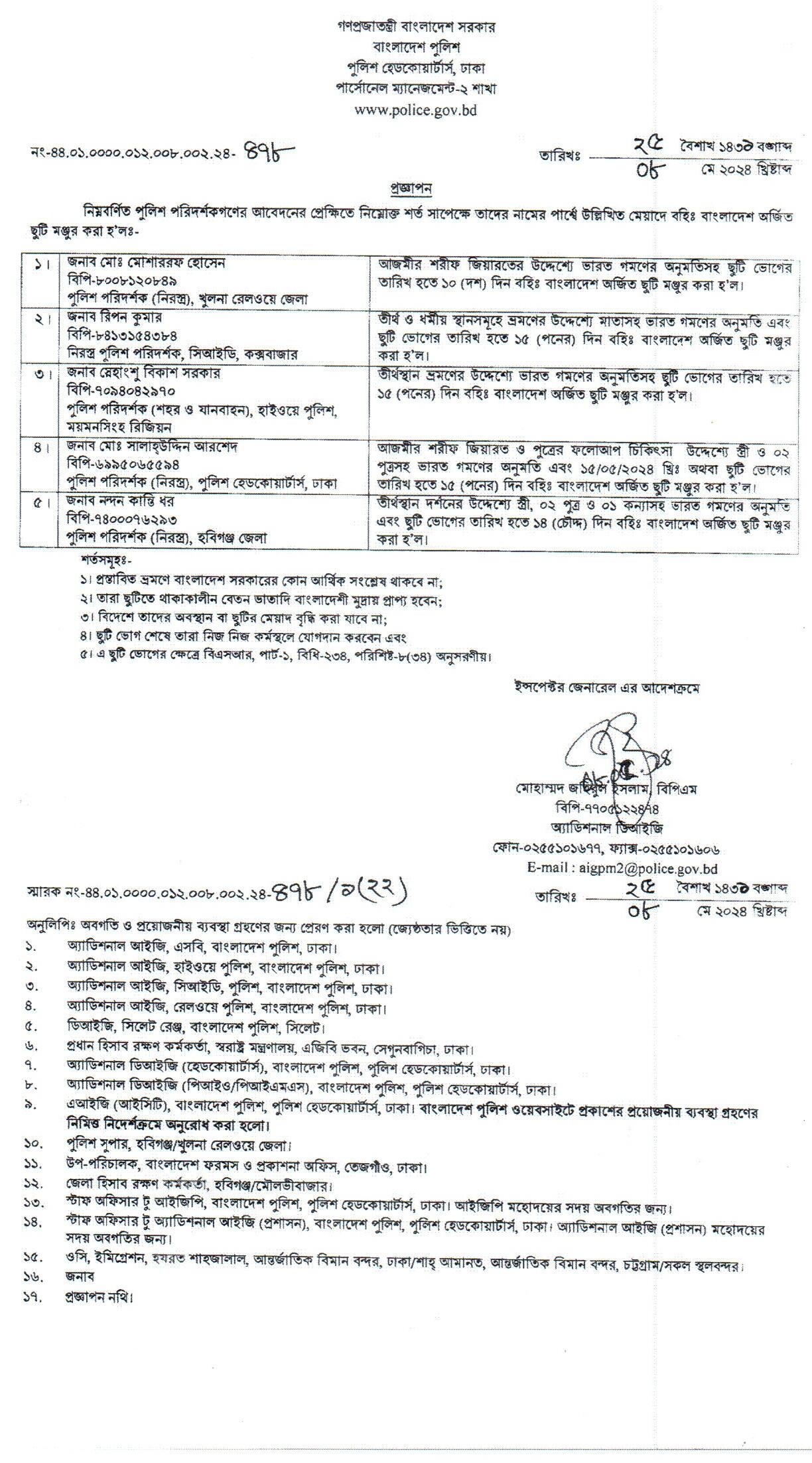 বহিঃ বাংলাদেশ ছুটি, বিজ্ঞপ্তি নং- ১২৮১ , তারিখঃ ০৬/০৫/২০২৪ খ্রিঃ।