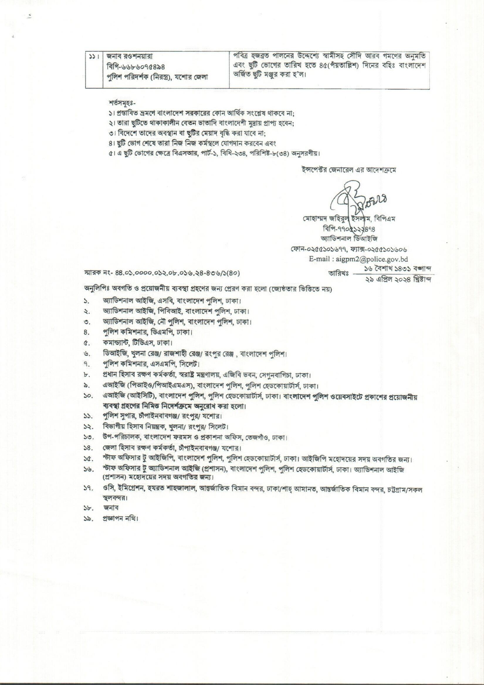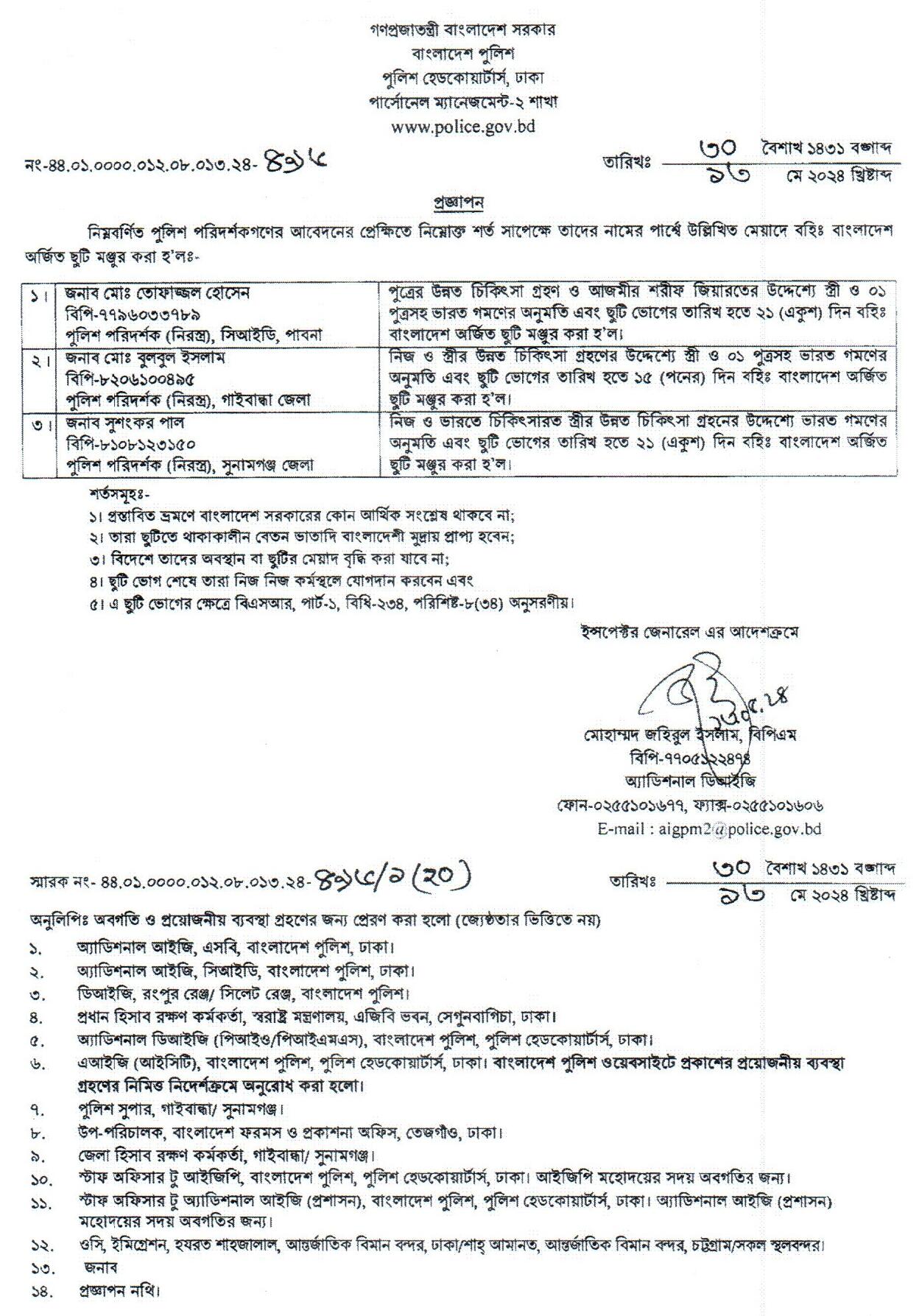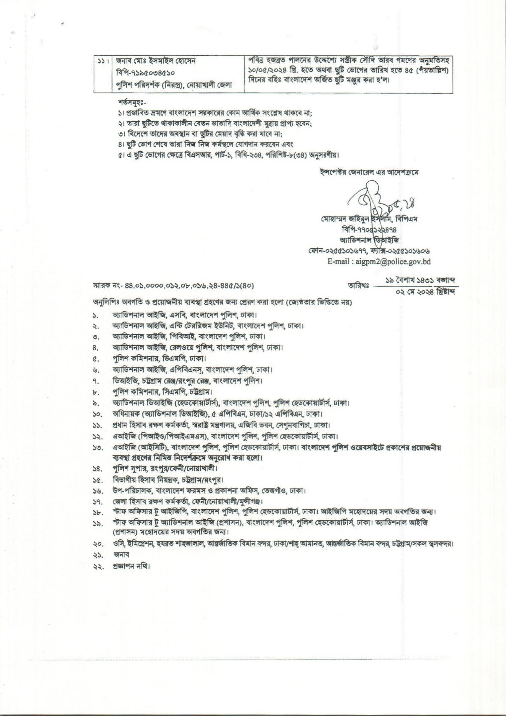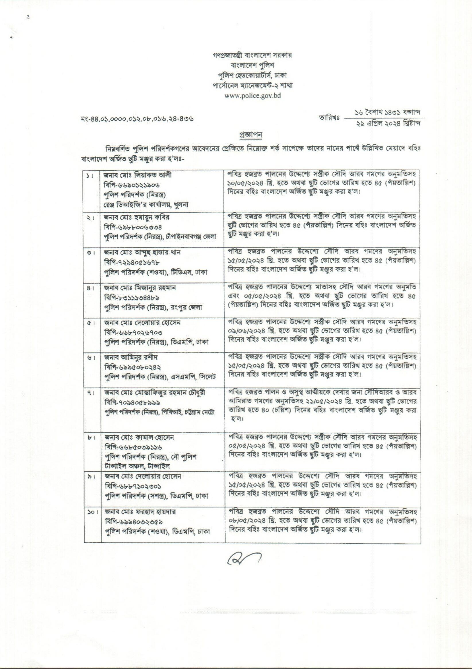 বহিঃ বাংলাদেশ ছুটি(হজ্ব), প্রজ্ঞাপন নং-৪৩৯(পৃ-১), তারিখঃ ৩০/০৪/২০২৪ খ্রিঃ।