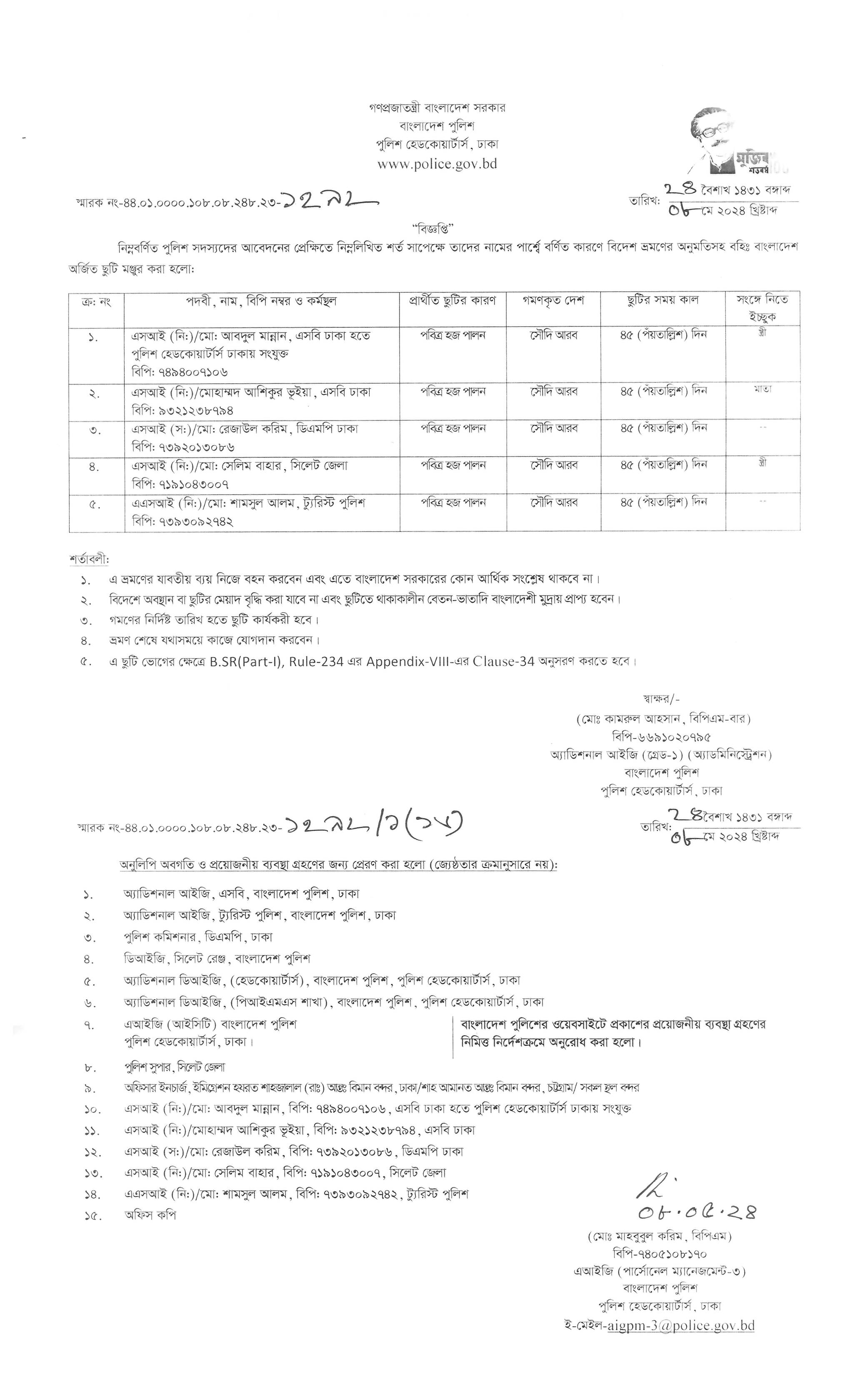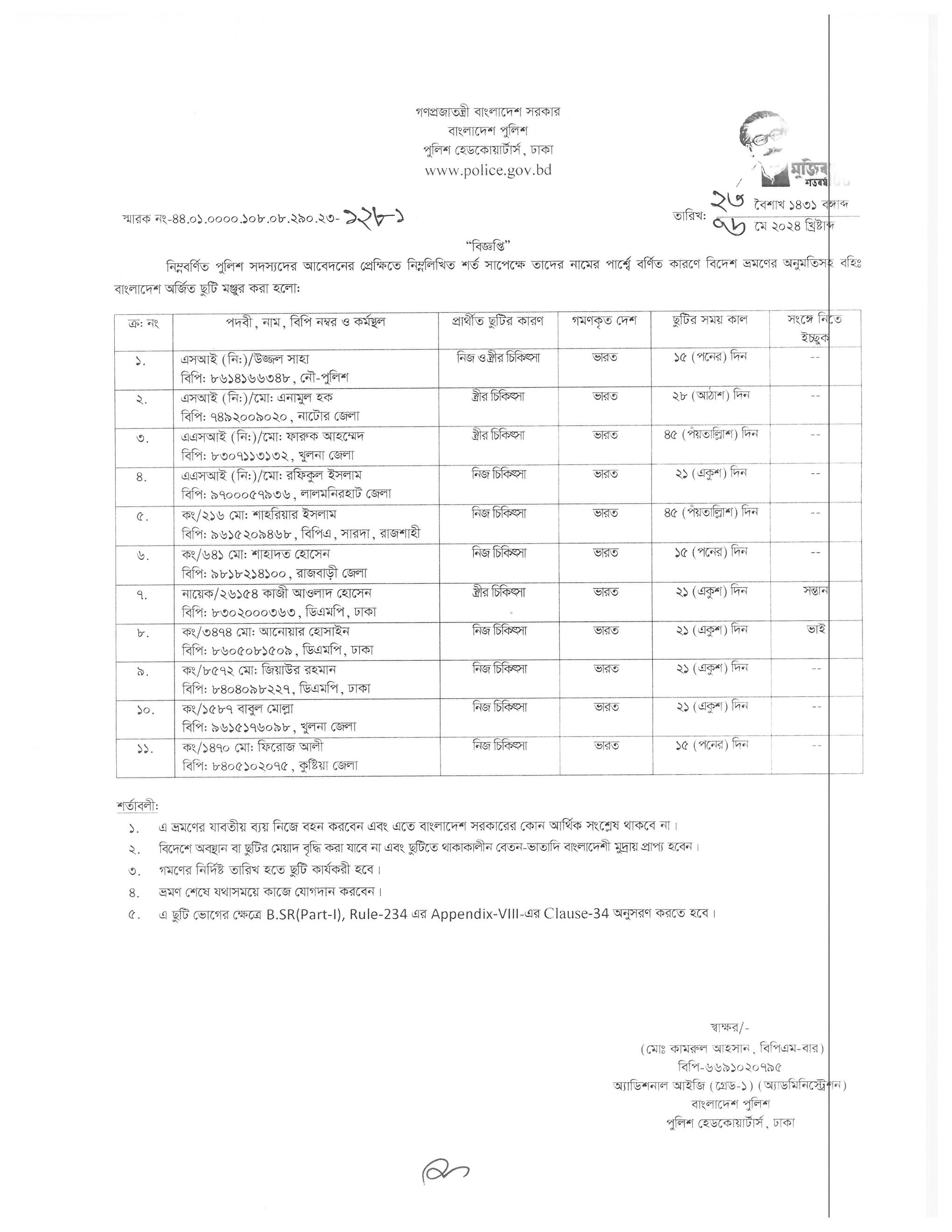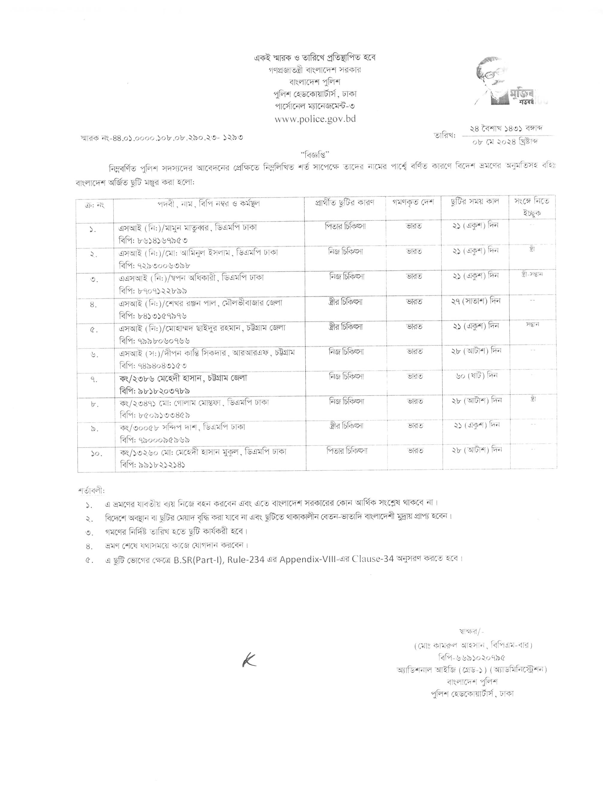 বহিঃ বাংলাদেশ গমন, বিজ্ঞপ্তি নং- ১৩৩২ , তারিখঃ ১৩/০৫/২০২৪ খ্রিঃ।