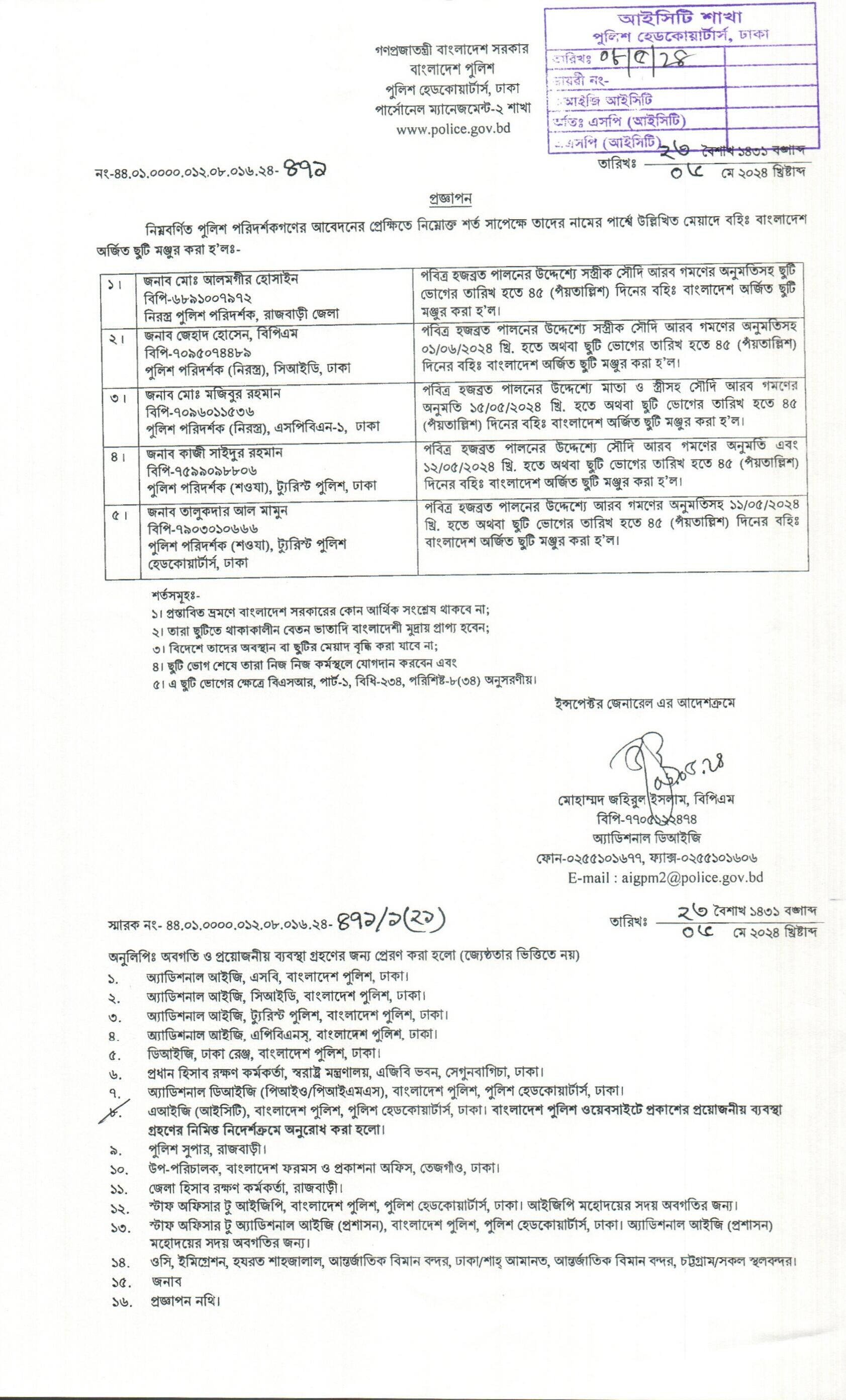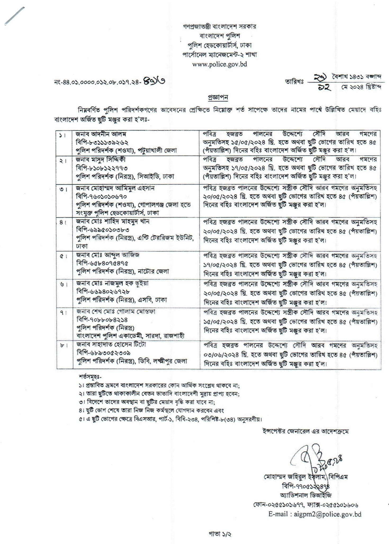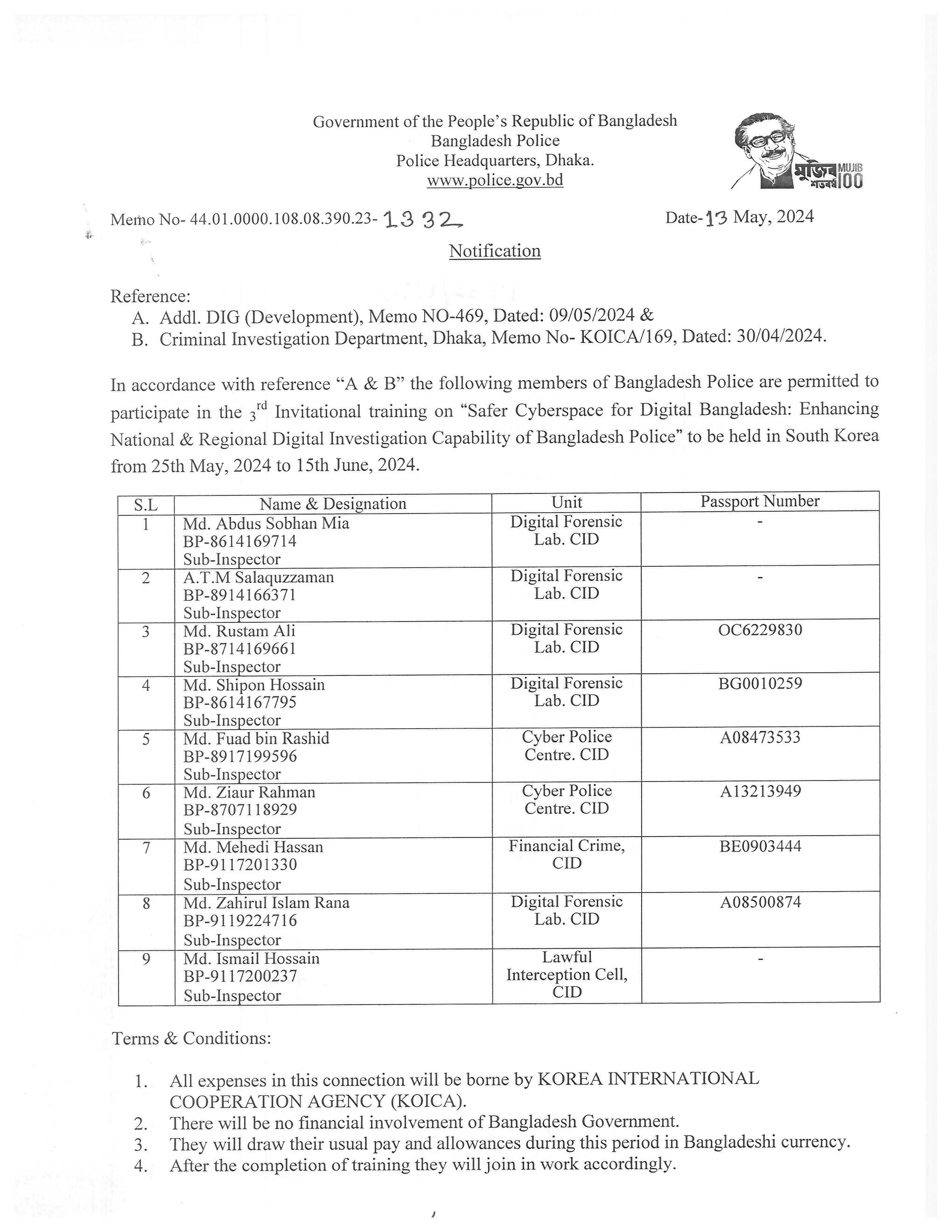 বহিঃ বাংলাদেশ গমন, বিজ্ঞপ্তি নং- ১৩৩২ , তারিখঃ ১৩/০৫/২০২৪ খ্রিঃ।