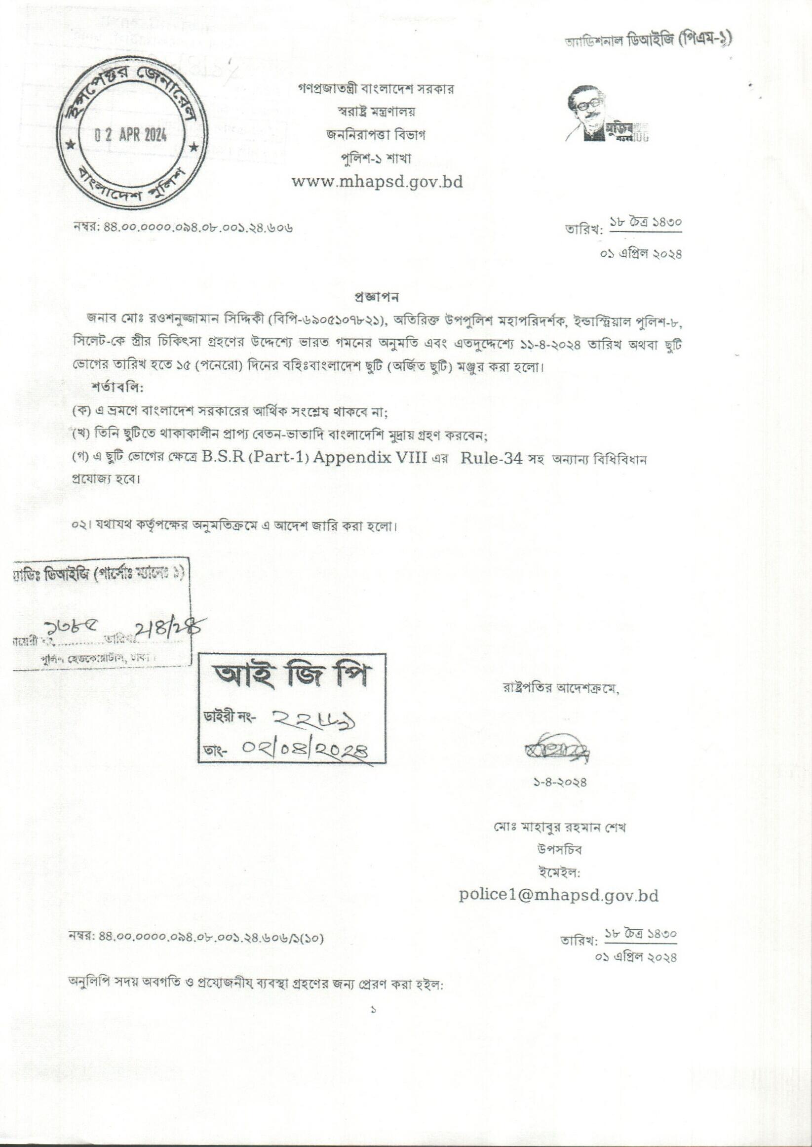 বহিঃ বাংলাদেশ ছুটি, প্রজ্ঞাপন নং- ৬১১, তারিখঃ ০২/০৪/২০২৪ খ্রিঃ।