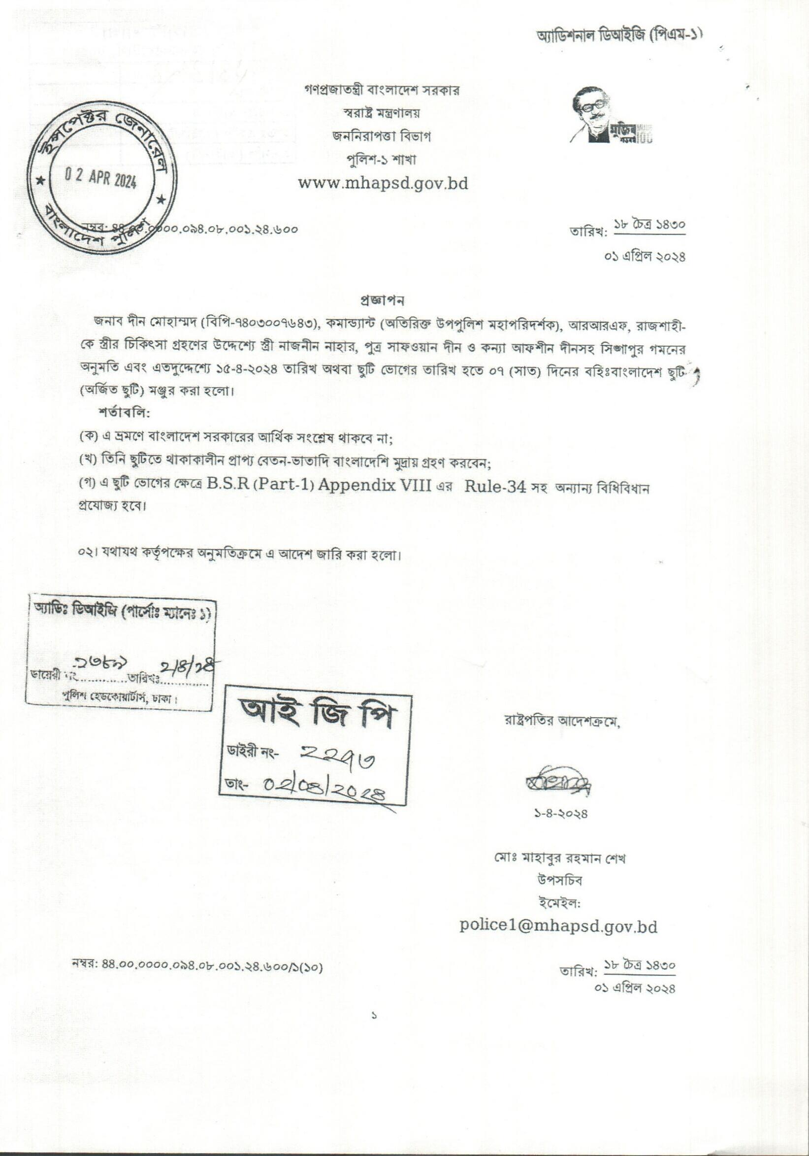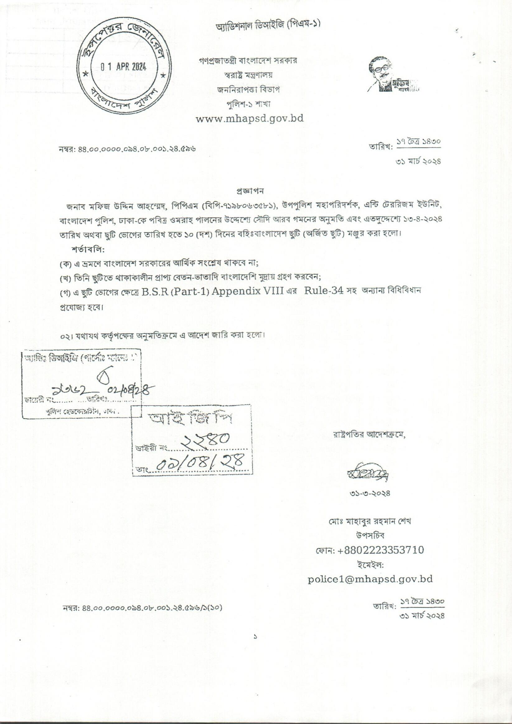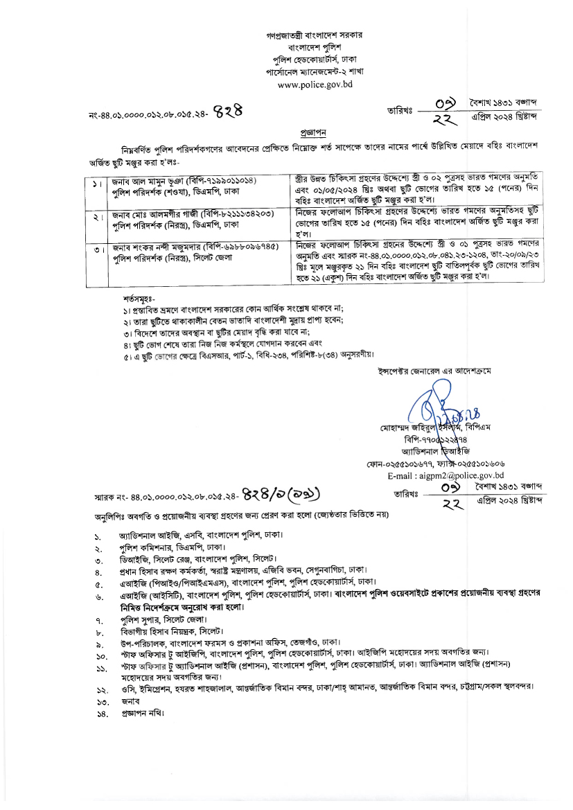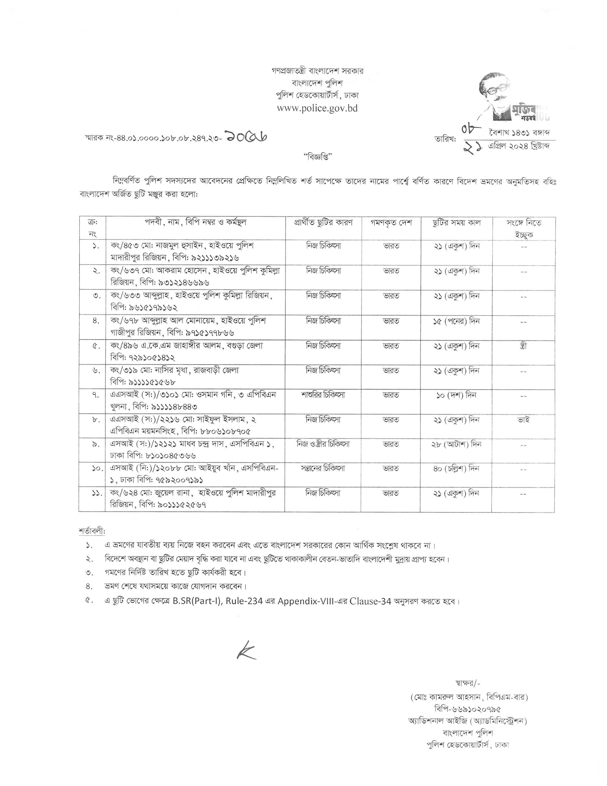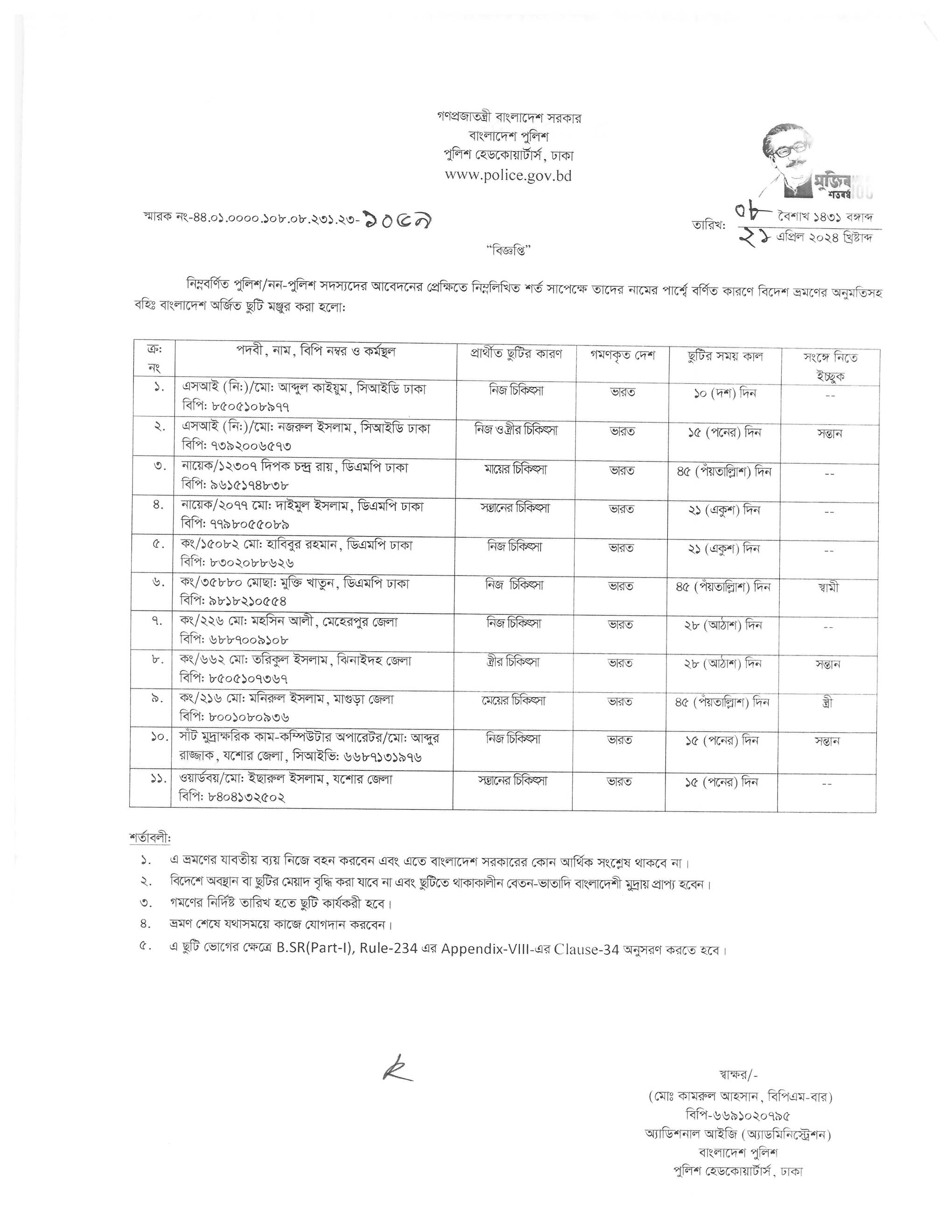 বহিঃ বাংলাদেশ ছুটি, বিজ্ঞপ্তি নং- ১০৫৯ , তারিখঃ ২১/০৪/২০২৪ খ্রিঃ।