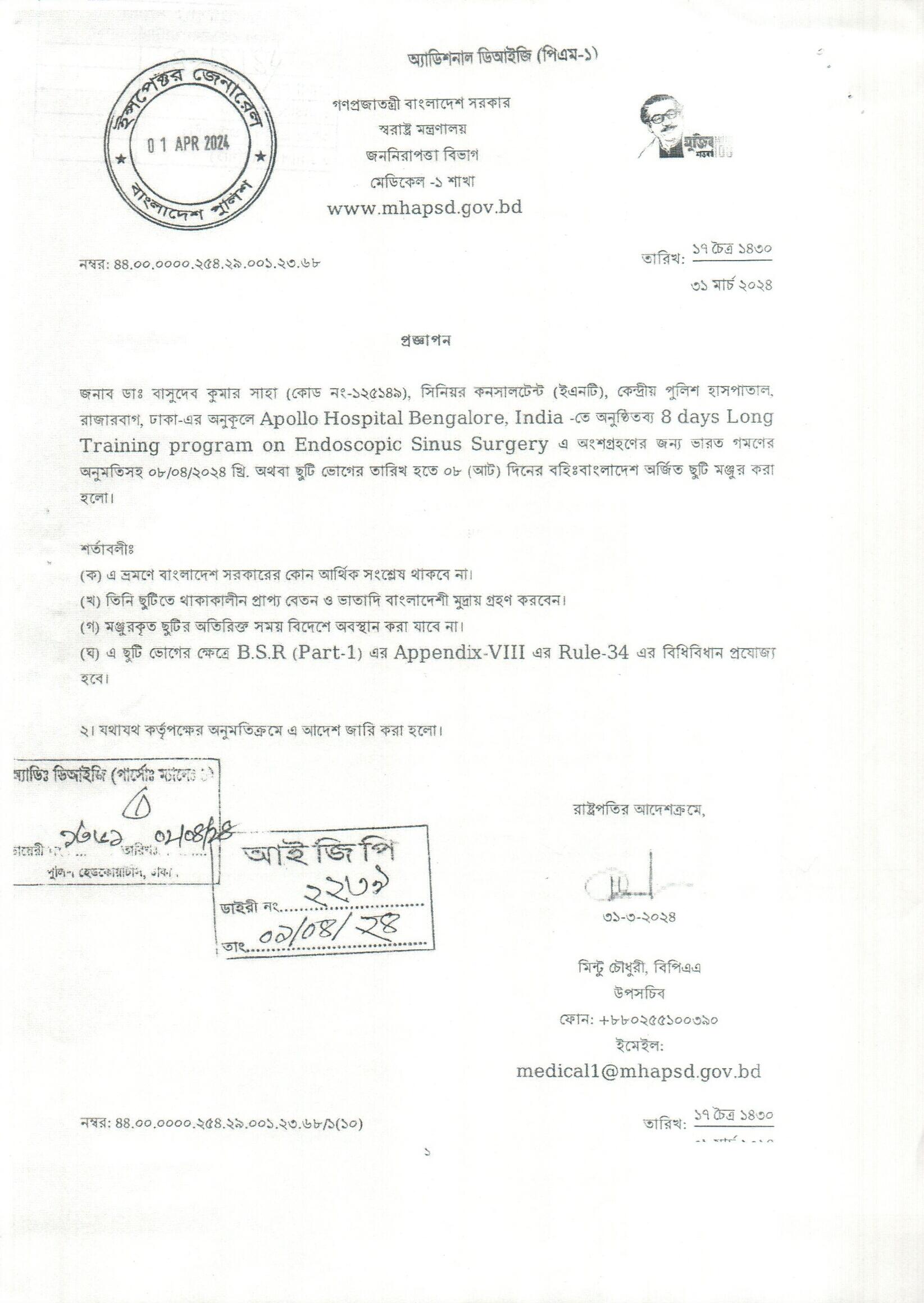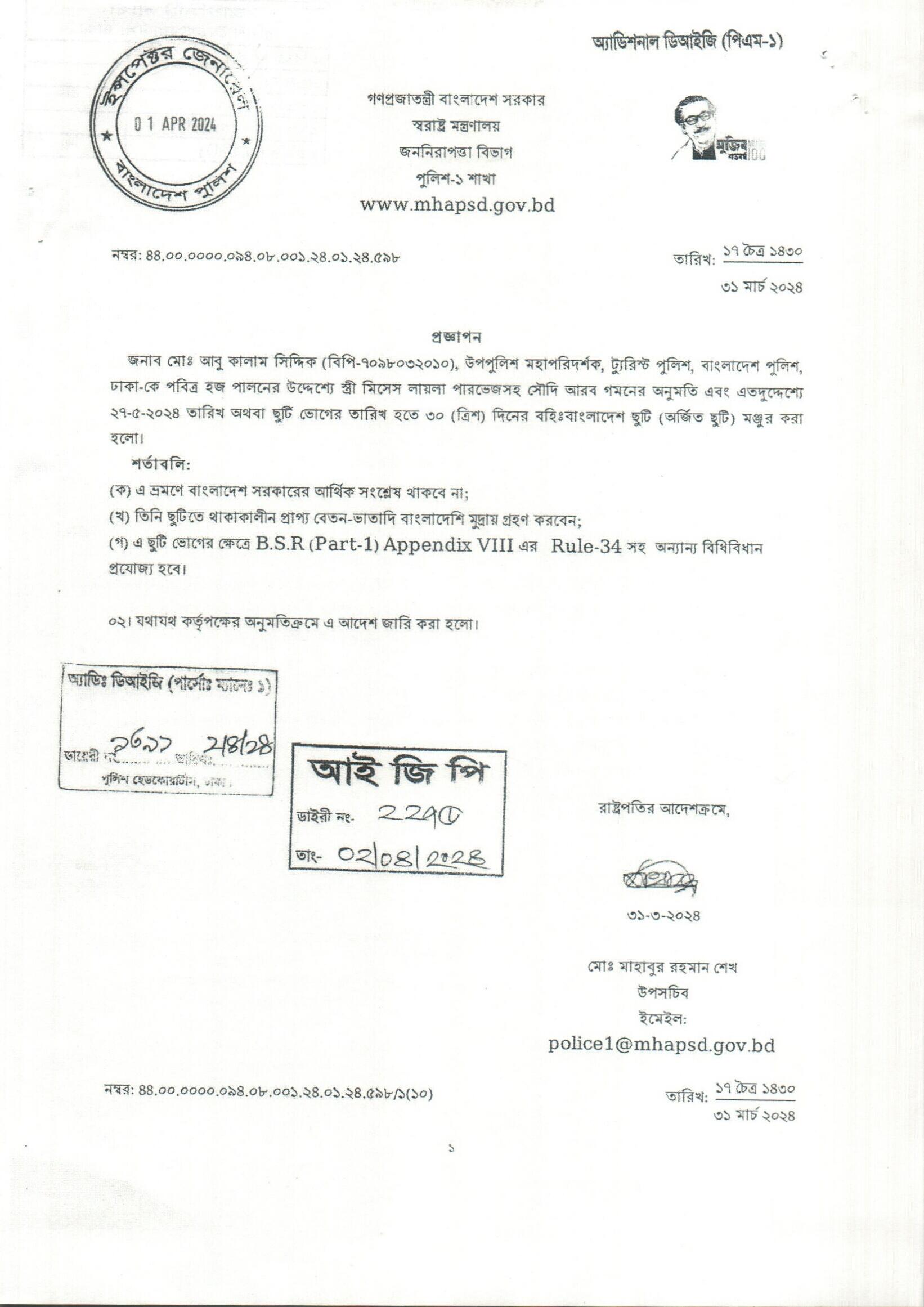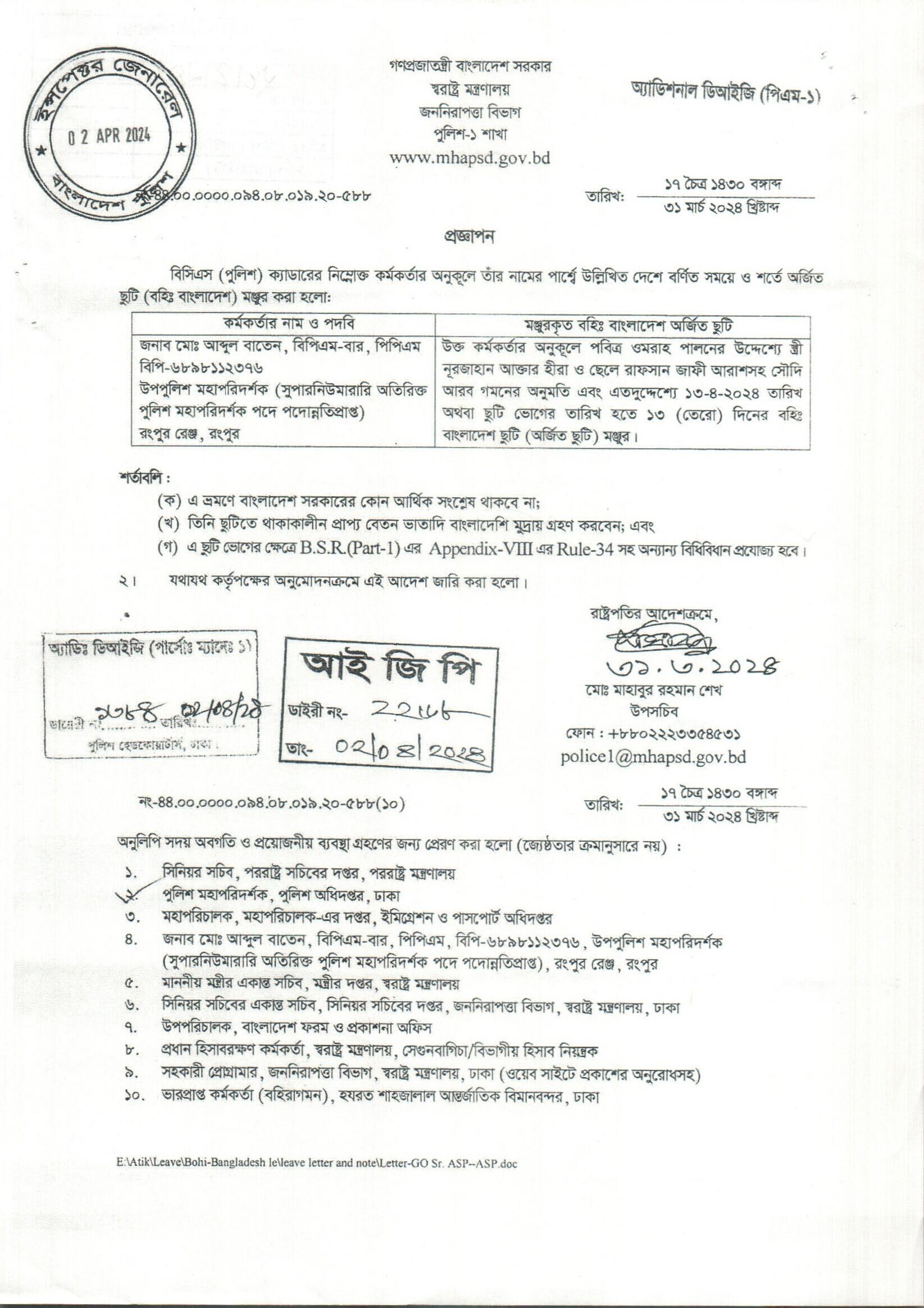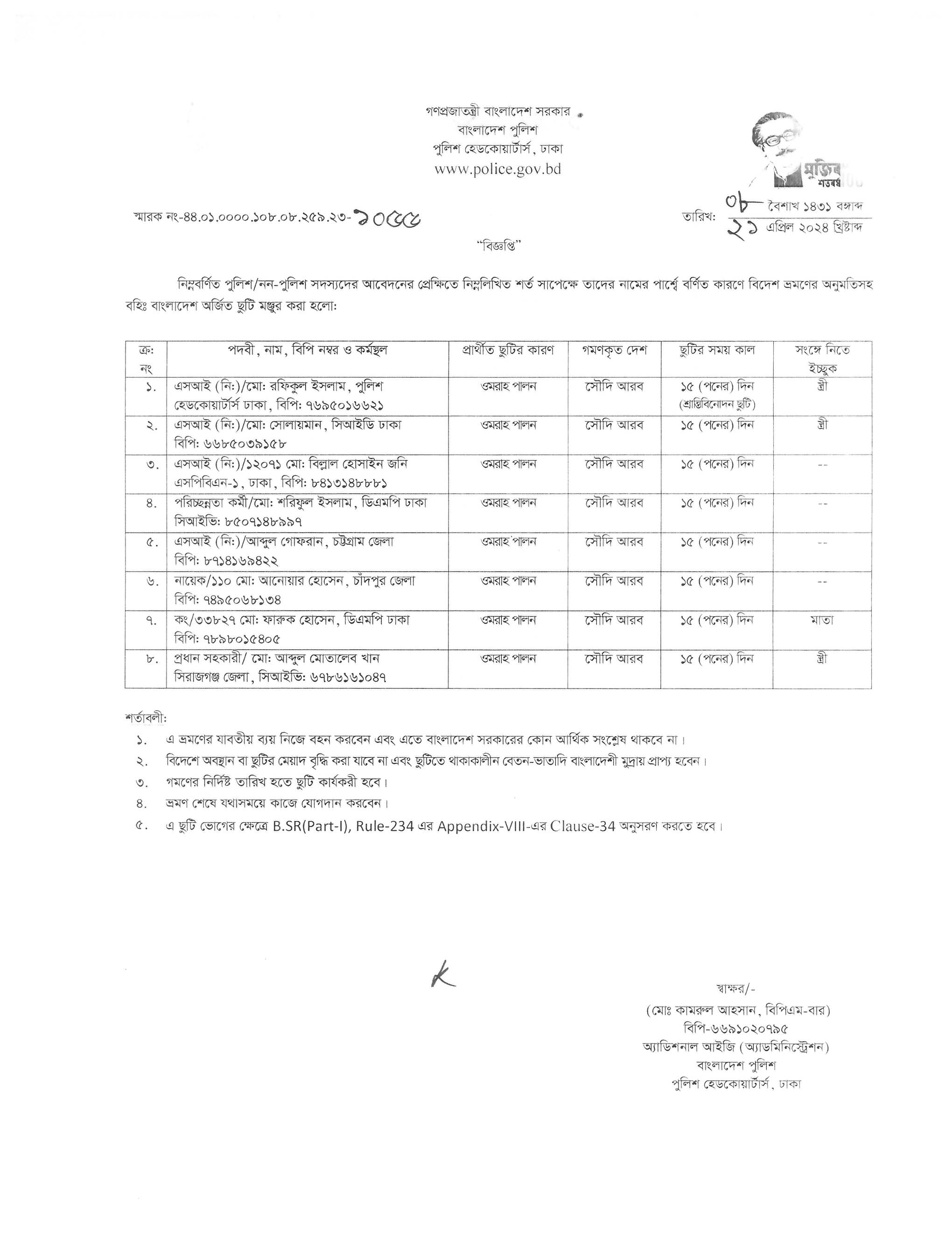 বহিঃ বাংলাদেশ ছুটি, বিজ্ঞপ্তি নং- ১০৫৫ , তারিখঃ ২১/০৪/২০২৪ খ্রিঃ।