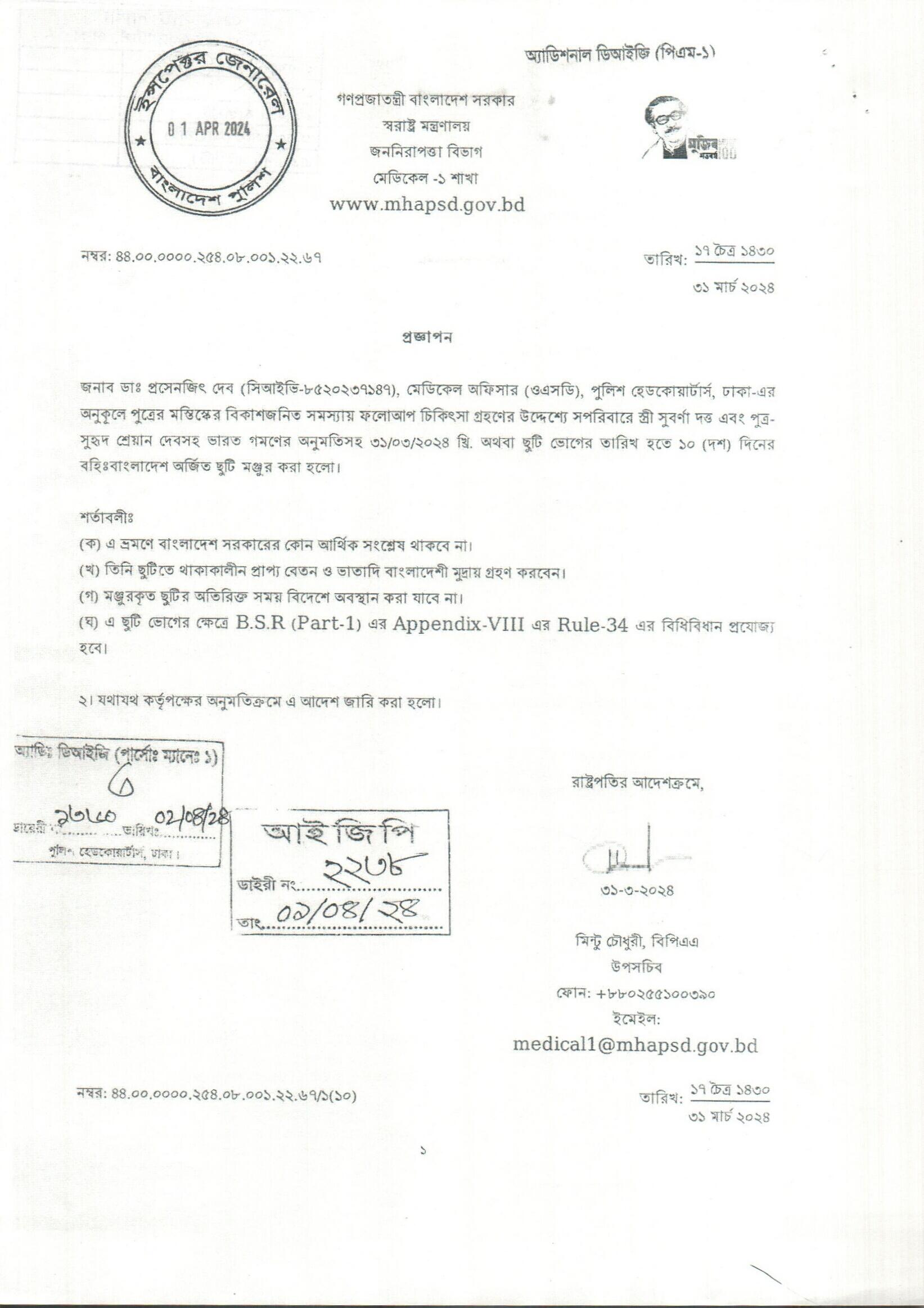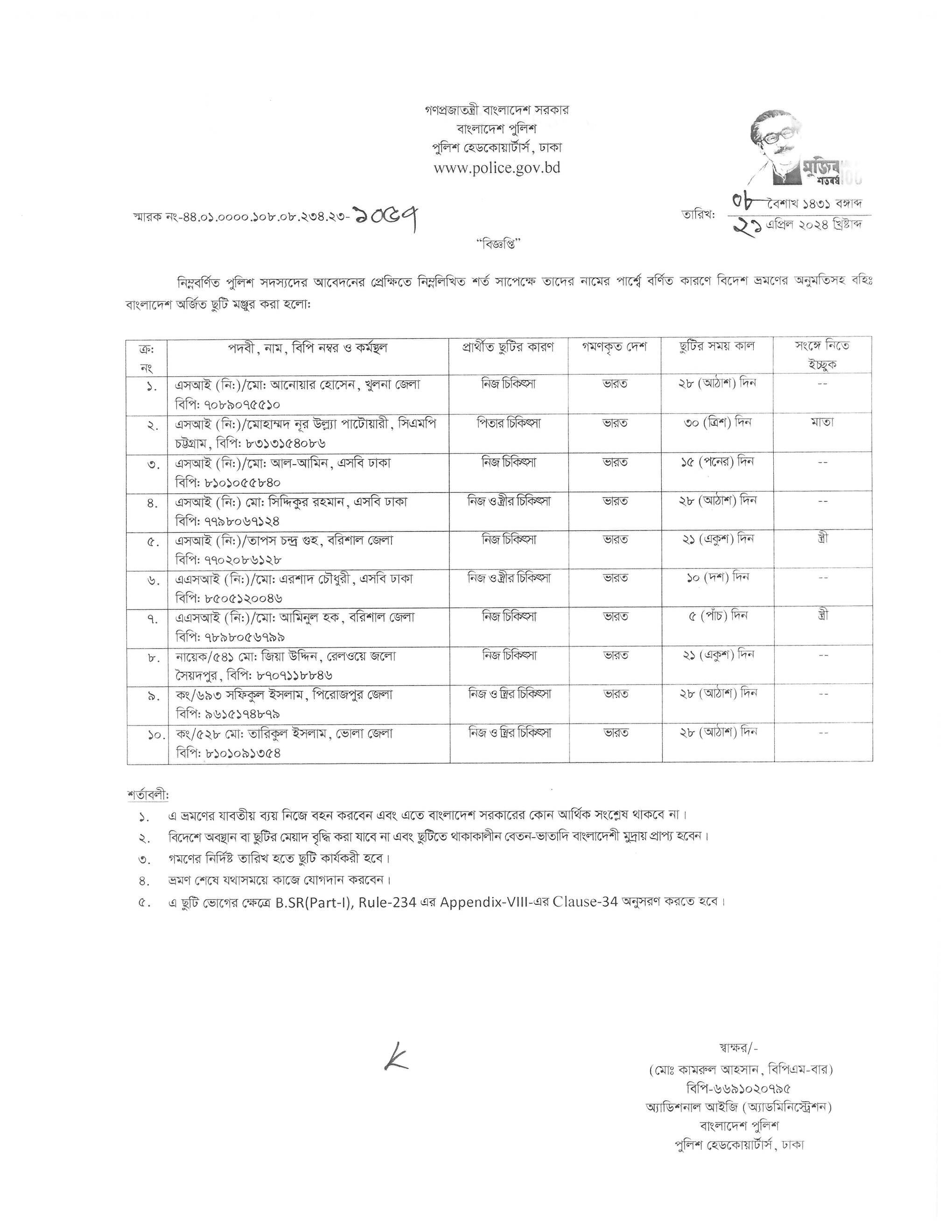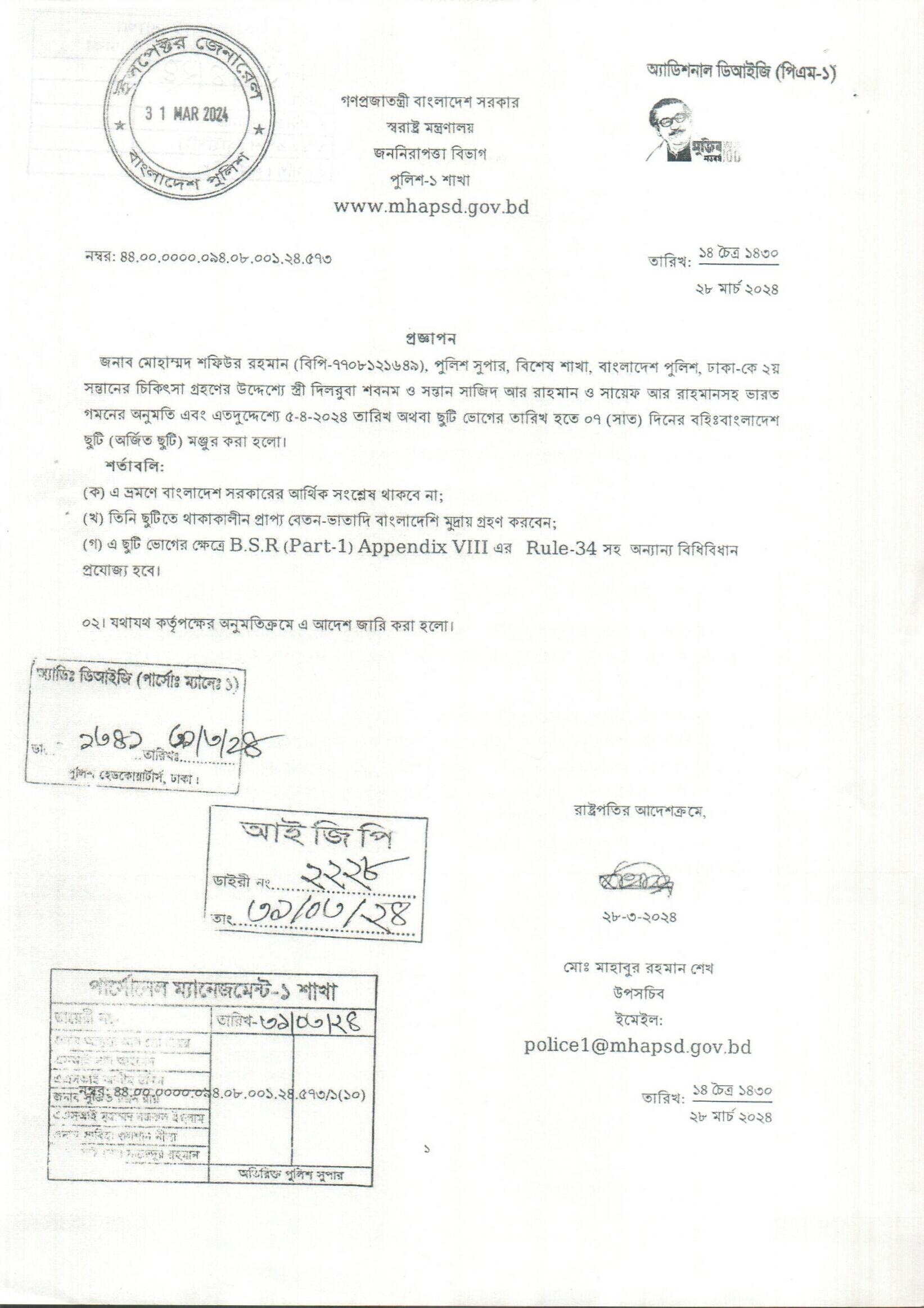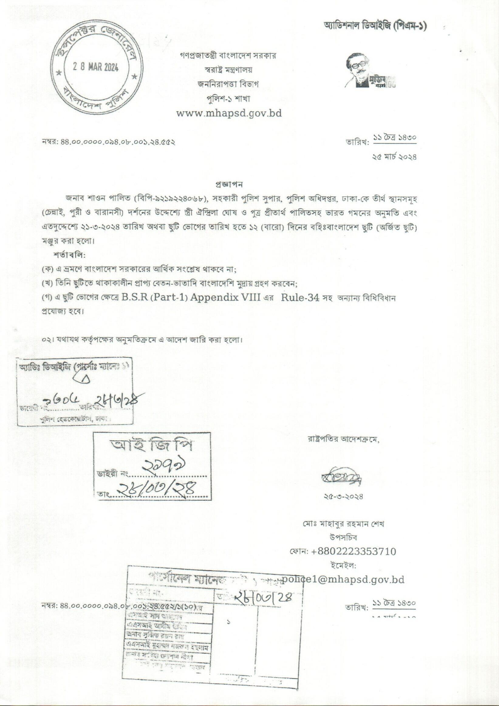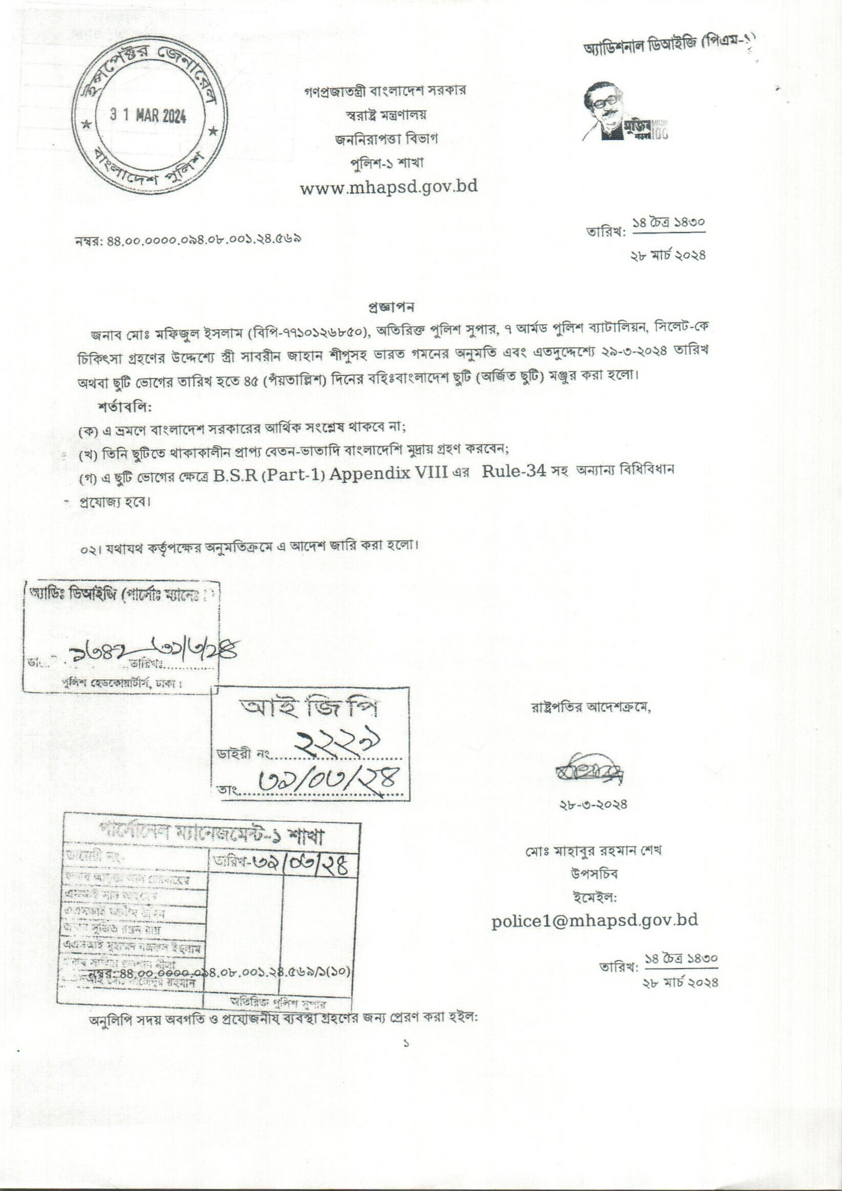 বহিঃ বাংলাদেশ ছুটি, প্রজ্ঞাপন নং- ৫৫৫, তারিখঃ ২৫/০৩/২০২৪ খ্রিঃ।