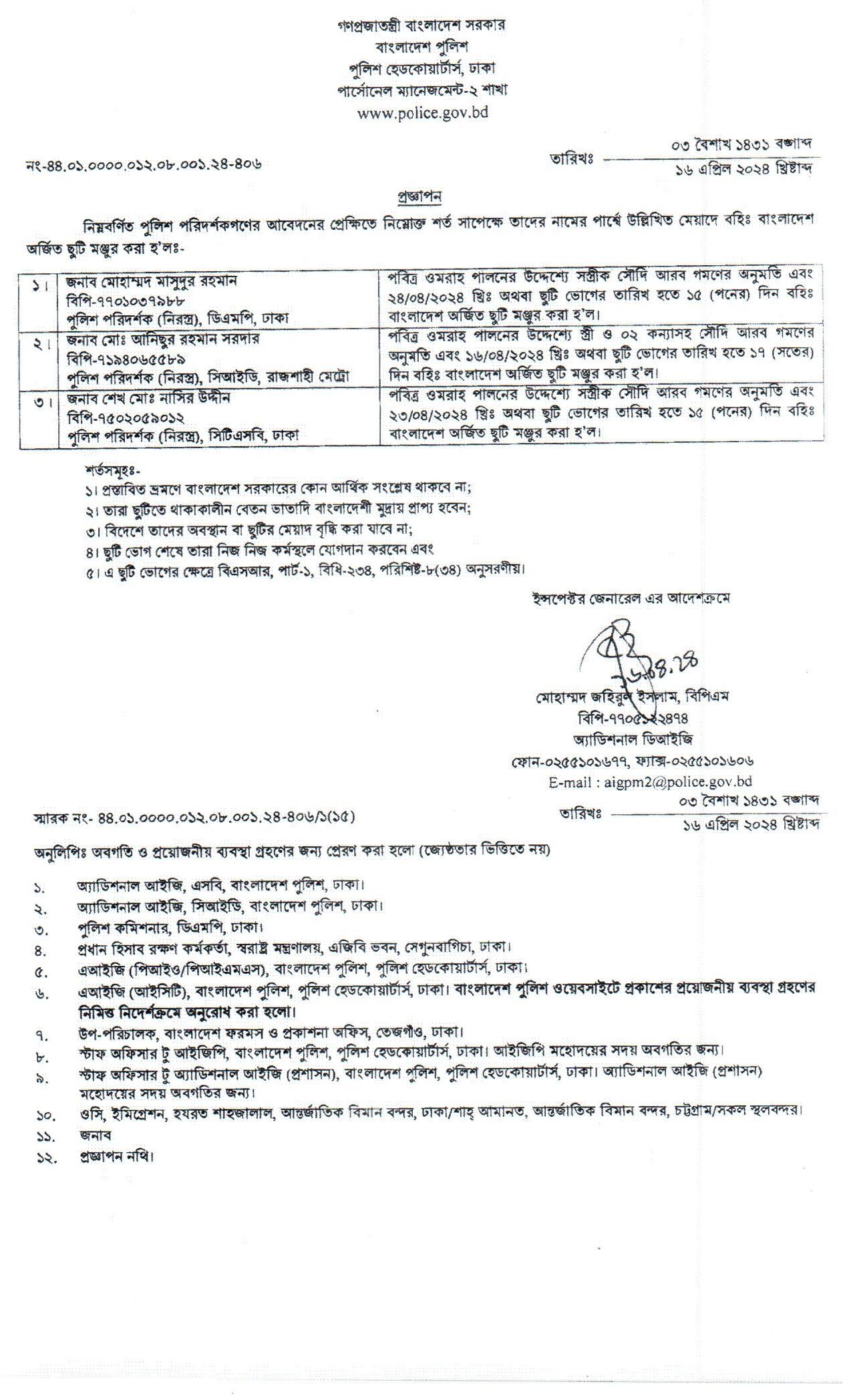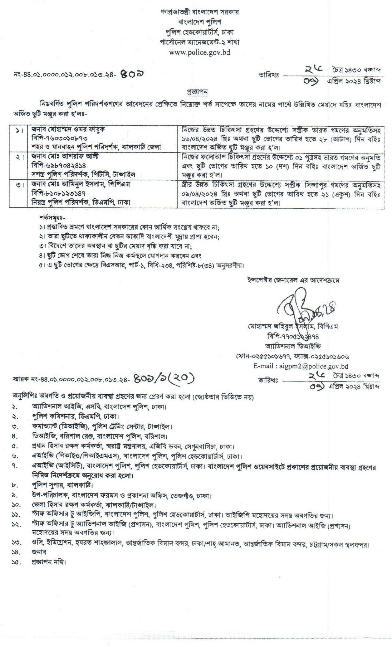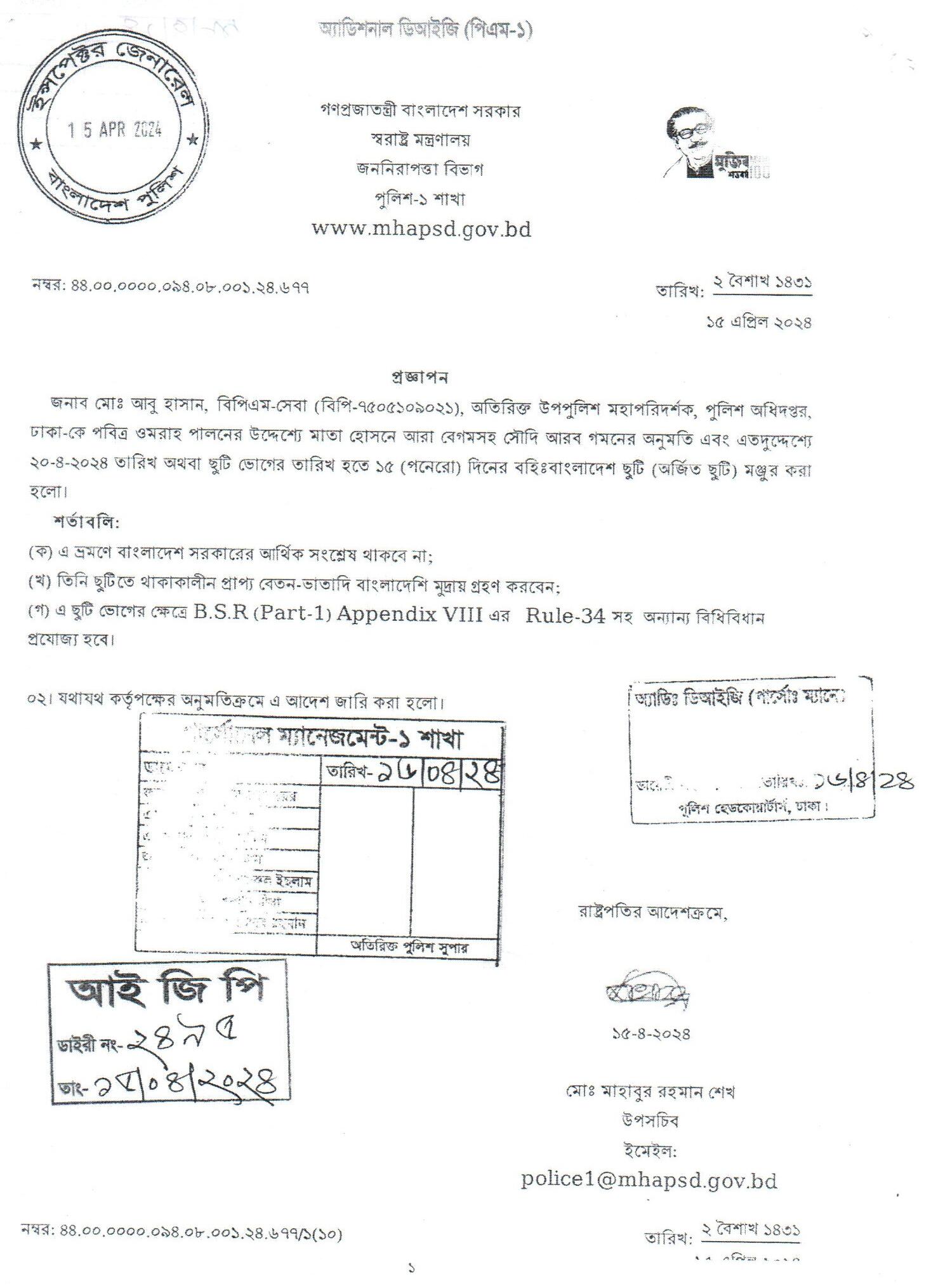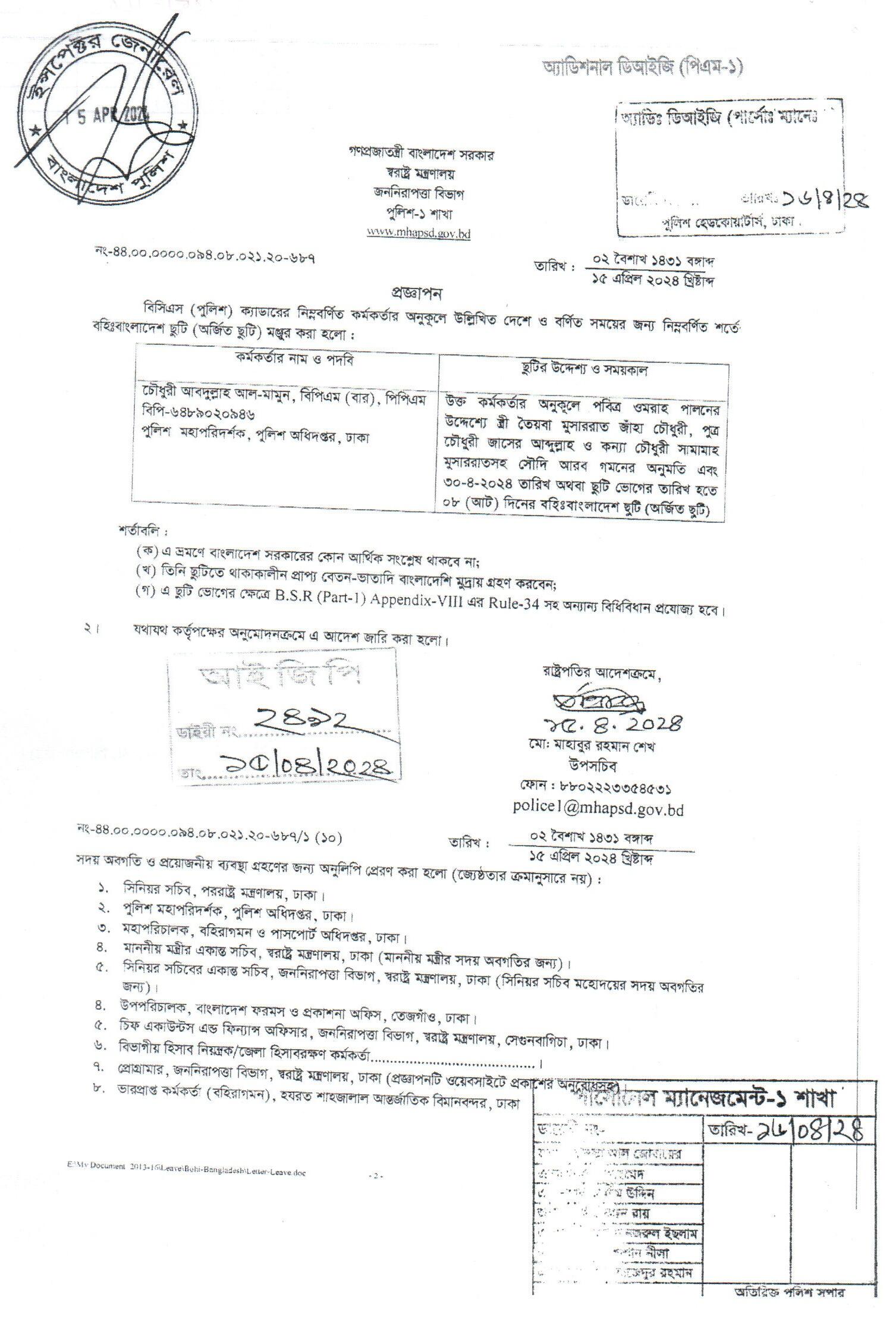 বহিঃ বাংলাদেশ ছুটি, বিজ্ঞপ্তি নং- ১০২৮ , তারিখঃ ১৭/০৪/২০২৪ খ্রিঃ।