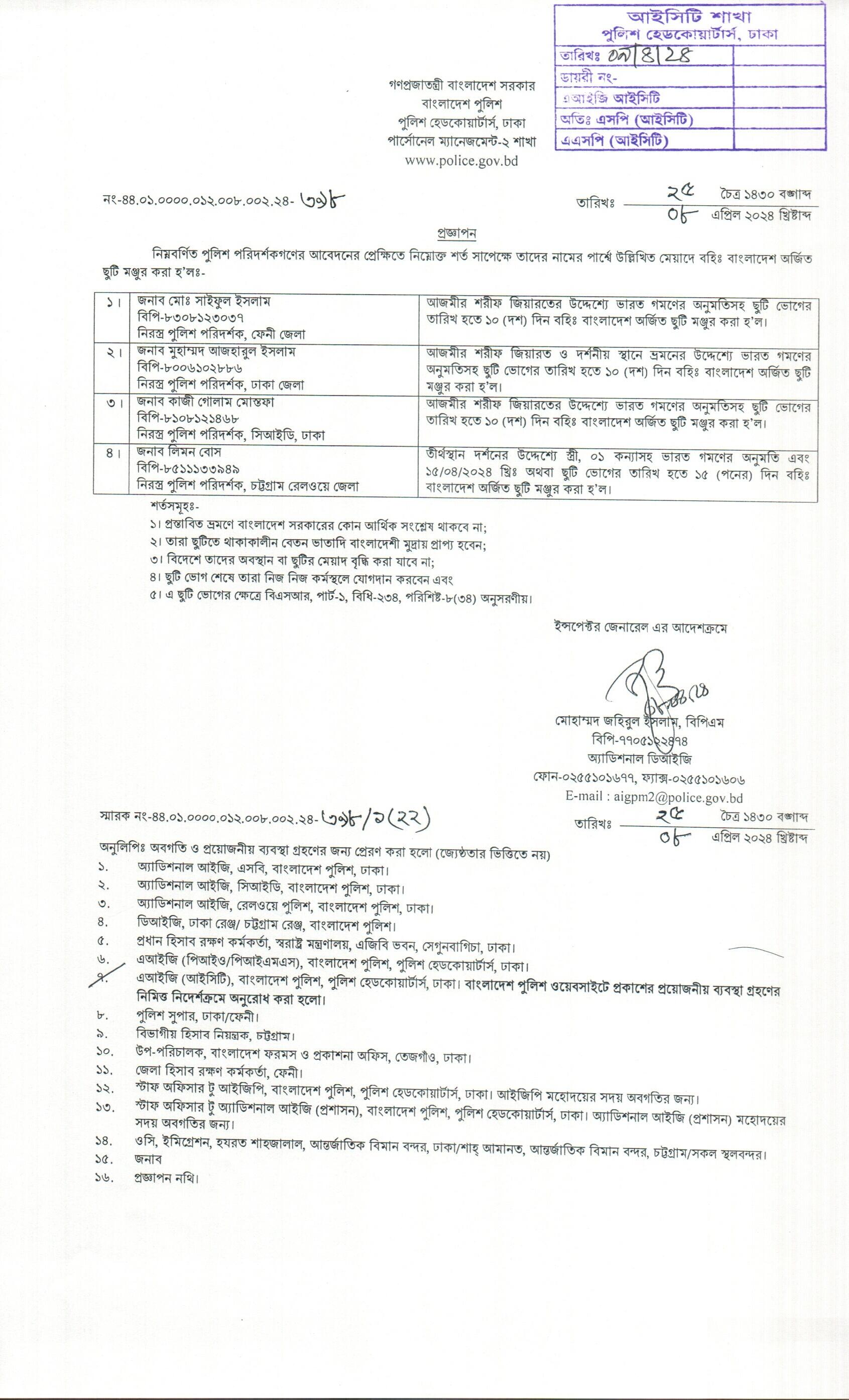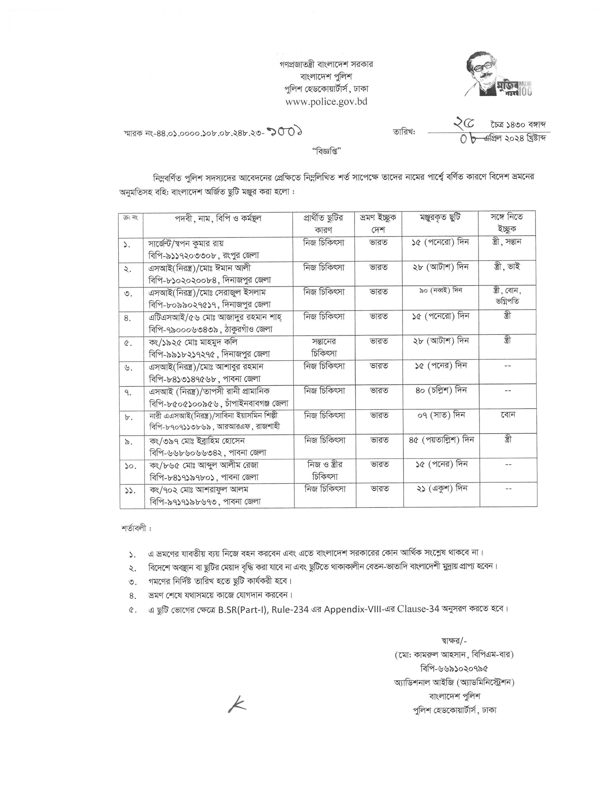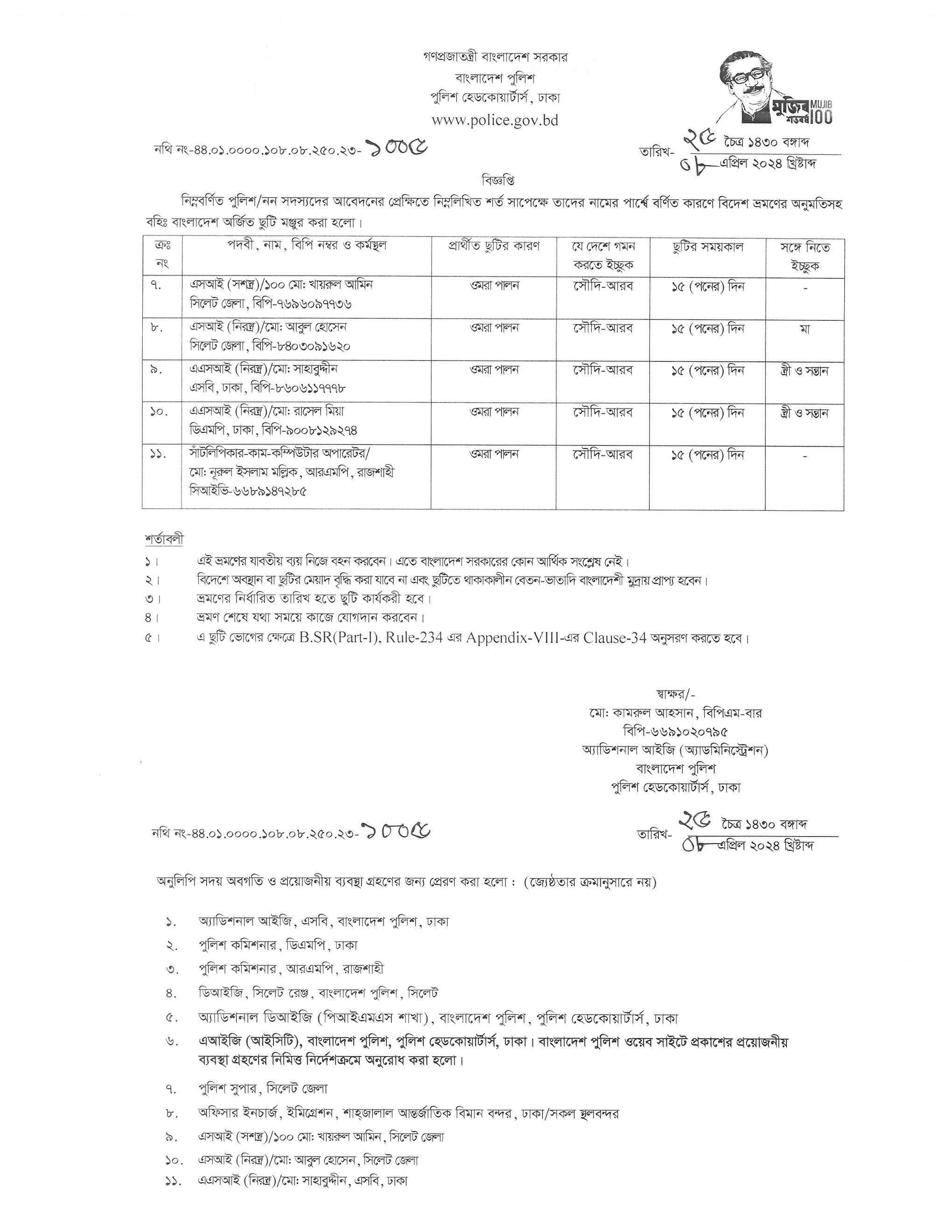 বহিঃ বাংলাদেশ ছুটি, বিজ্ঞপ্তি নং- ১০০৩ , তারিখঃ ০৮/০৪/২০২৪ খ্রিঃ।