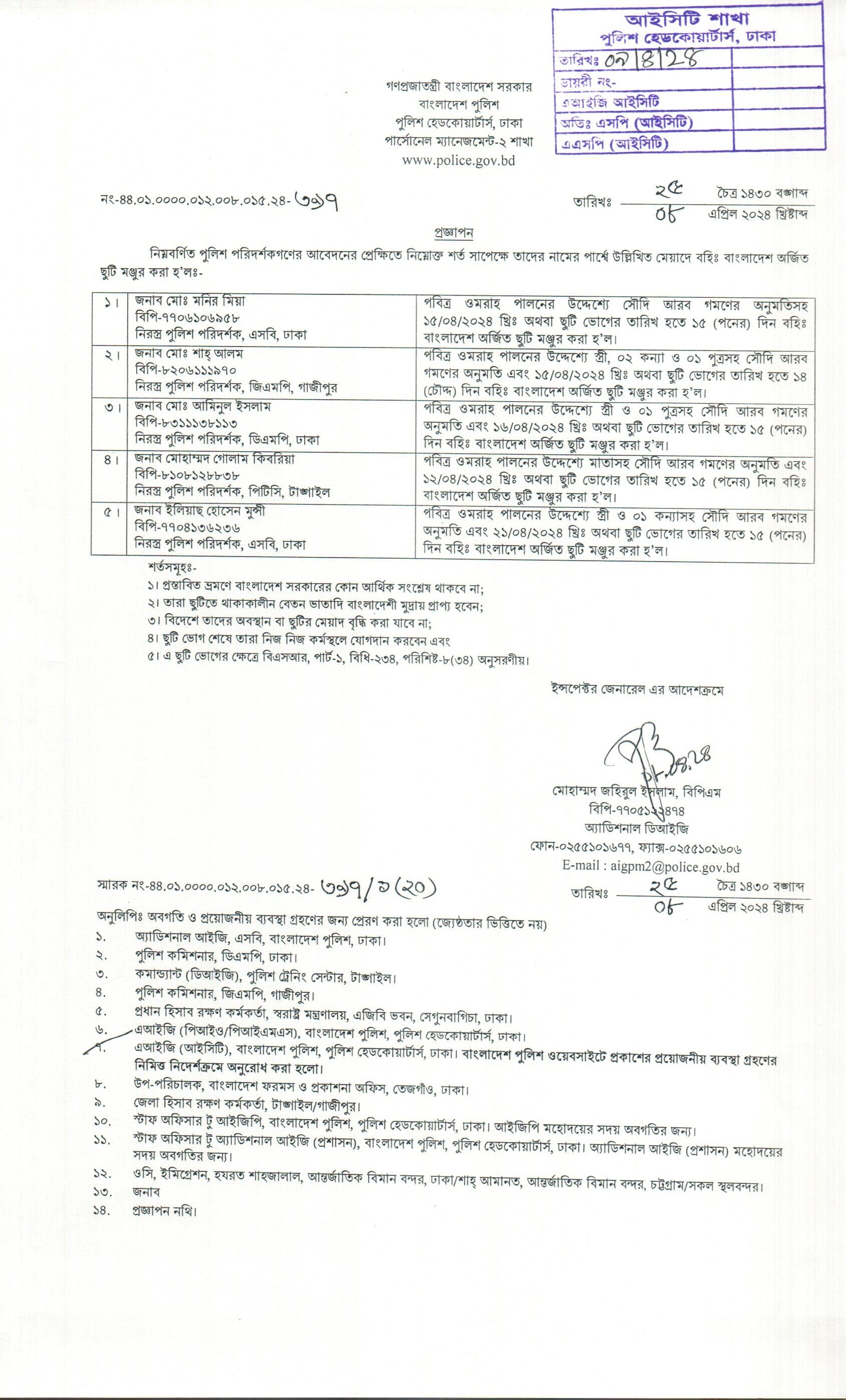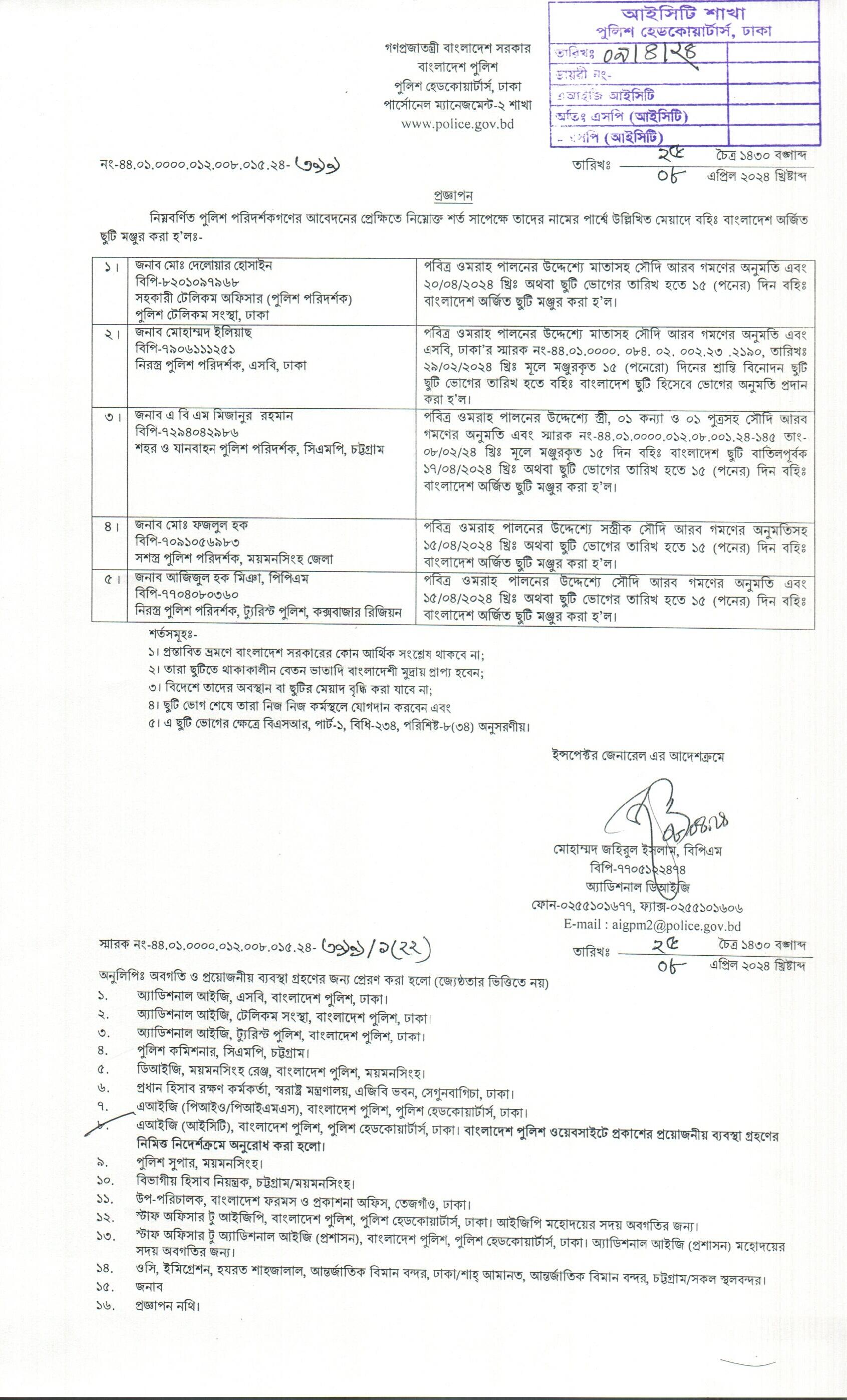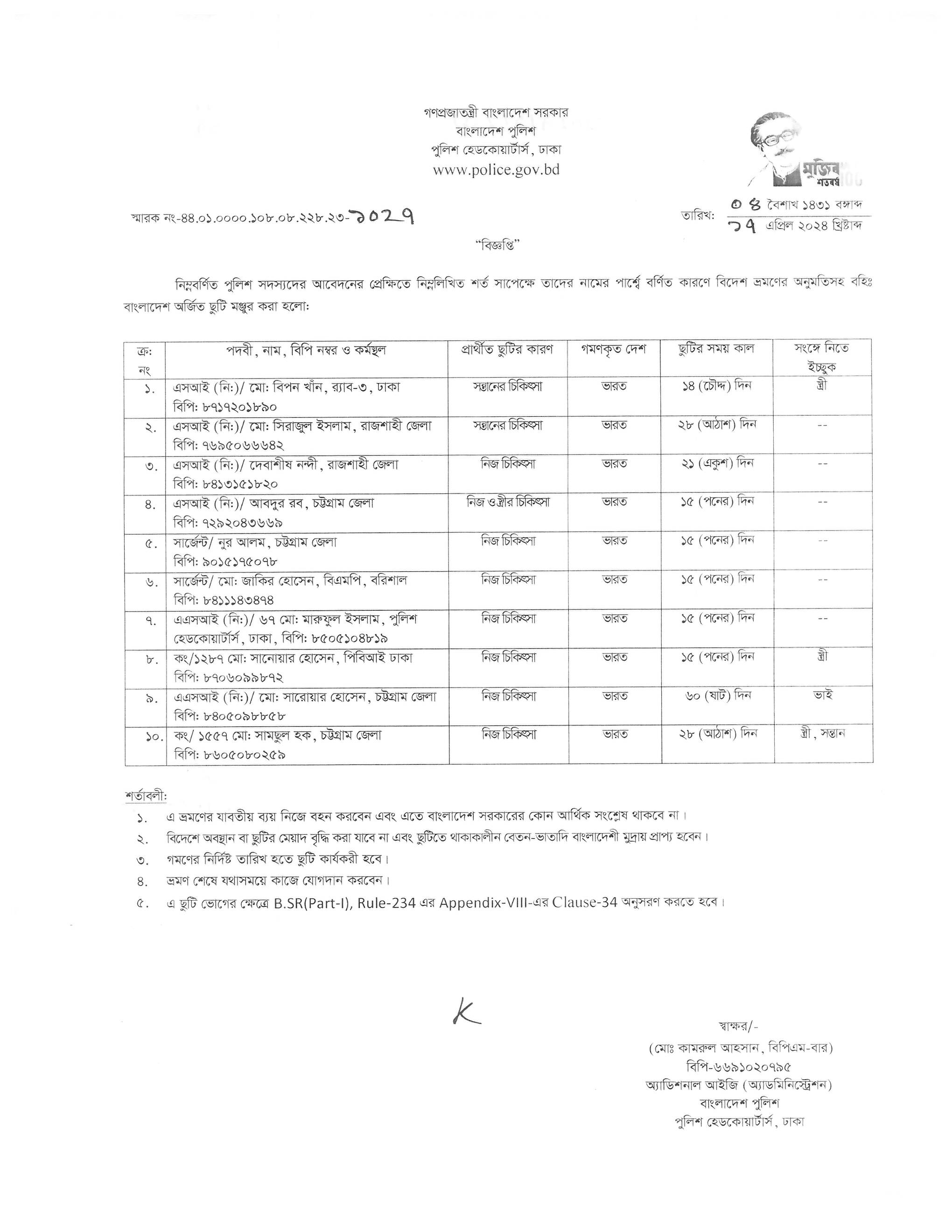 বহিঃ বাংলাদেশ ছুটি, বিজ্ঞপ্তি নং- ১০০৩ , তারিখঃ ০৮/০৪/২০২৪ খ্রিঃ।