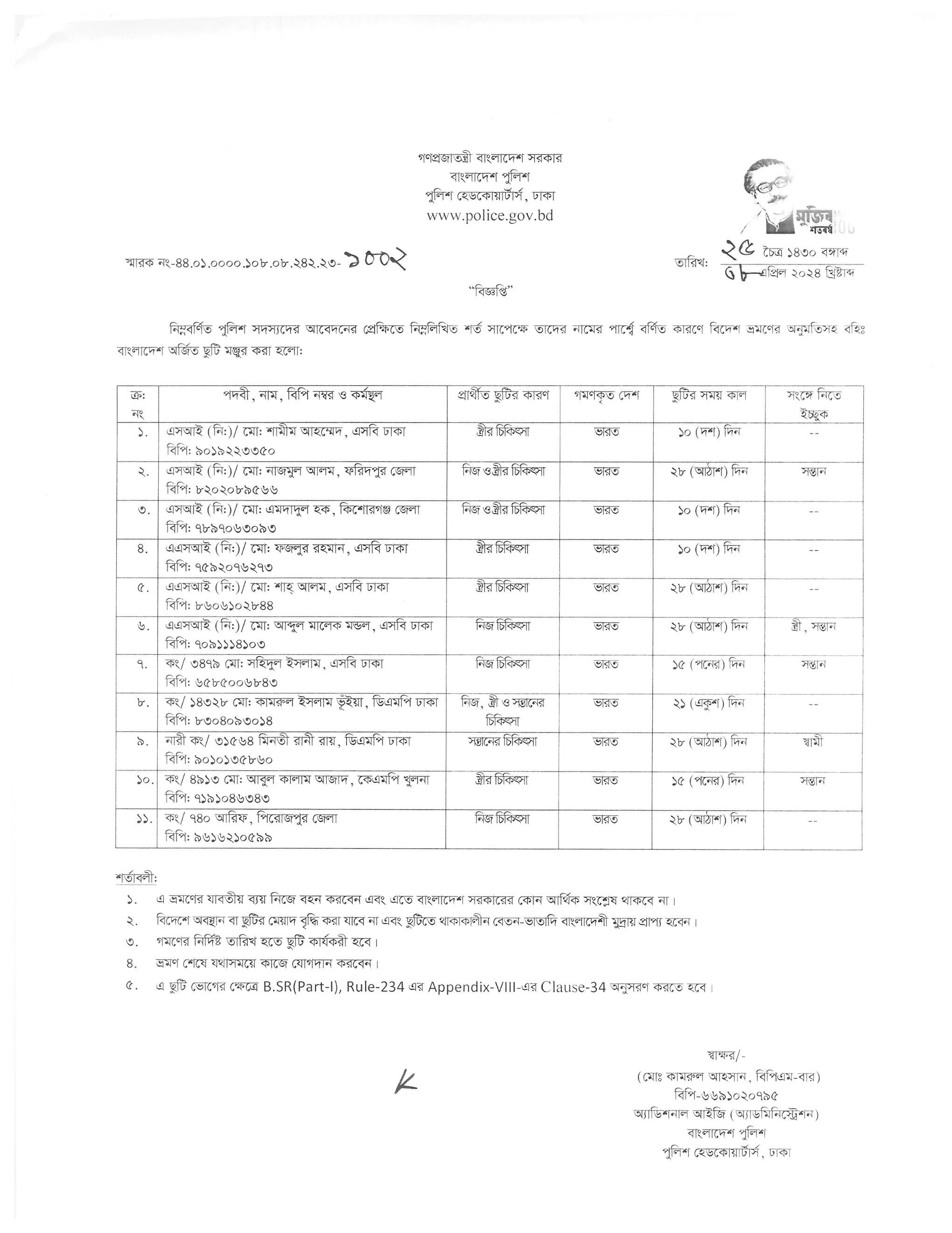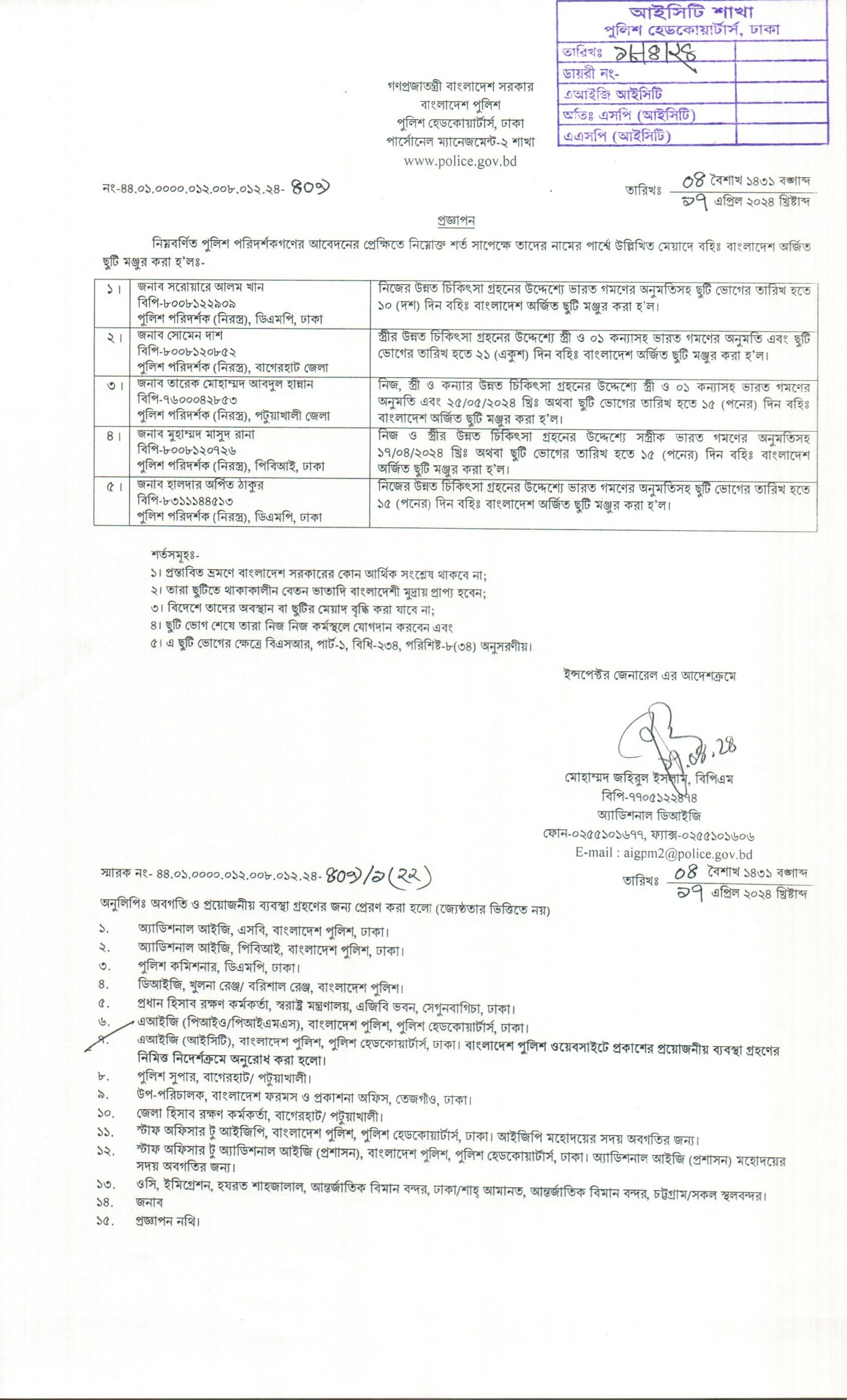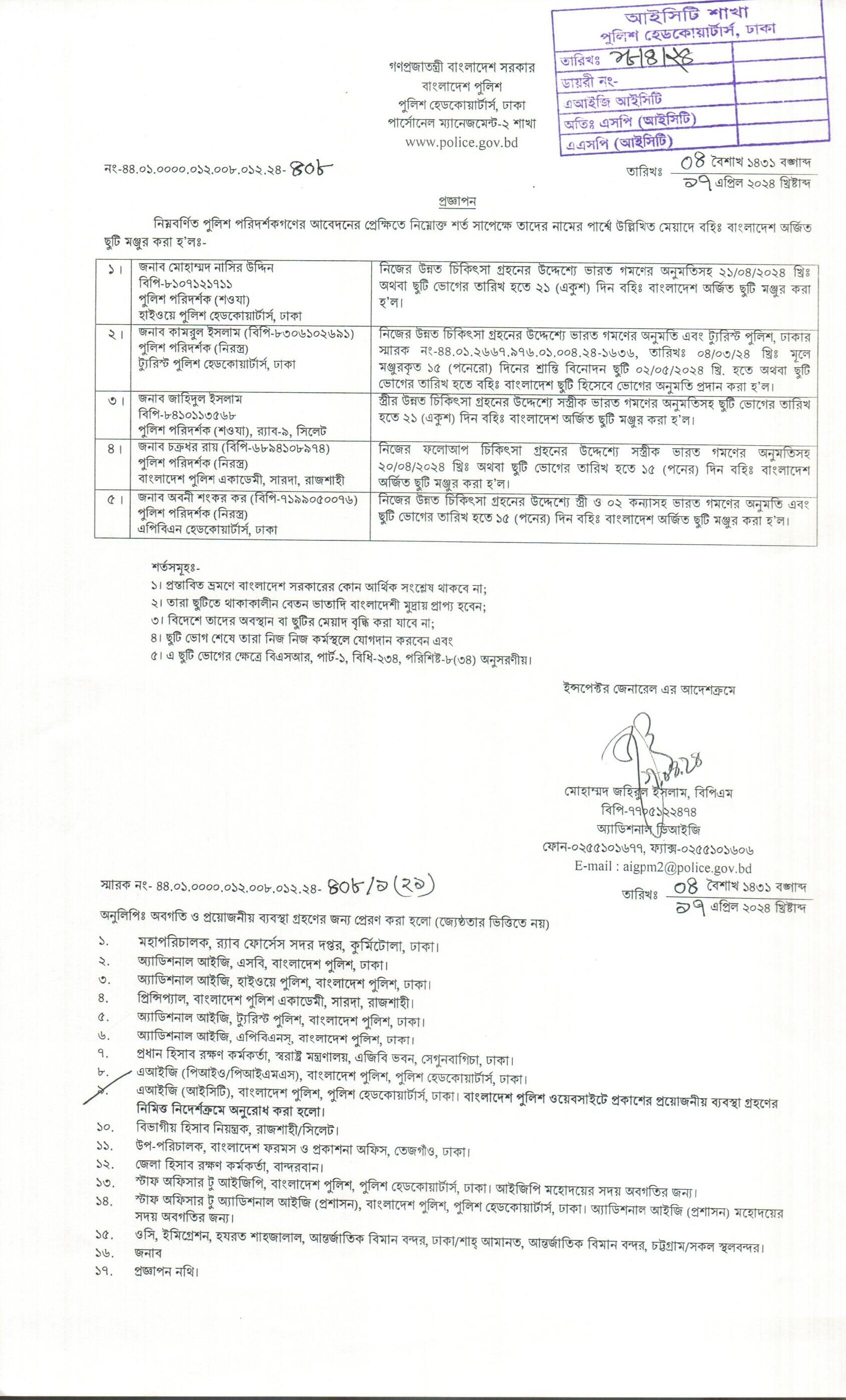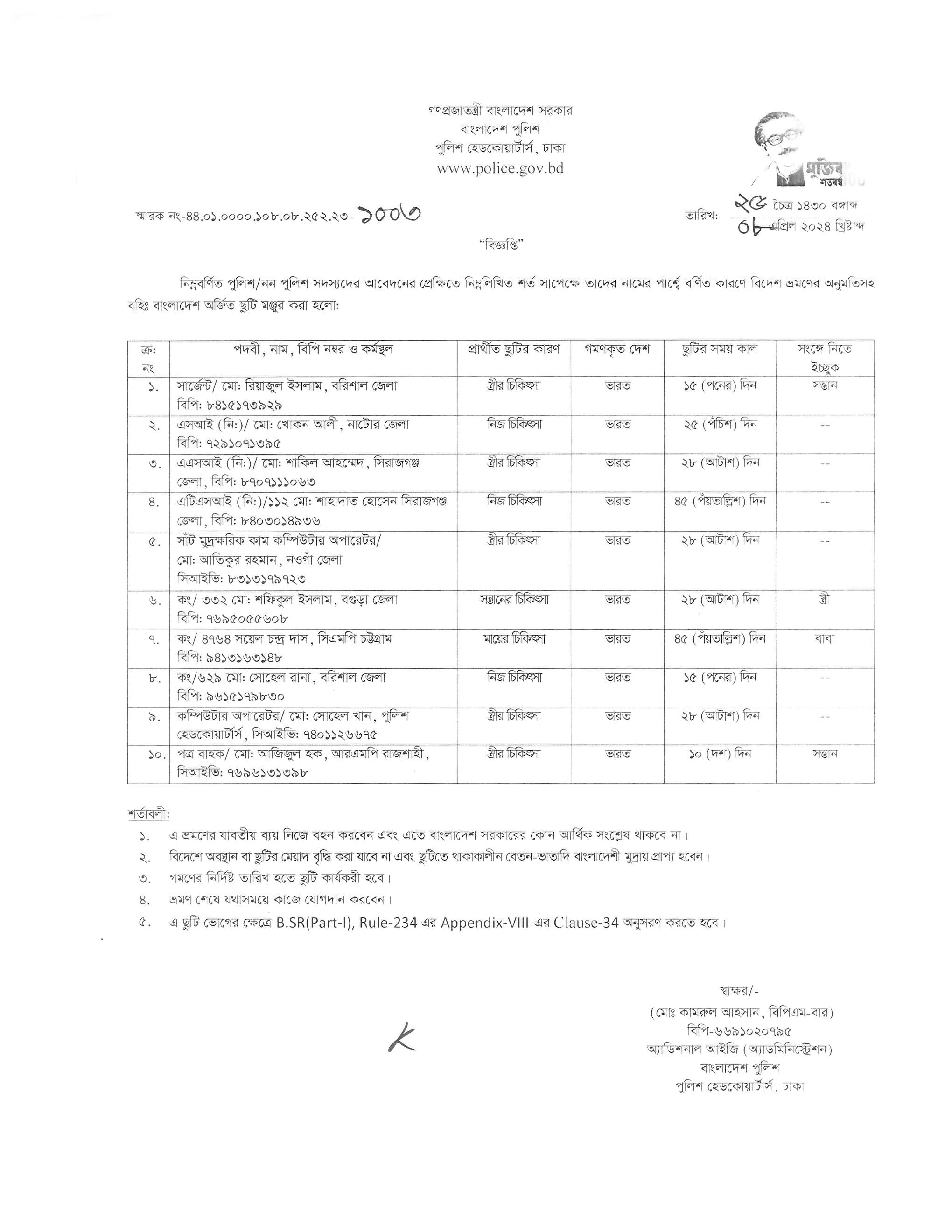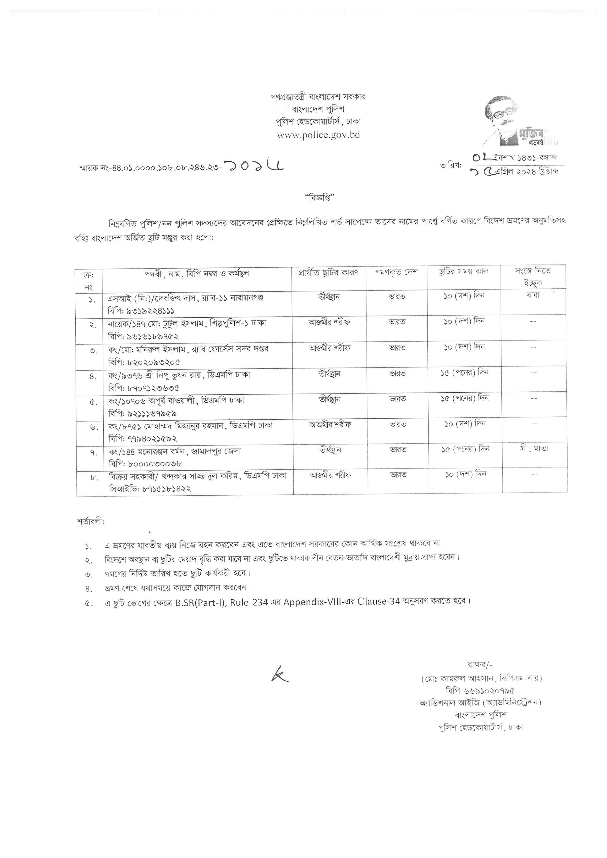 বহিঃ বাংলাদেশ ছুটি, বিজ্ঞপ্তি নং- ১০০৫ , তারিখঃ ০৮/০৪/২০২৪ খ্রিঃ।