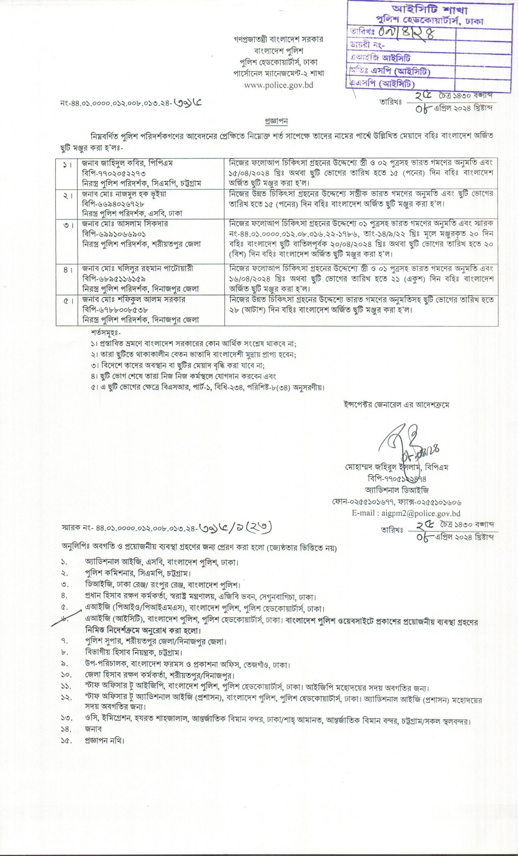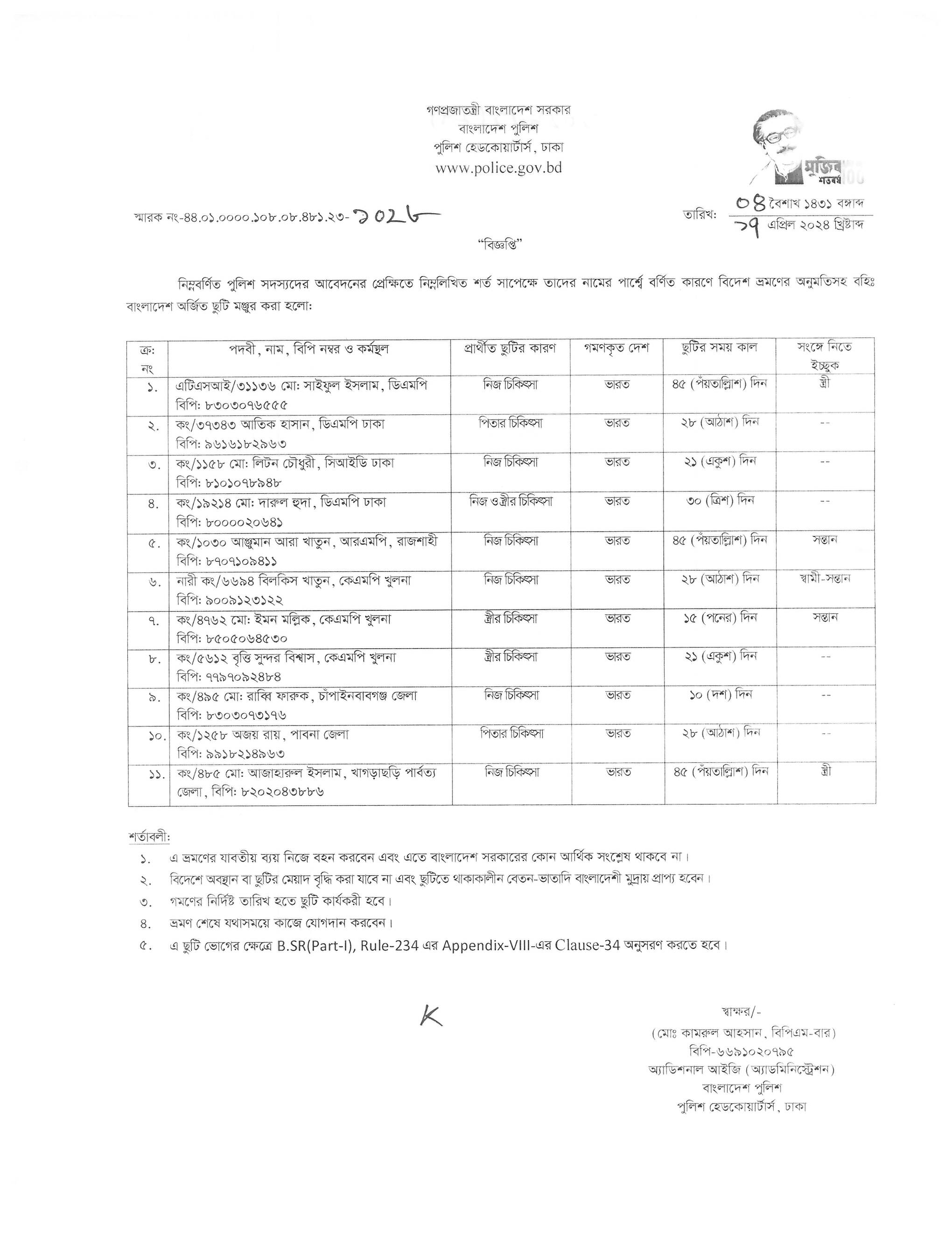 বহিঃ বাংলাদেশ ছুটি, বিজ্ঞপ্তি নং- ১০০৪ , তারিখঃ ০৮/০৪/২০২৪ খ্রিঃ।