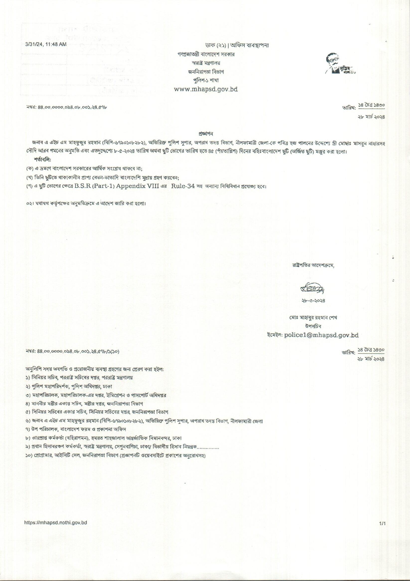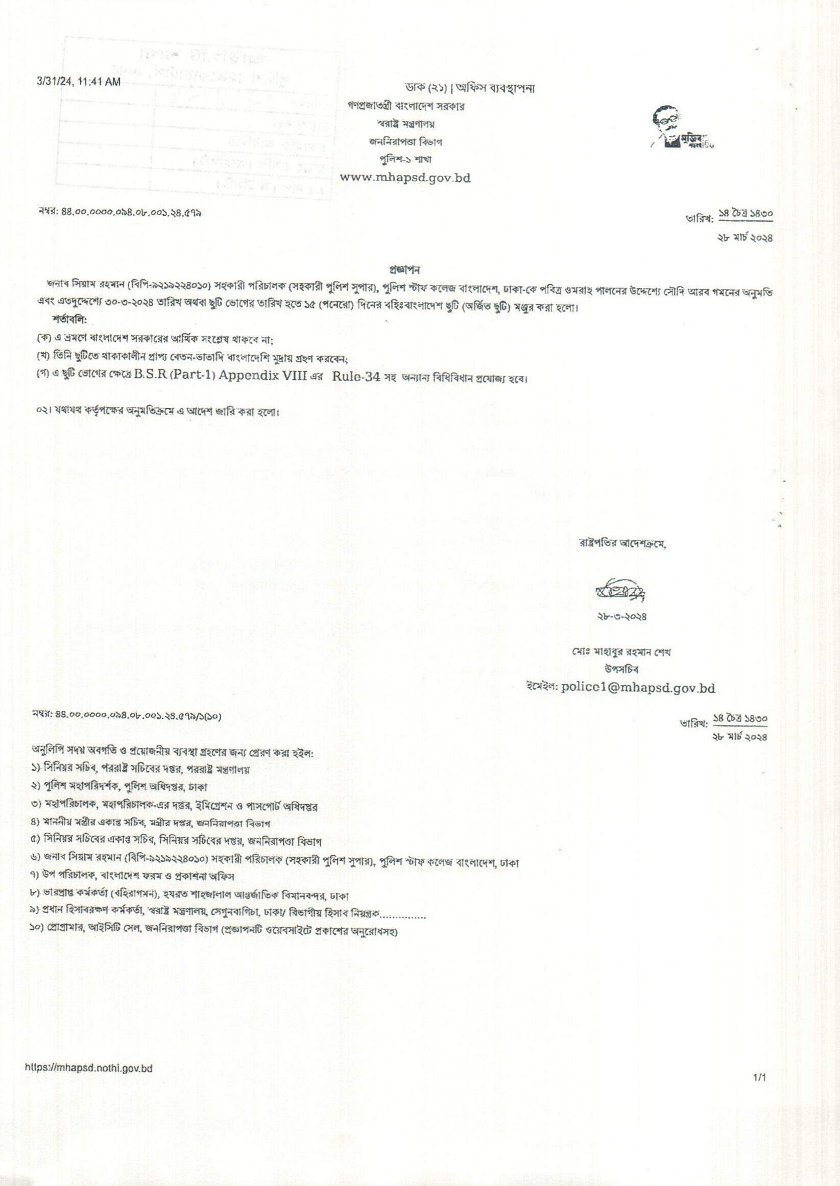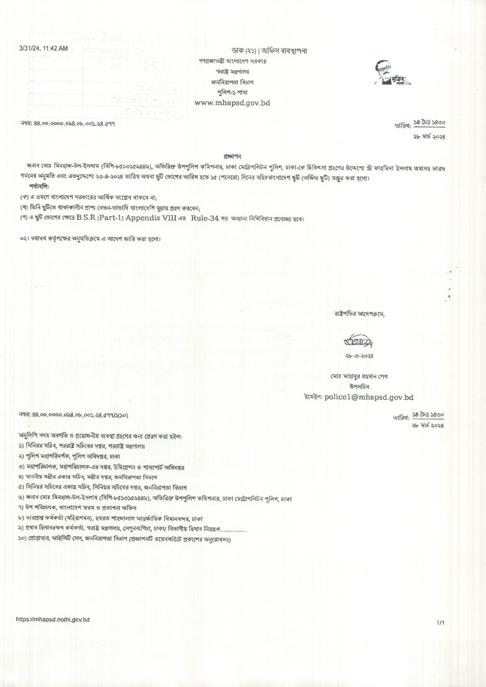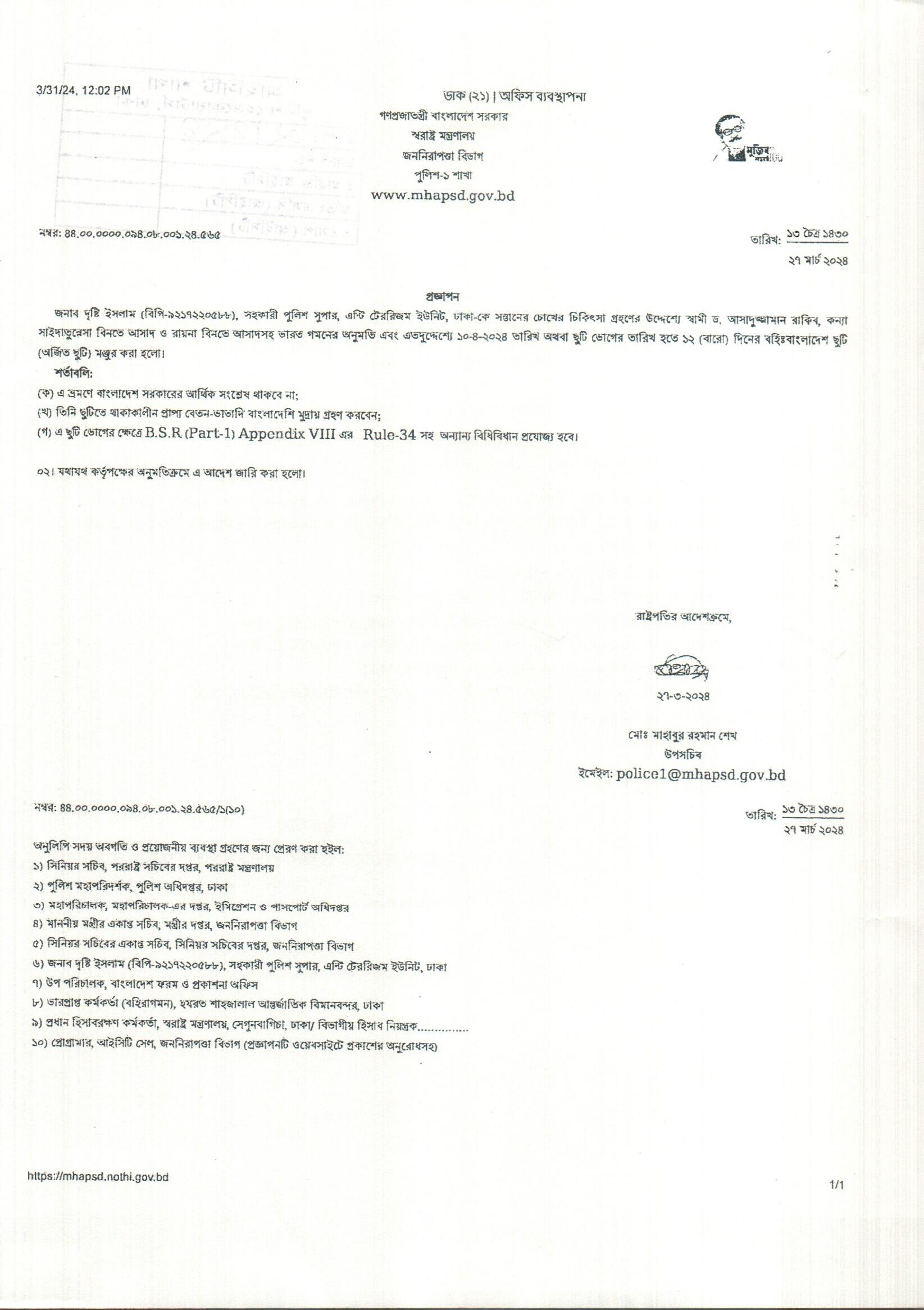 বহিঃ বাংলাদেশ ছুটি, প্রজ্ঞাপন নং- ৫০১, তারিখঃ ১৮/০৩/২০২৪ খ্রিঃ।