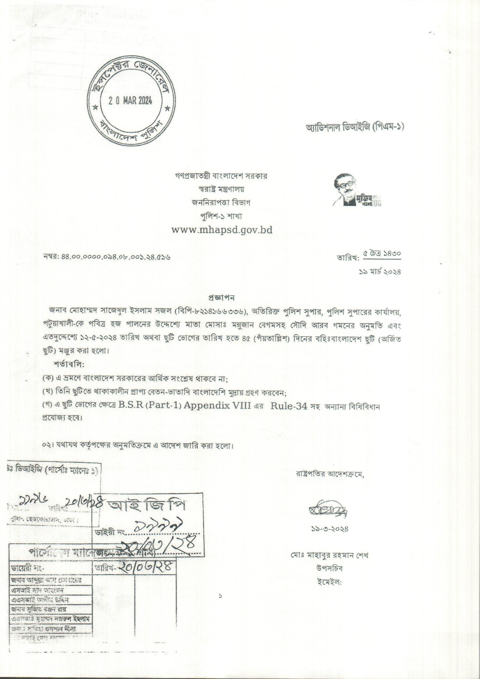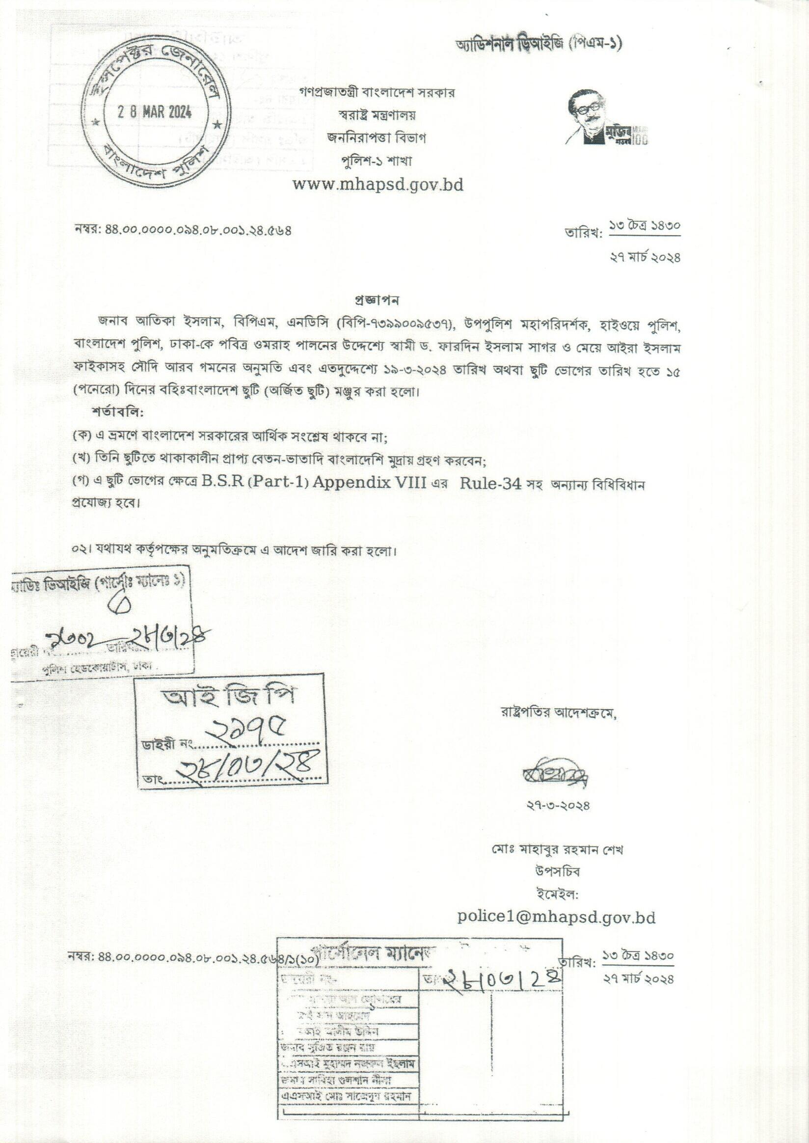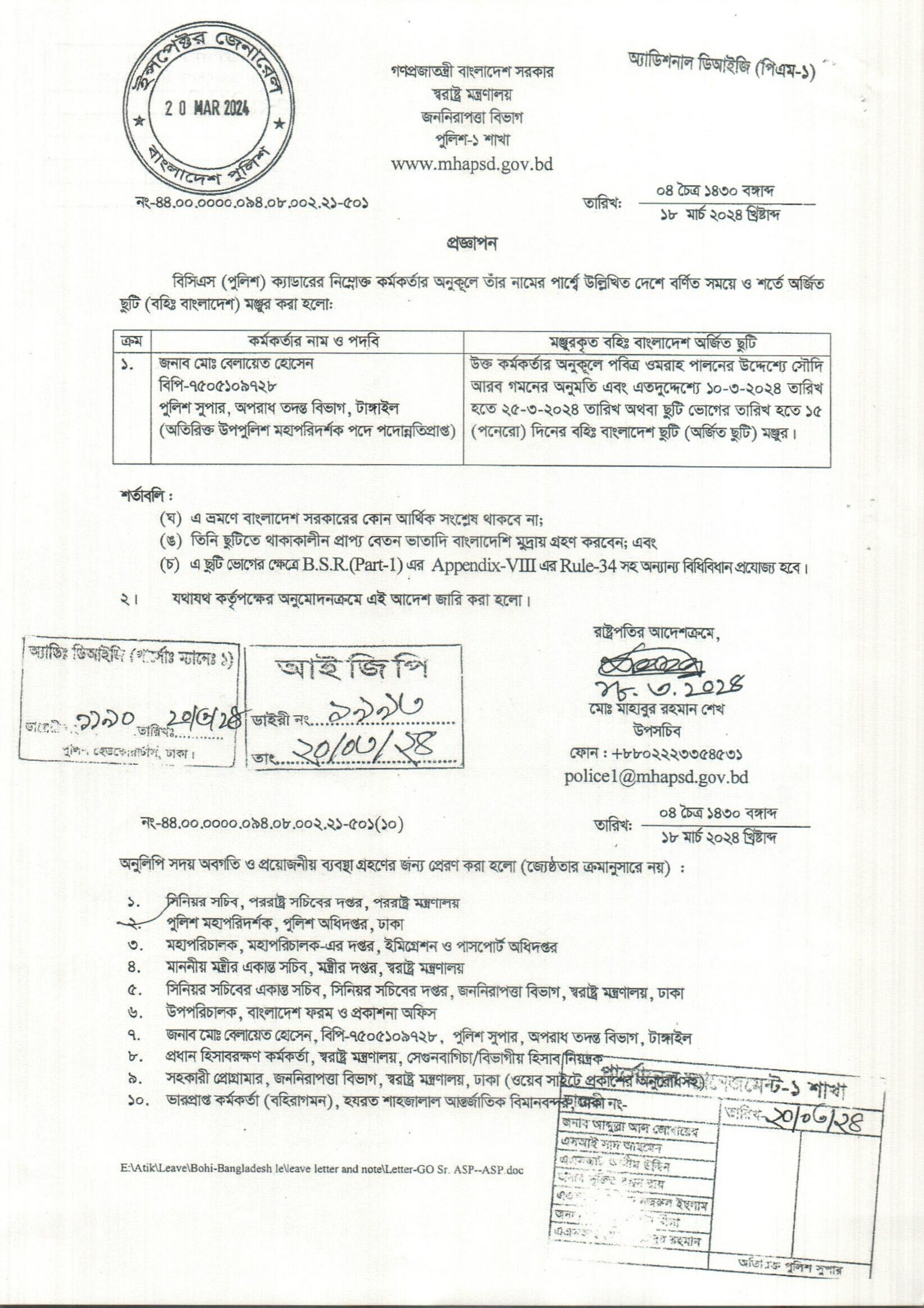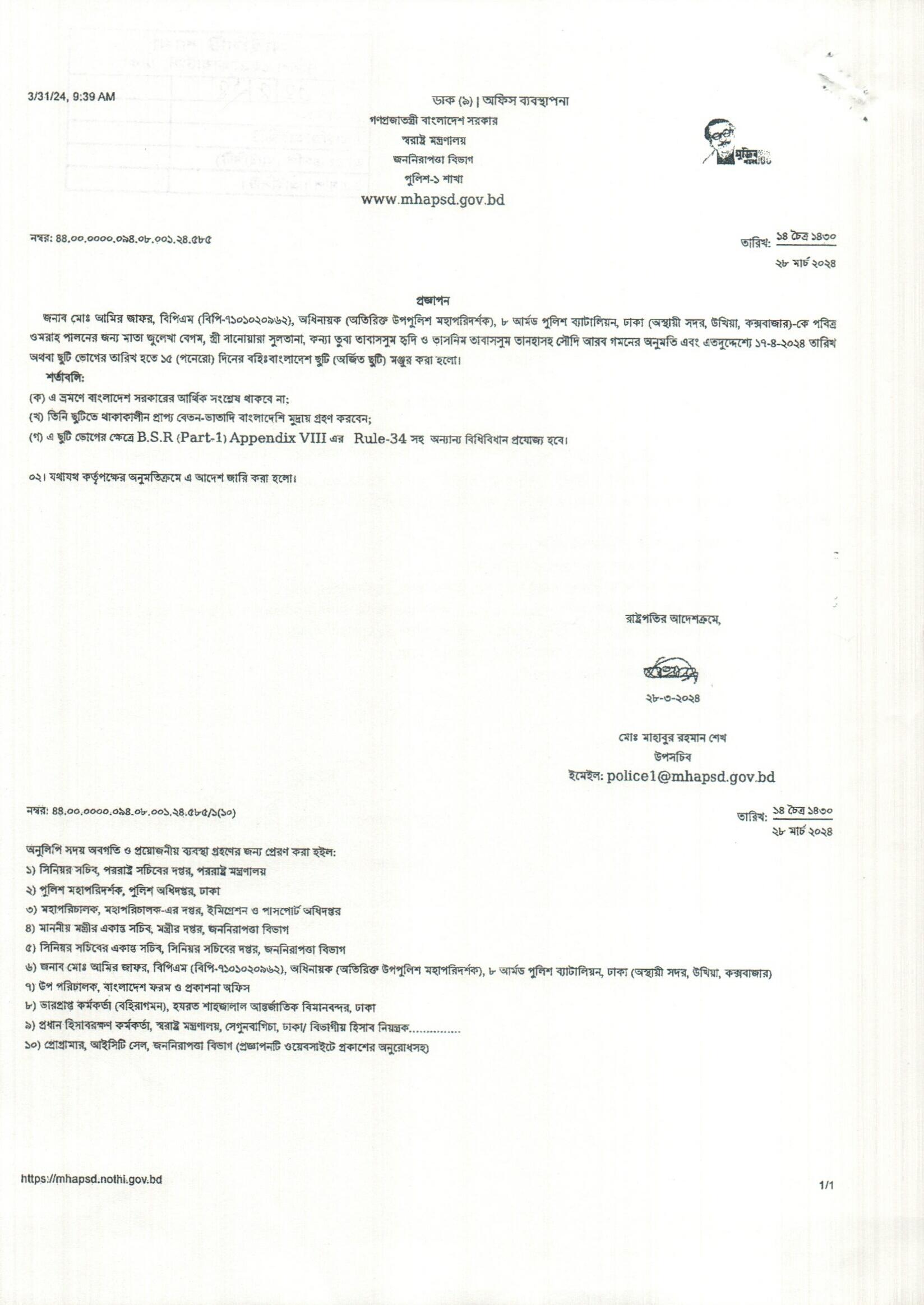বহিঃ বাংলাদেশ ছুটি, প্রজ্ঞাপন নং- ৫০১, তারিখঃ ১৮/০৩/২০২৪ খ্রিঃ।