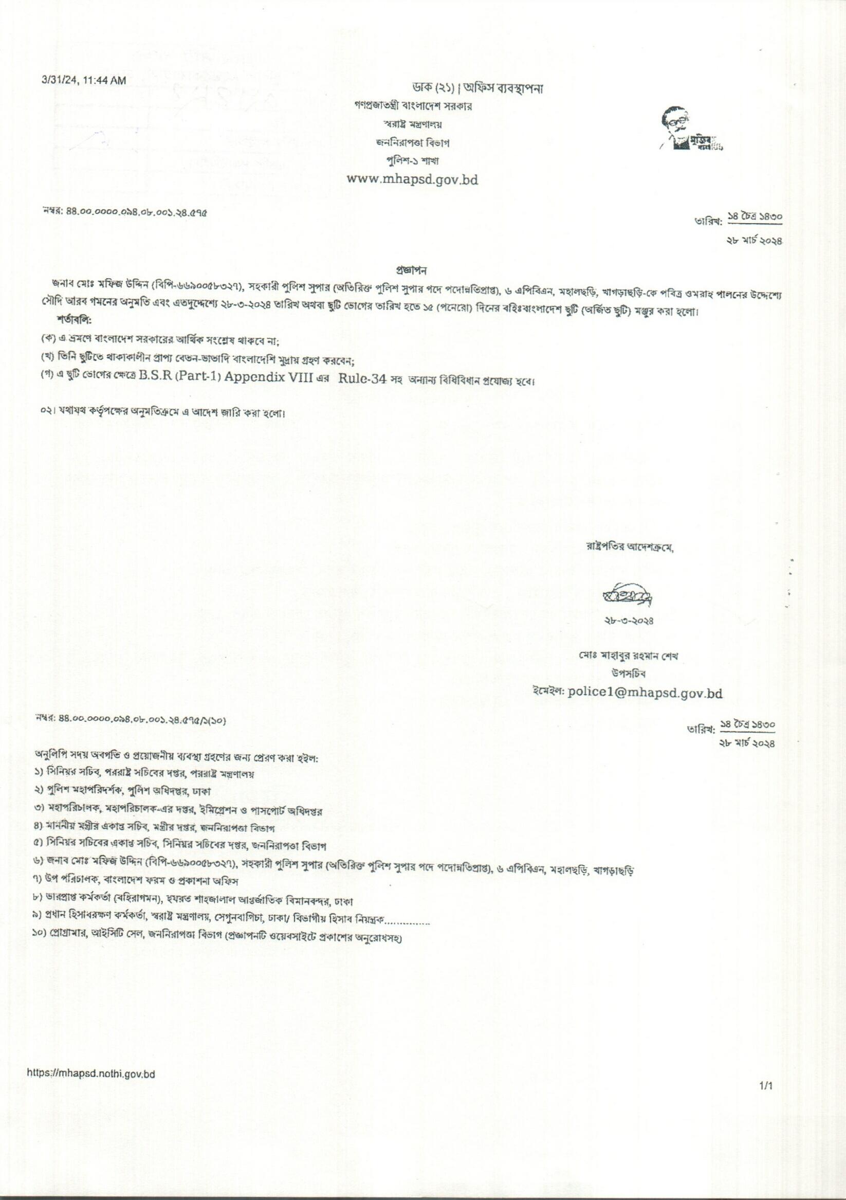 বহিঃ বাংলাদেশ ছুটি, প্রজ্ঞাপন নং- ৫৪৩, তারিখঃ ২৫/০৩/২০২৪ খ্রিঃ।