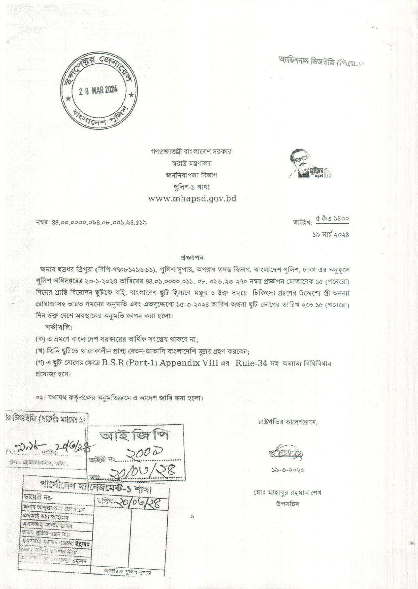 বহিঃ বাংলাদেশ ছুটি, প্রজ্ঞাপন নং- ৫১৬, তারিখঃ ১৯/০৩/২০২৪ খ্রিঃ।
