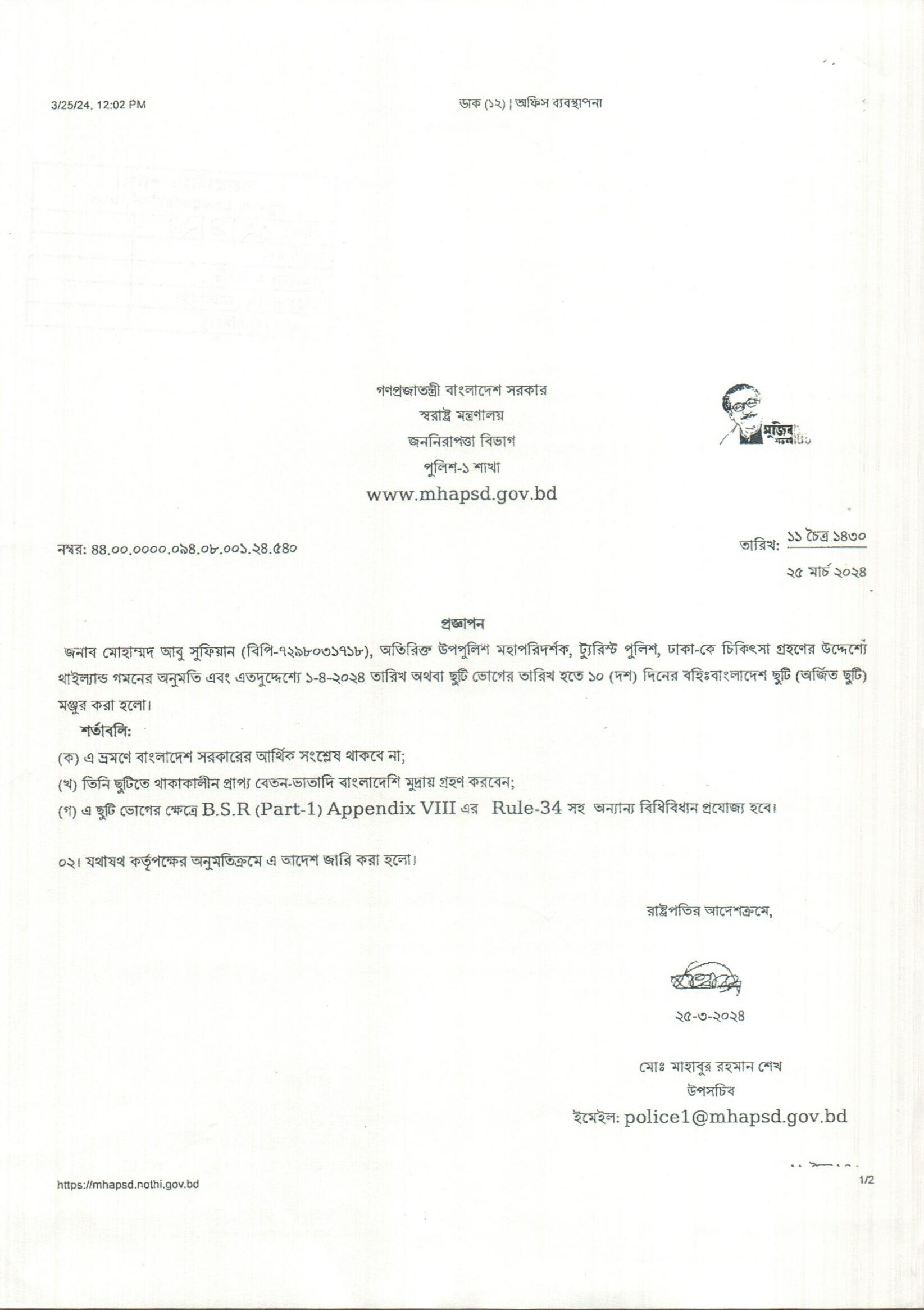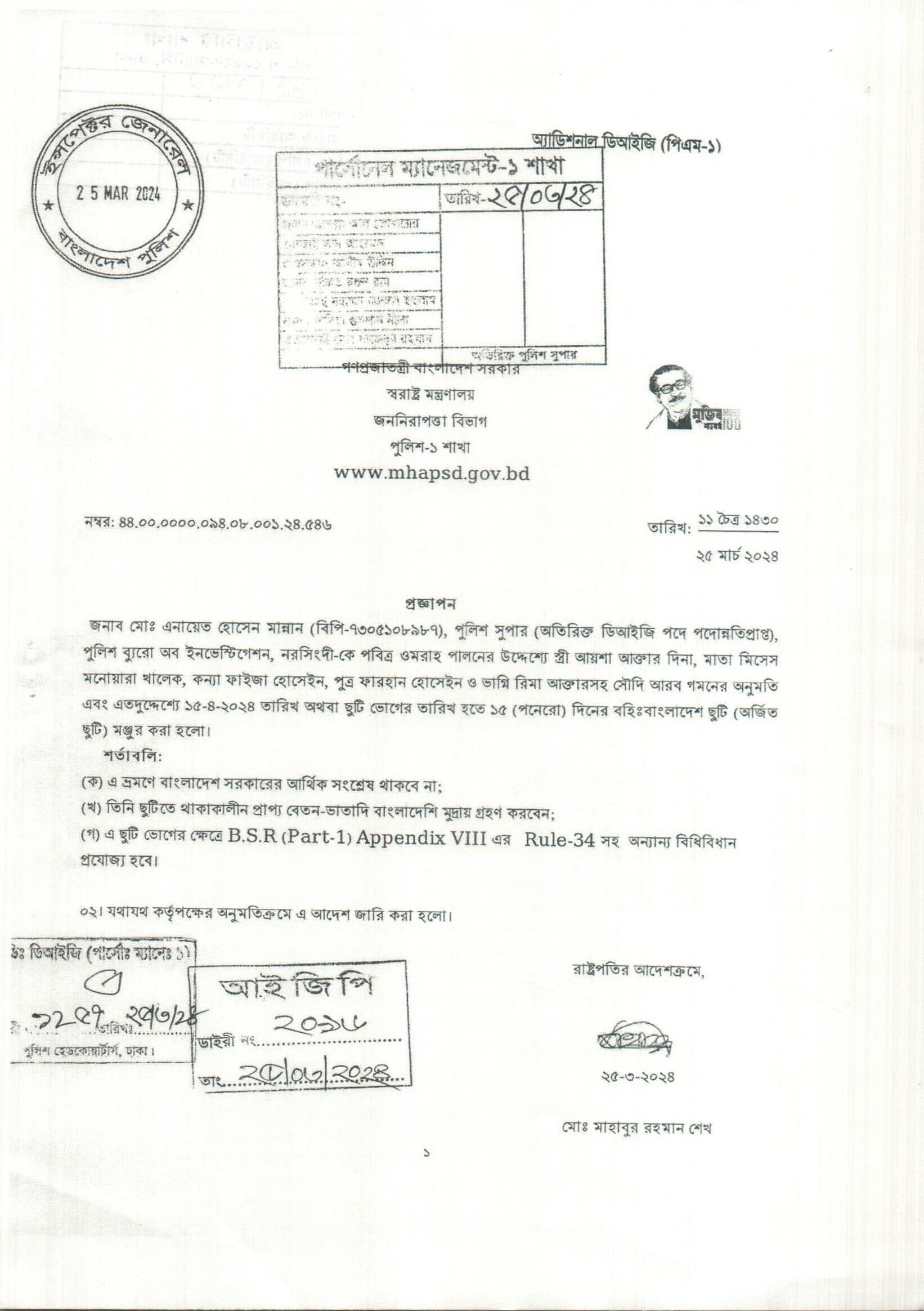 বহিঃ বাংলাদেশ ছুটি, প্রজ্ঞাপন নং- ৫৪০, তারিখঃ ২৫/০৩/২০২৪ খ্রিঃ।