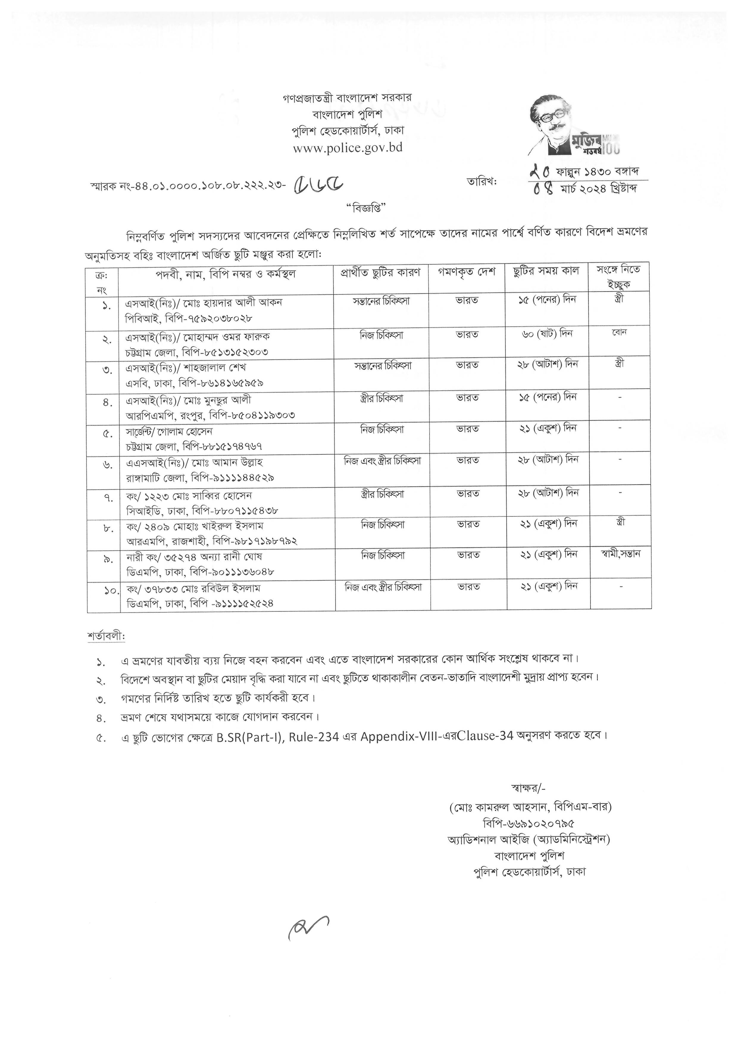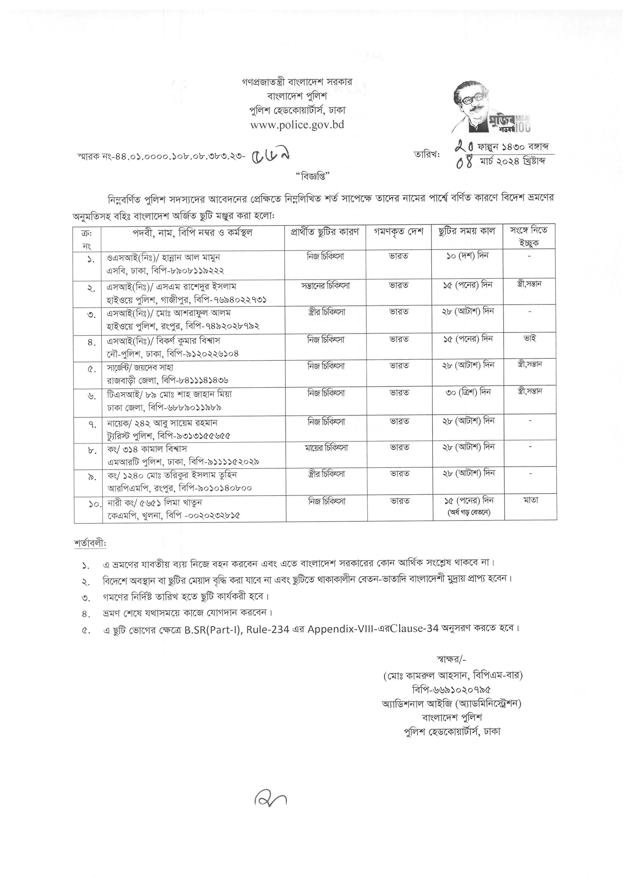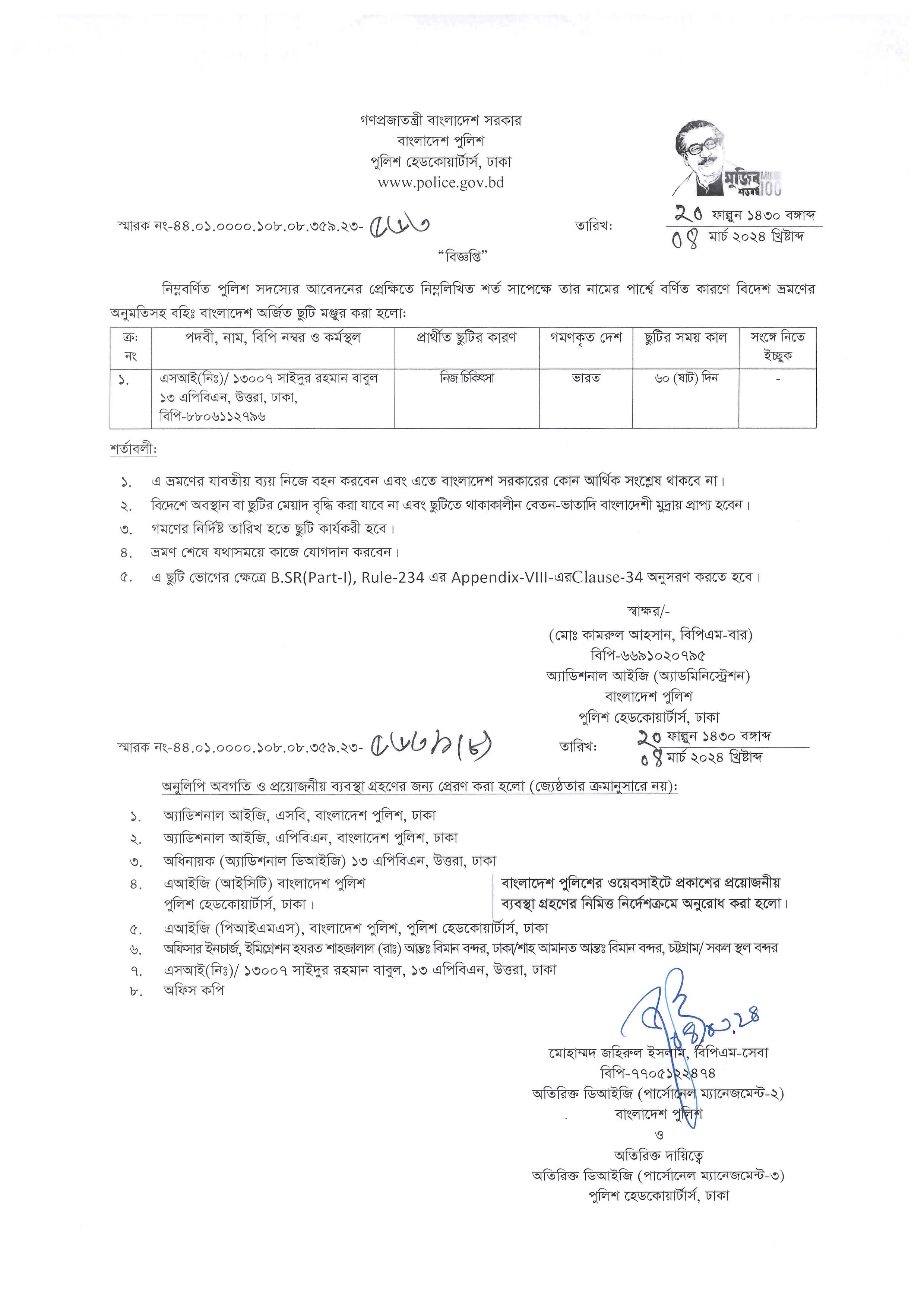 বহিঃ বাংলাদেশ ছুটি, বিজ্ঞপ্তি নং-৫৬৭ , তারিখঃ ০৪/০৩/২০২৪ খ্রিঃ।