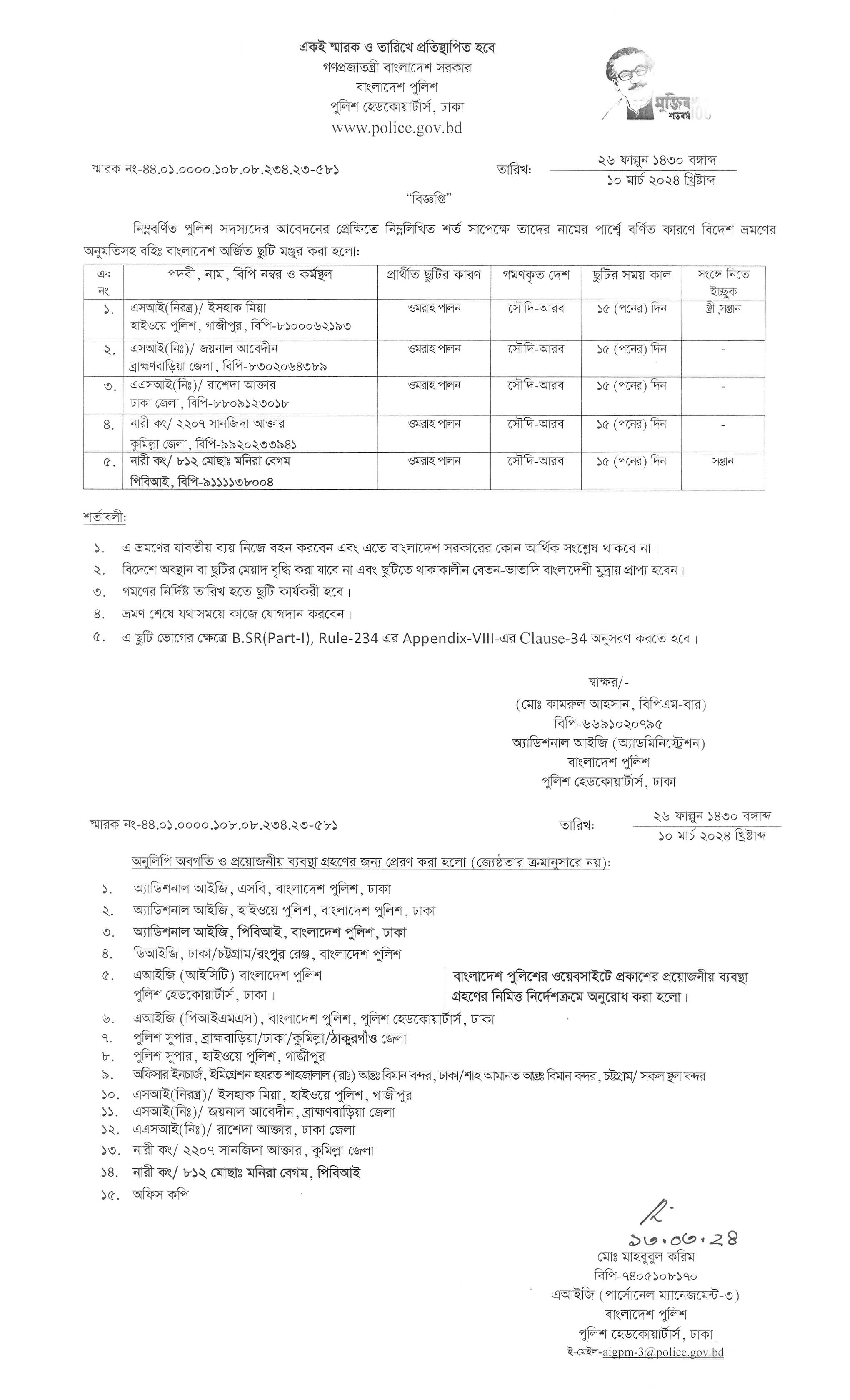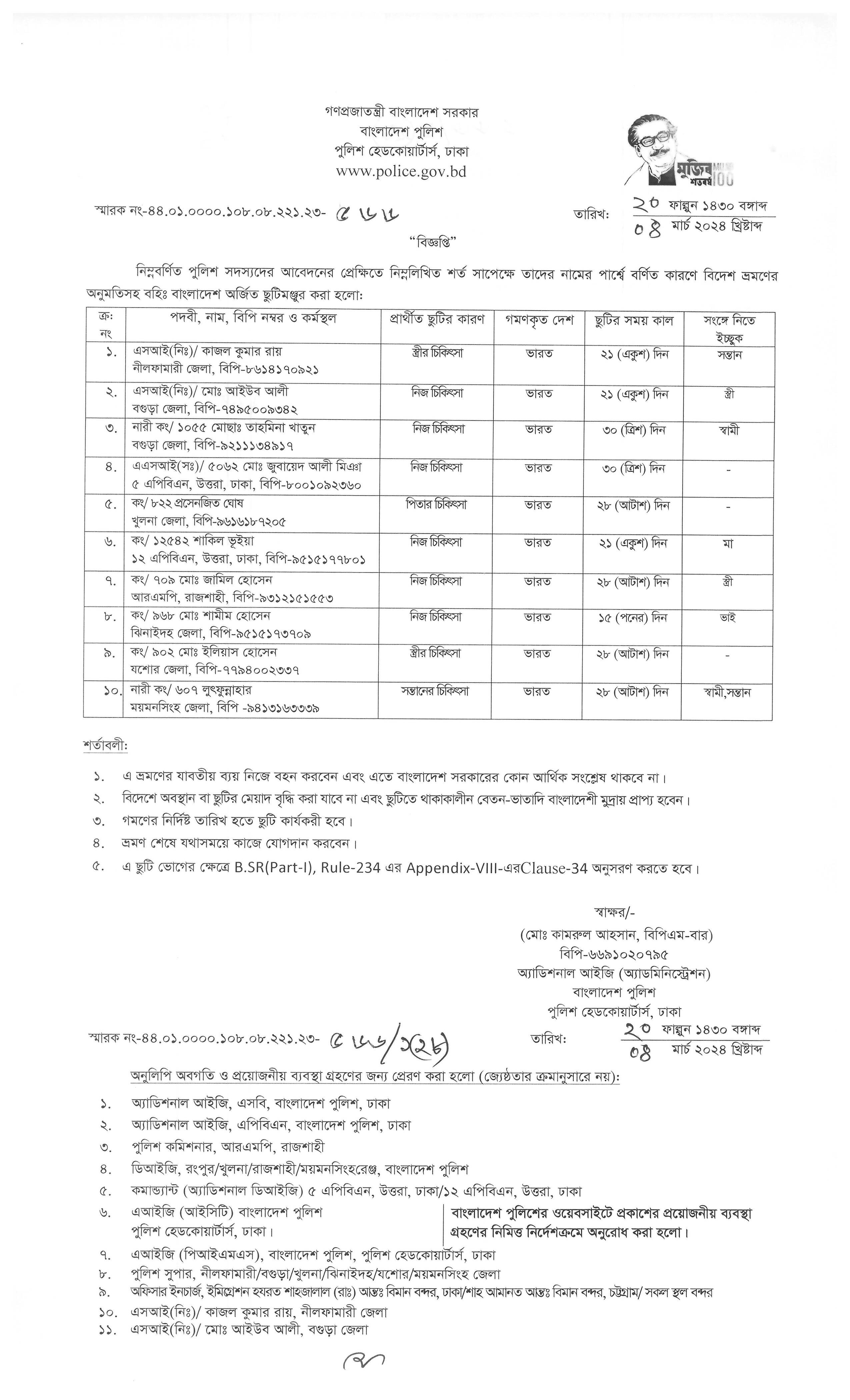 বহিঃ বাংলাদেশ ছুটি, বিজ্ঞপ্তি নং-৫৬৯ , তারিখঃ ০৪/০৩/২০২৪ খ্রিঃ।