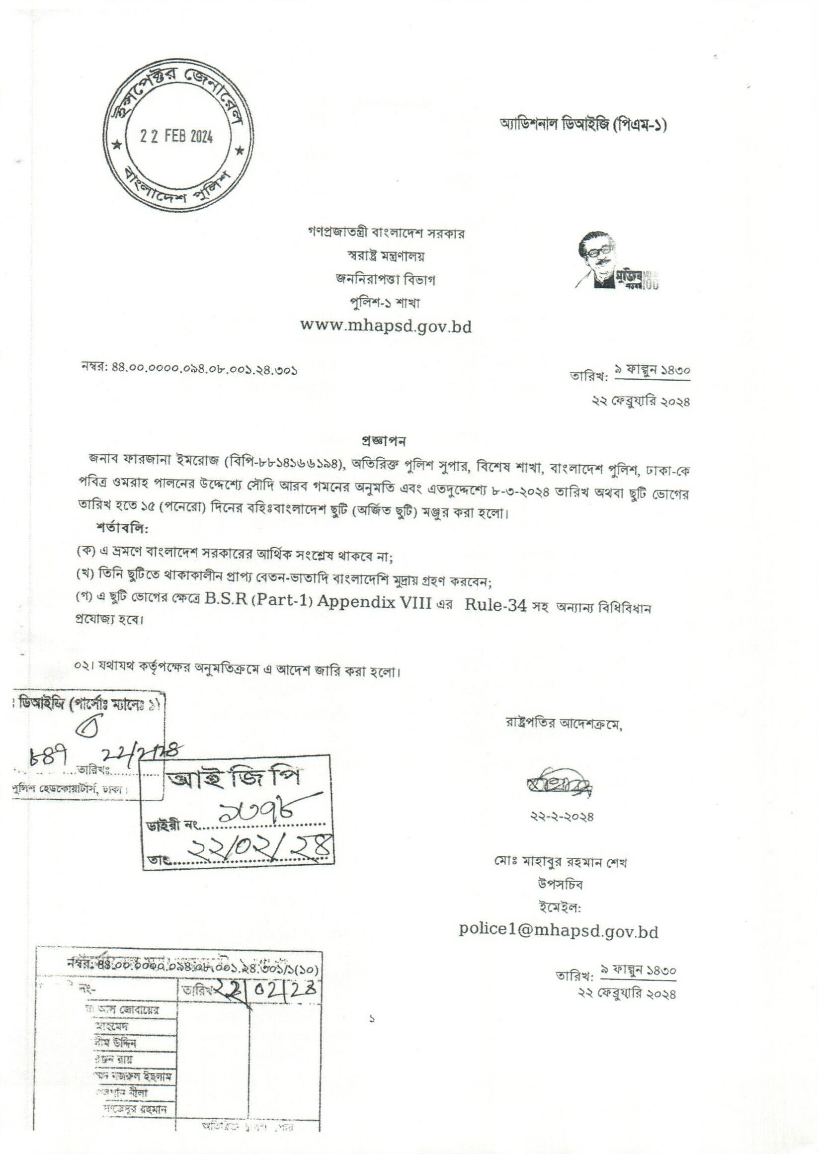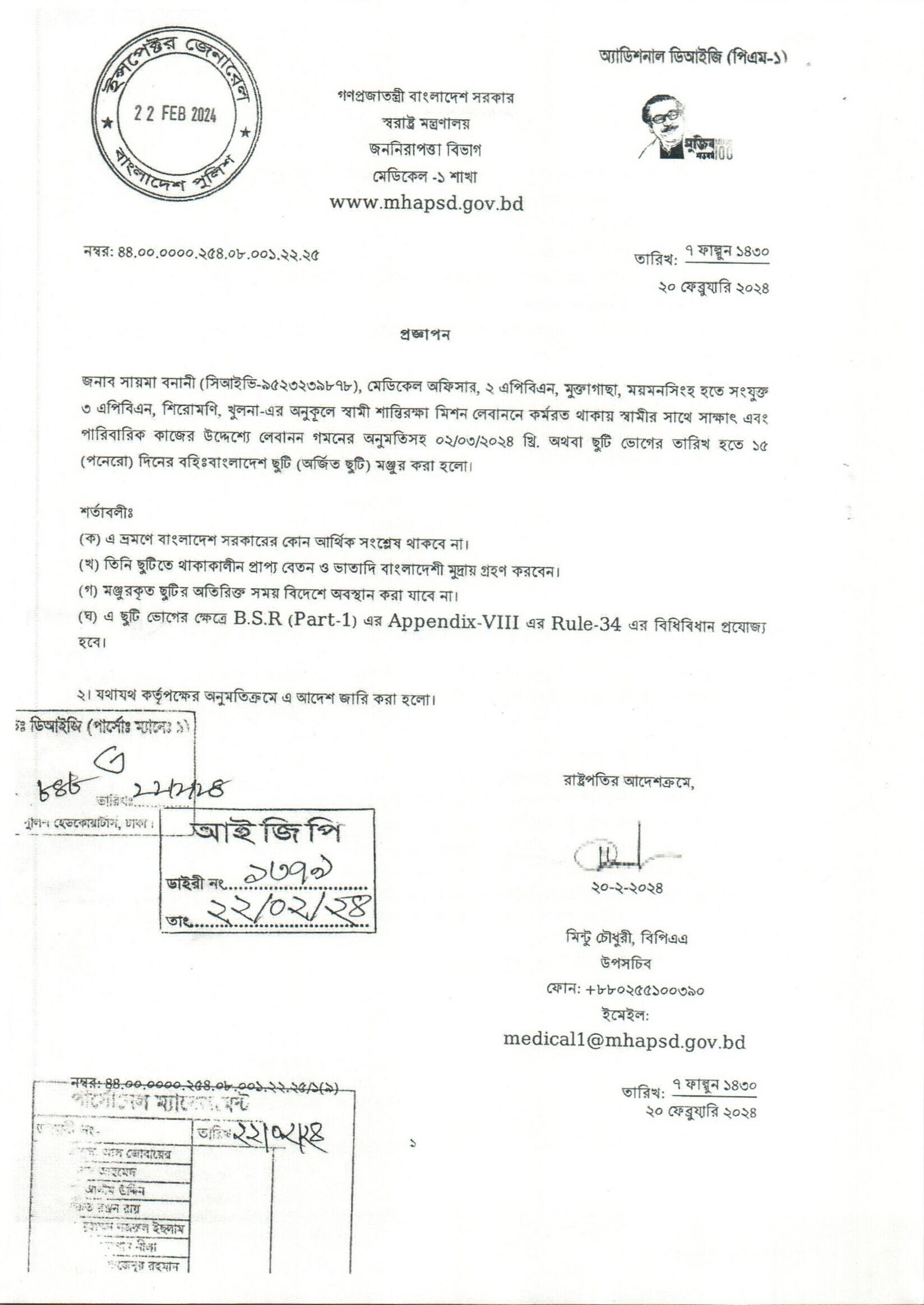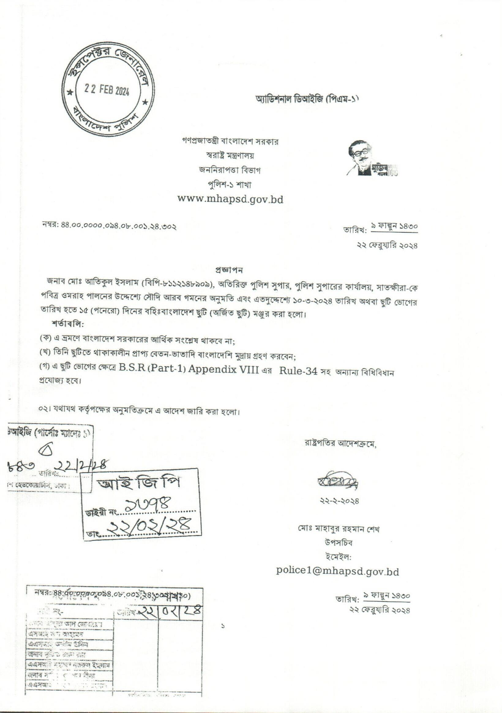 বহিঃ বাংলাদেশ ছুটি, প্রজ্ঞাপন নং- ৩০১, তারিখঃ ২২/০২/২০২৪ খ্রিঃ।