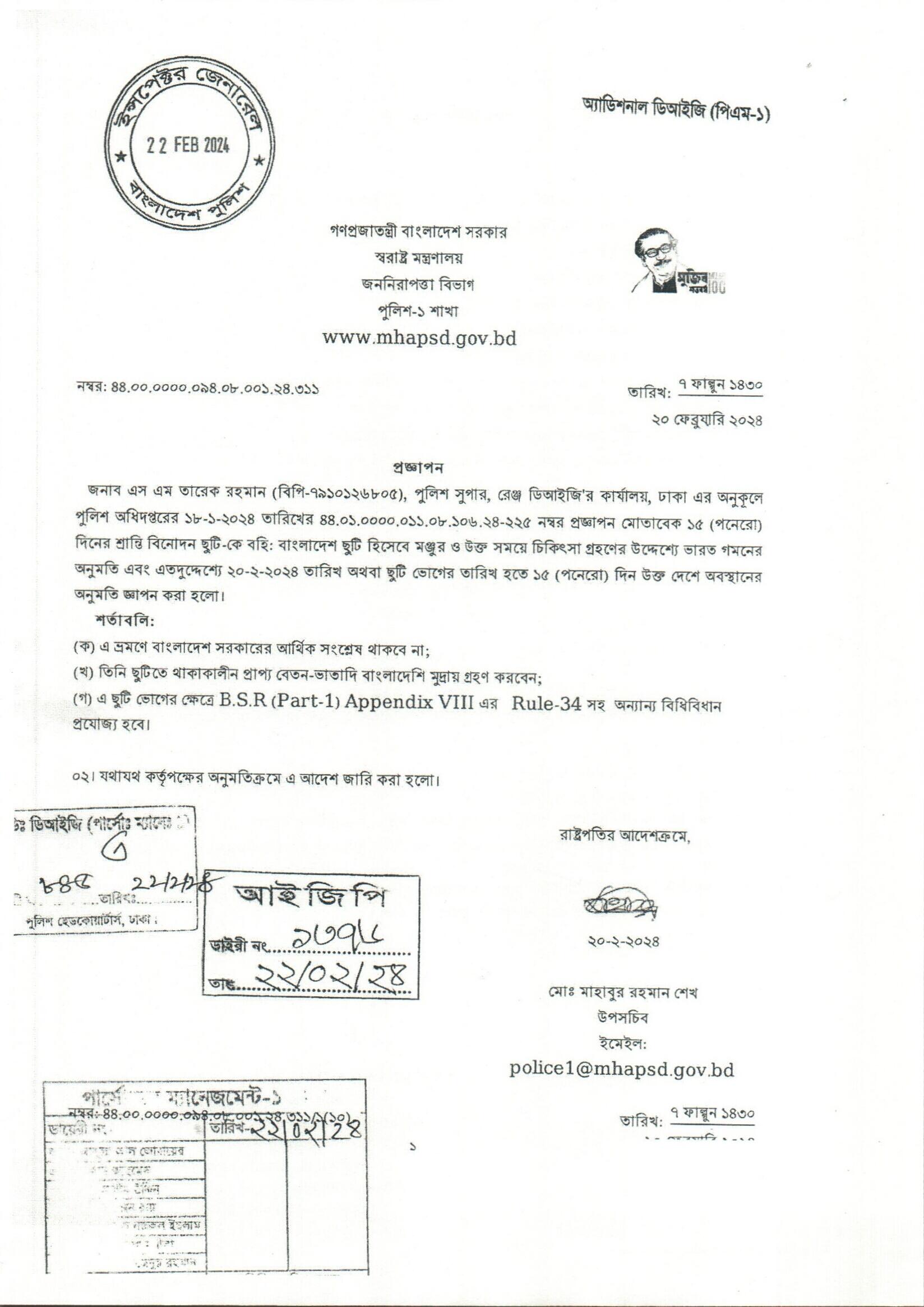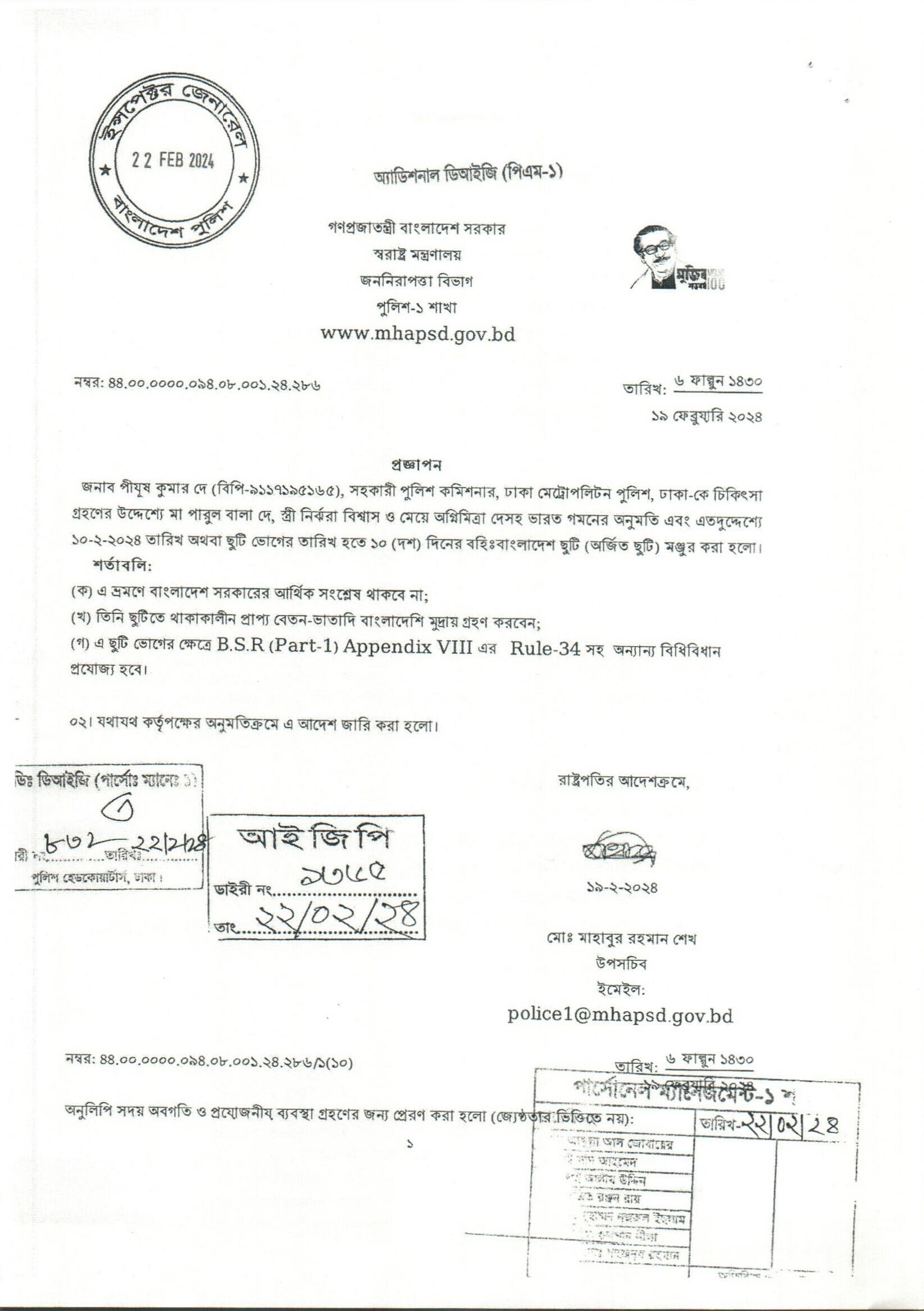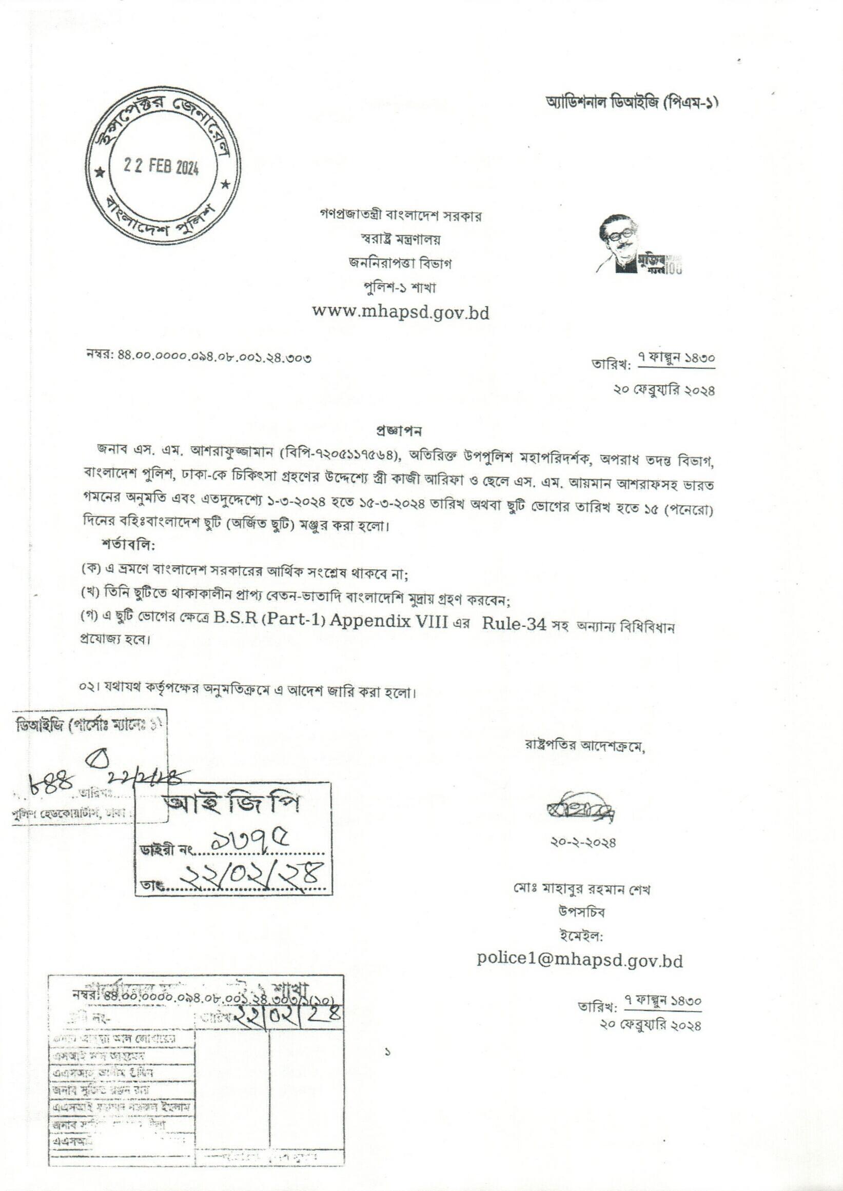 বহিঃ বাংলাদেশ ছুটি, প্রজ্ঞাপন নং- ২৭৬, তারিখঃ ১৯/০২/২০২৪ খ্রিঃ।