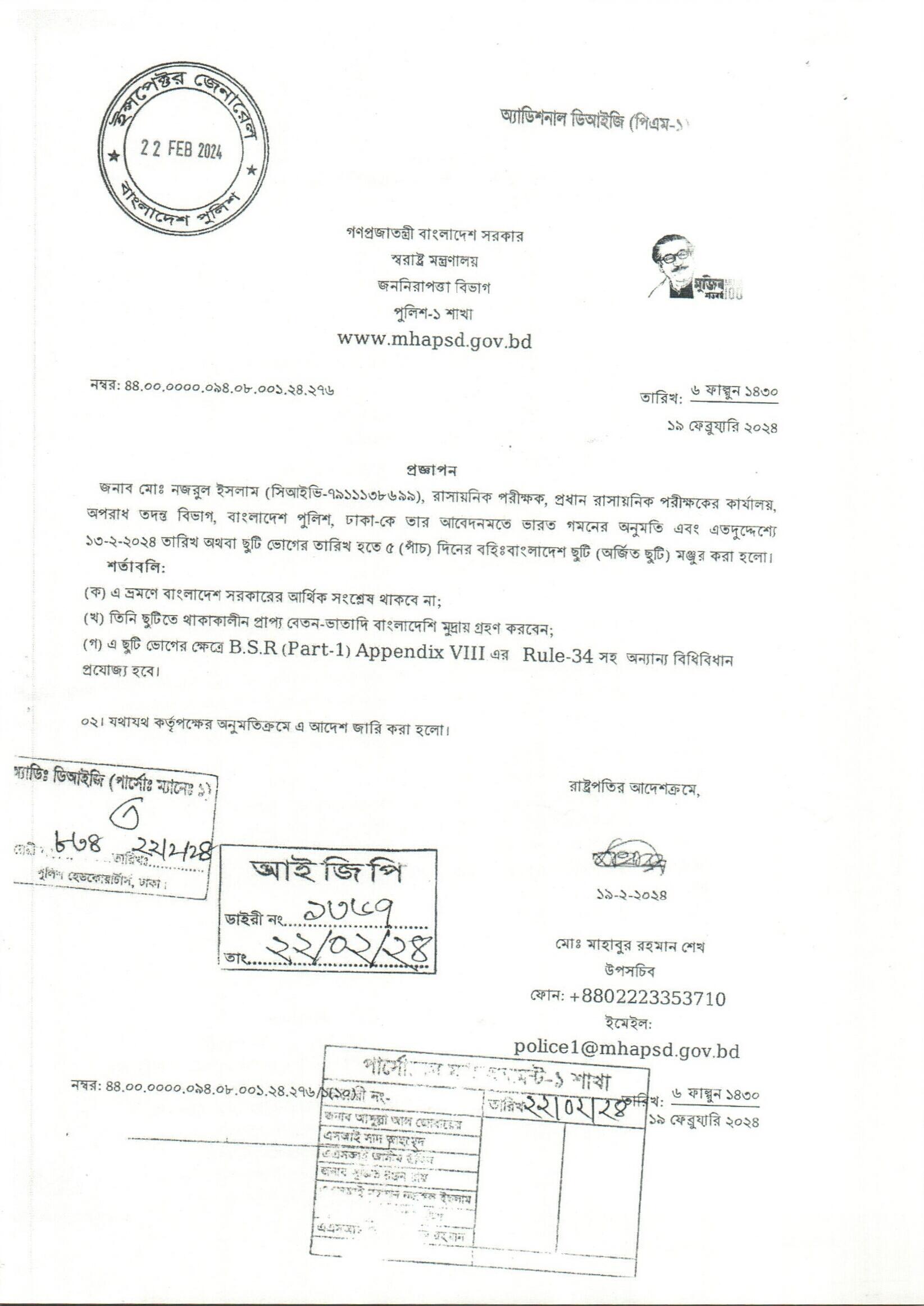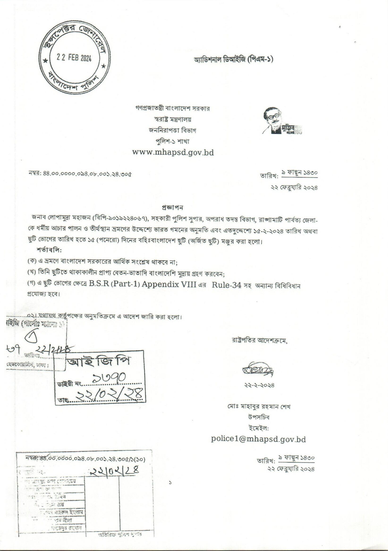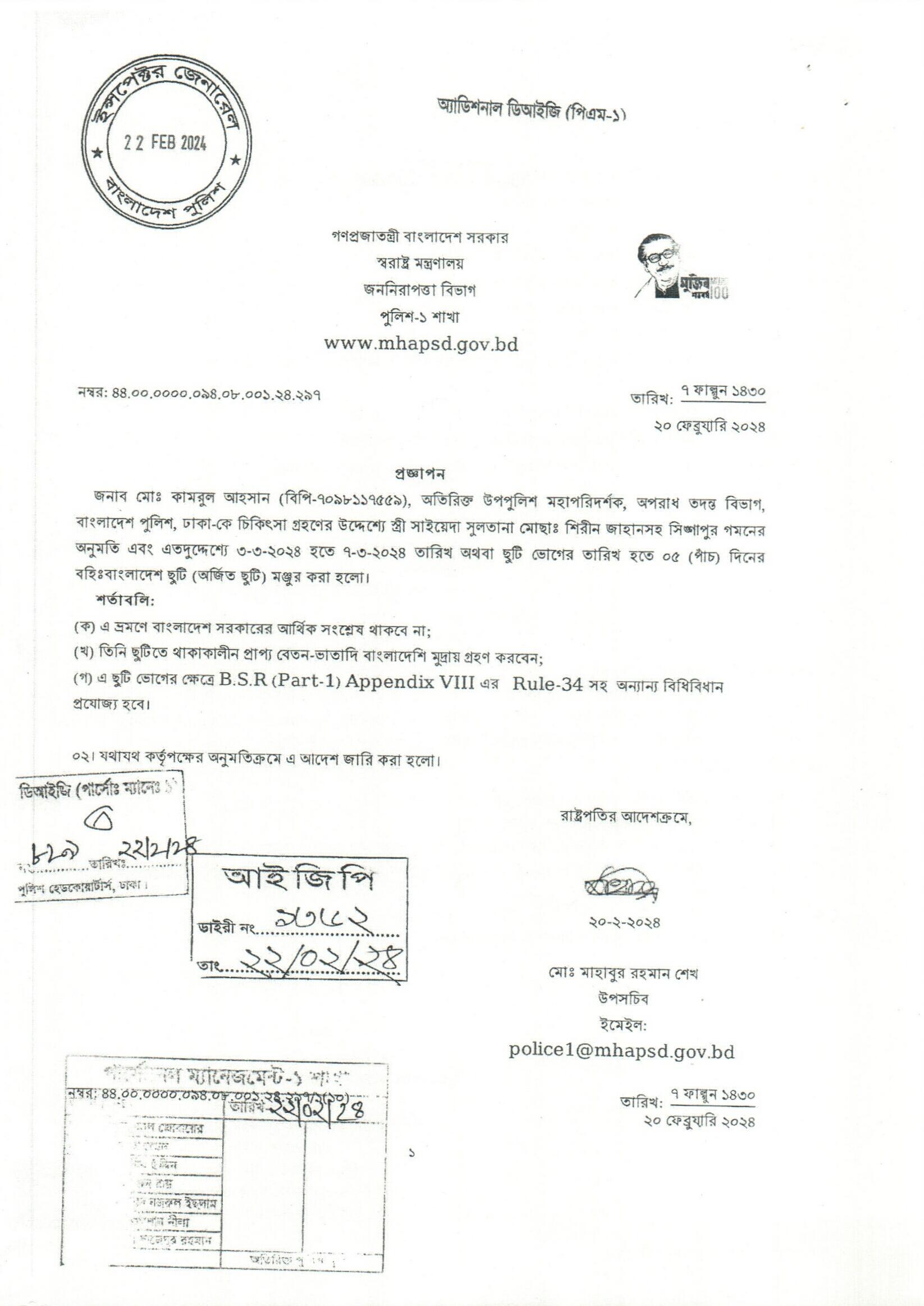 বহিঃ বাংলাদেশ ছুটি, প্রজ্ঞাপন নং- ৩০৫, তারিখঃ ২২/০২/২০২৪ খ্রিঃ।