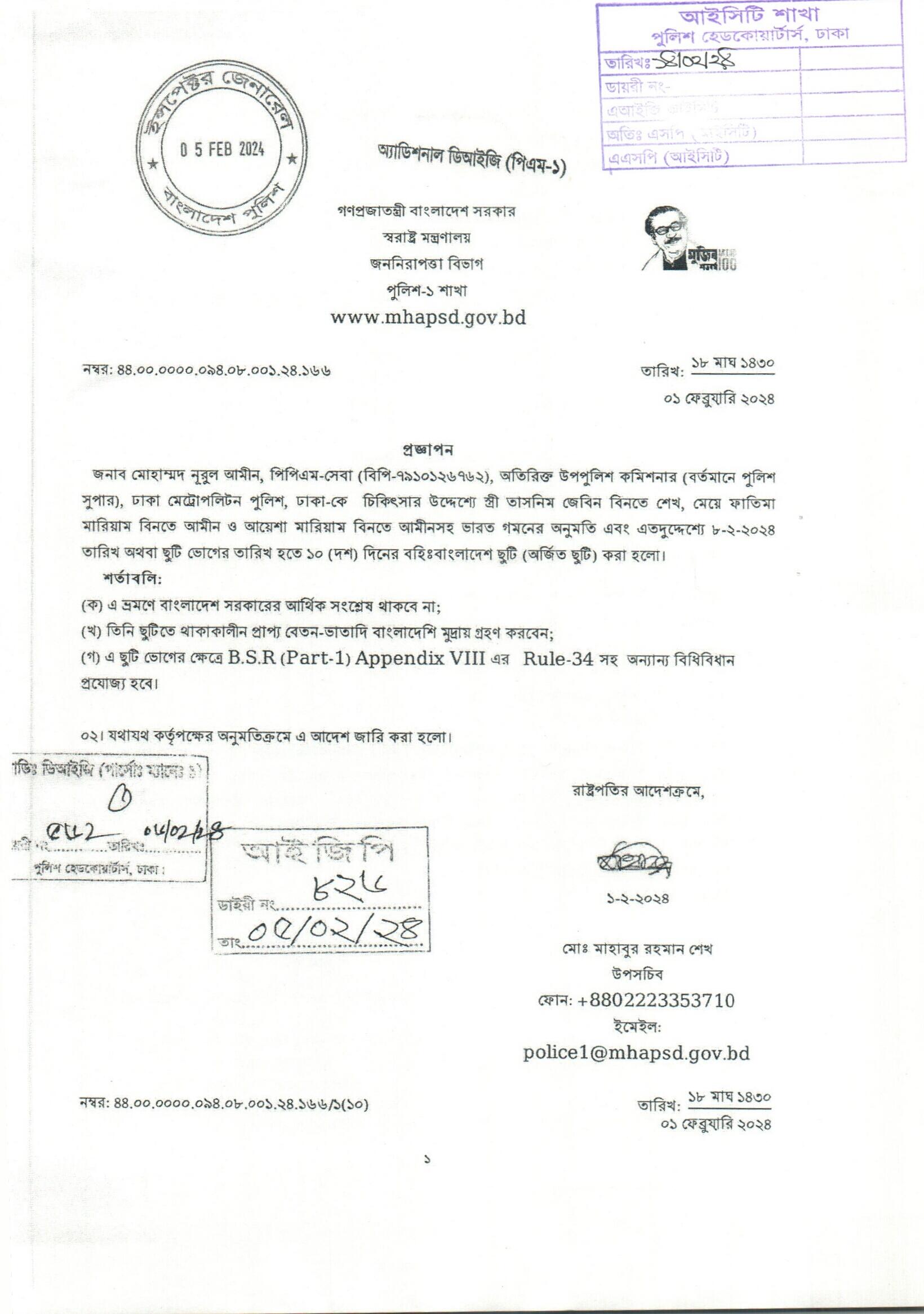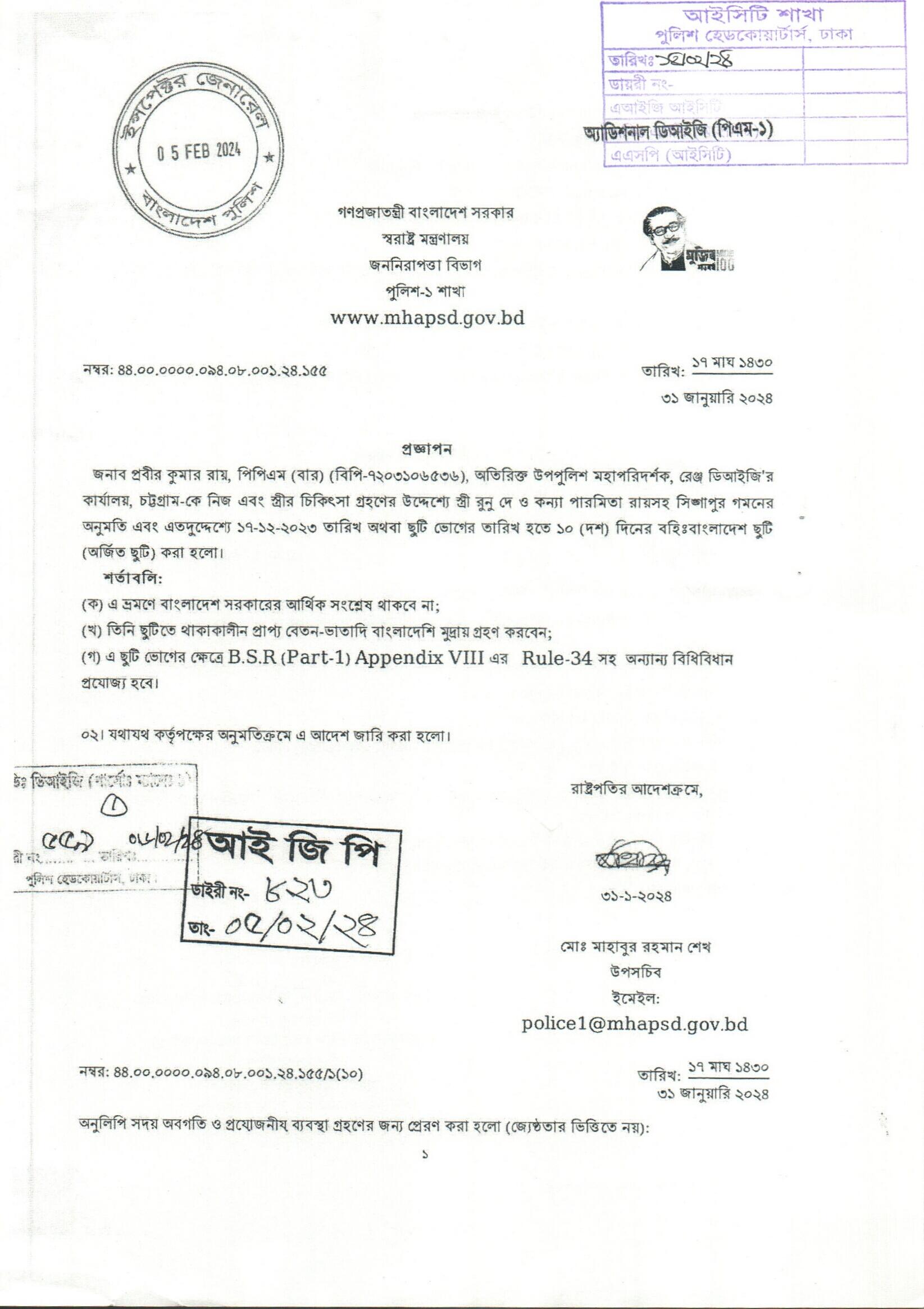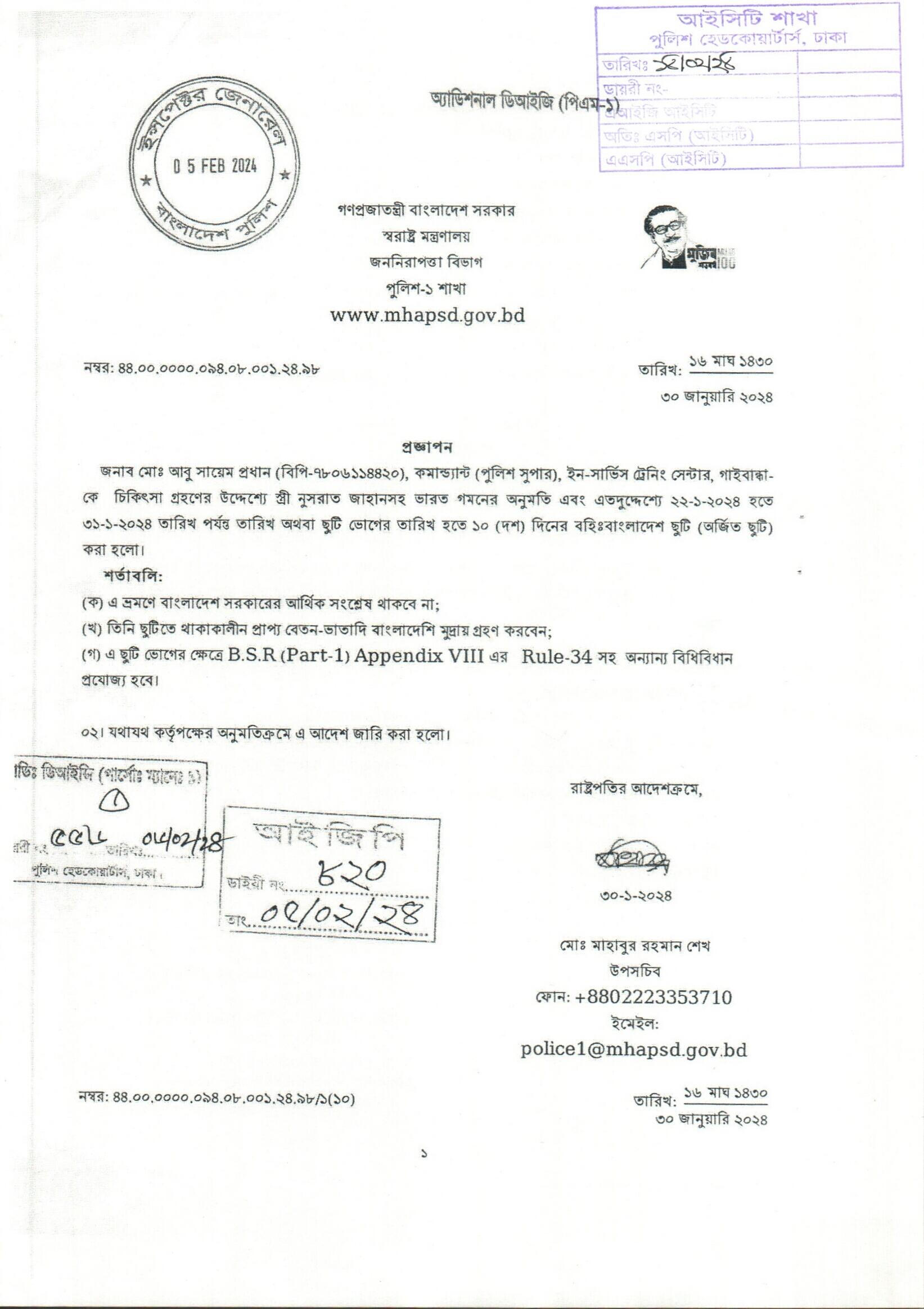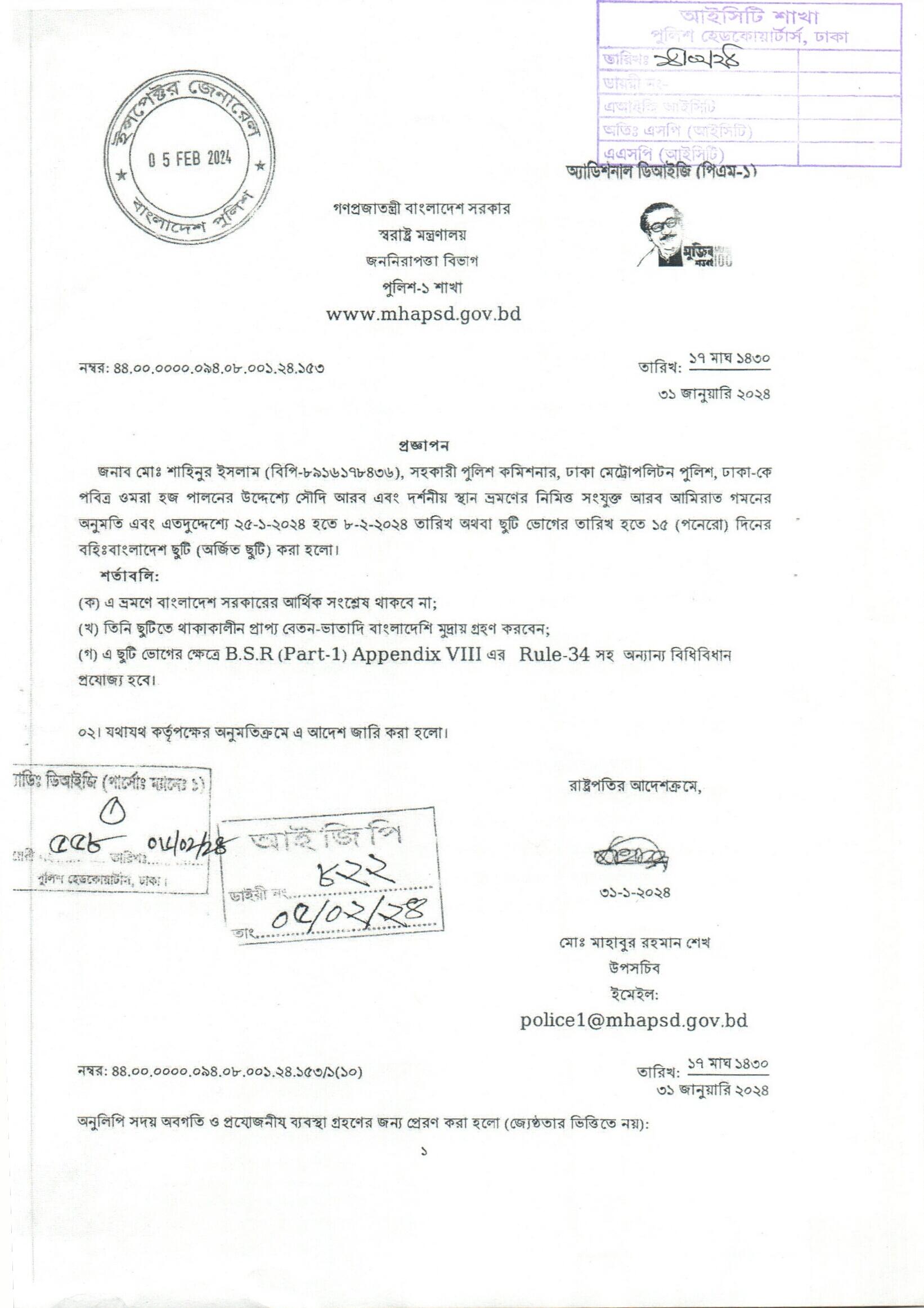 বহিঃ বাংলাদেশ ছুটি, প্রজ্ঞাপন নং- ১৭৩, তারিখঃ ০১/০২/২০২৪ খ্রিঃ।