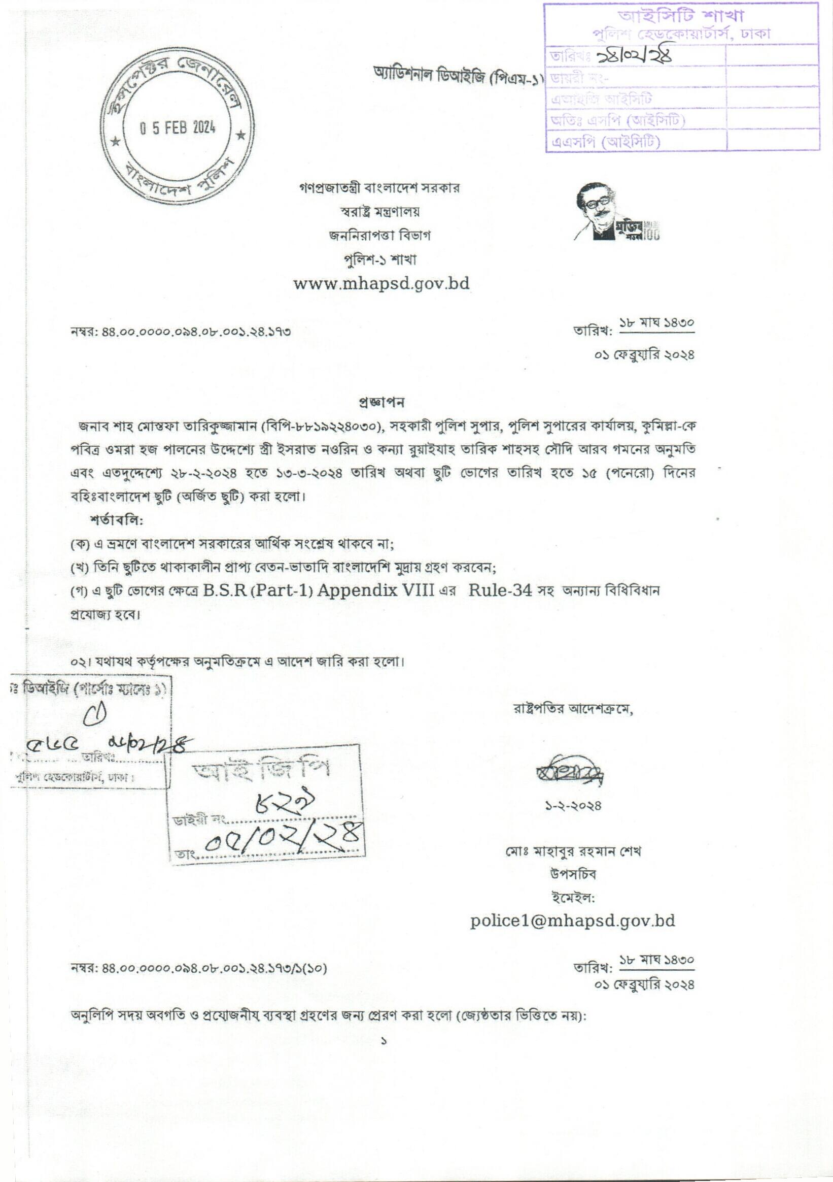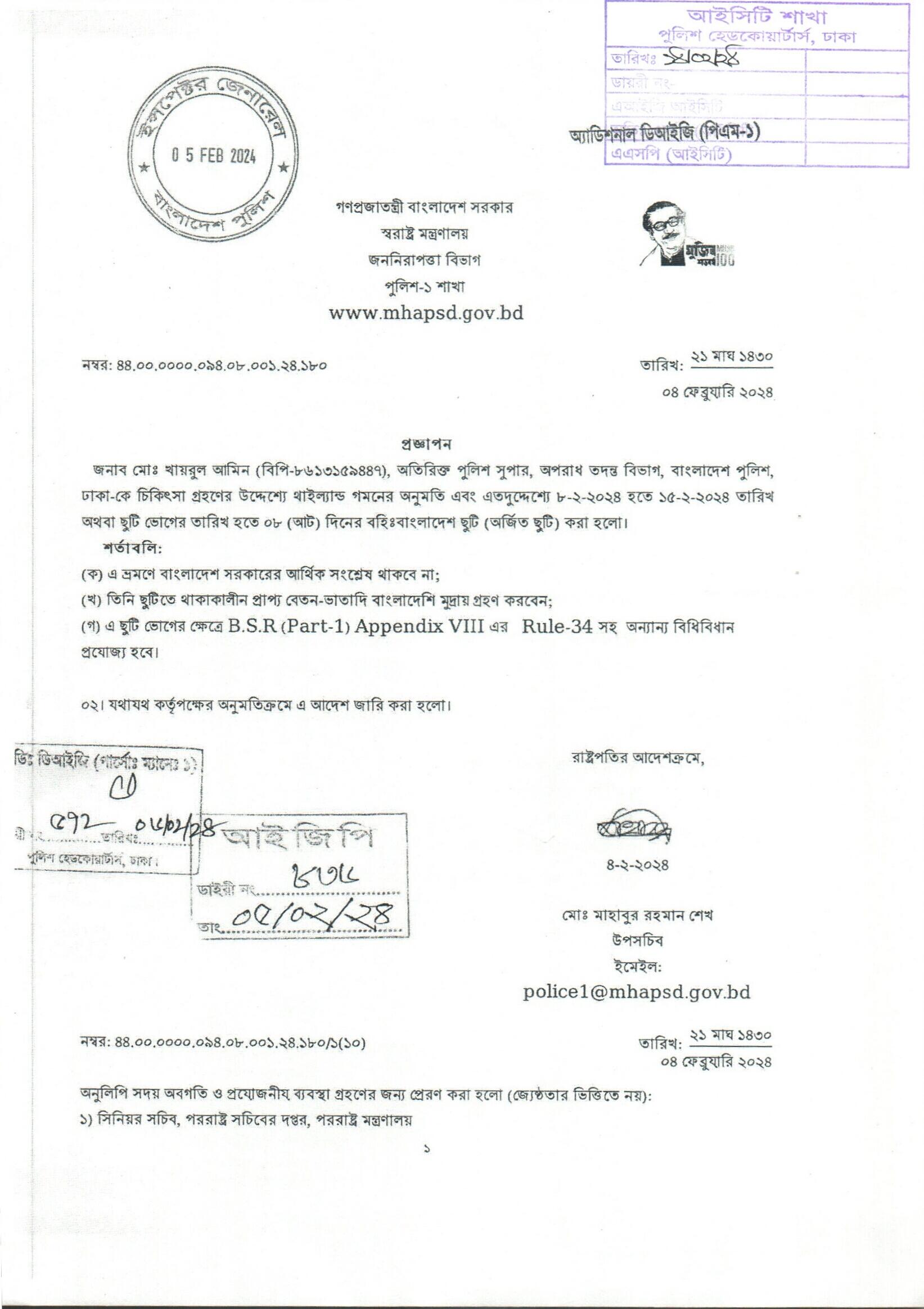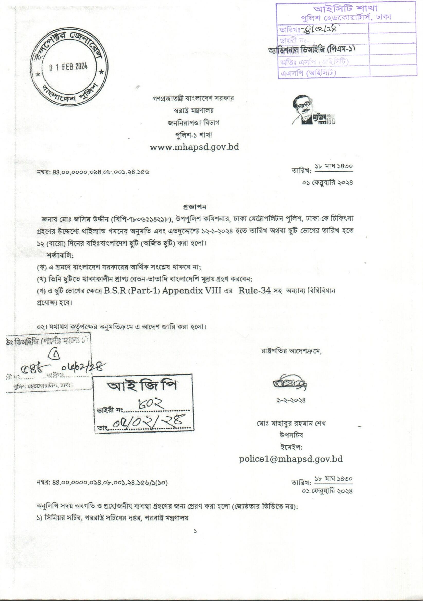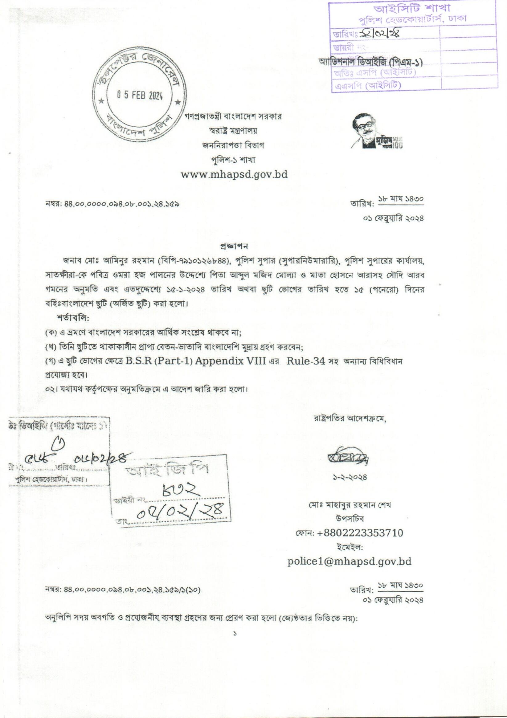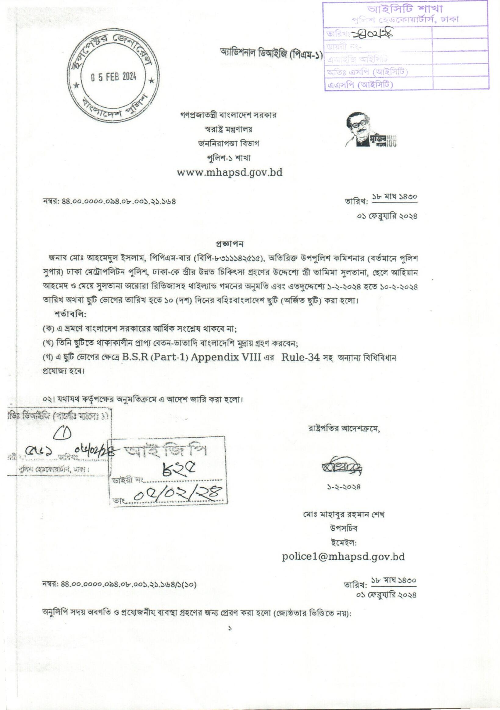 বহিঃ বাংলাদেশ ছুটি, প্রজ্ঞাপন নং- ১৭৩, তারিখঃ ০১/০২/২০২৪ খ্রিঃ।