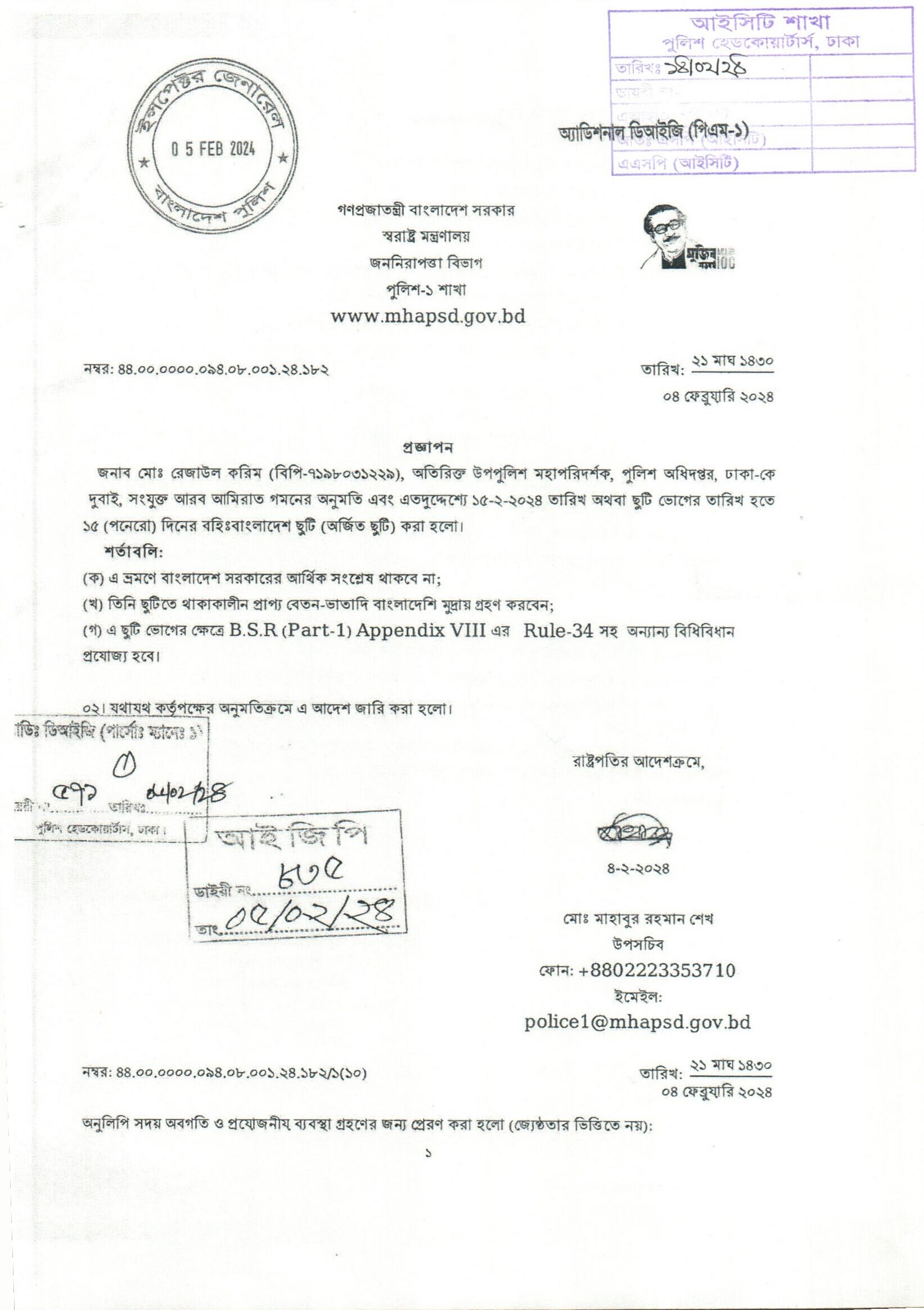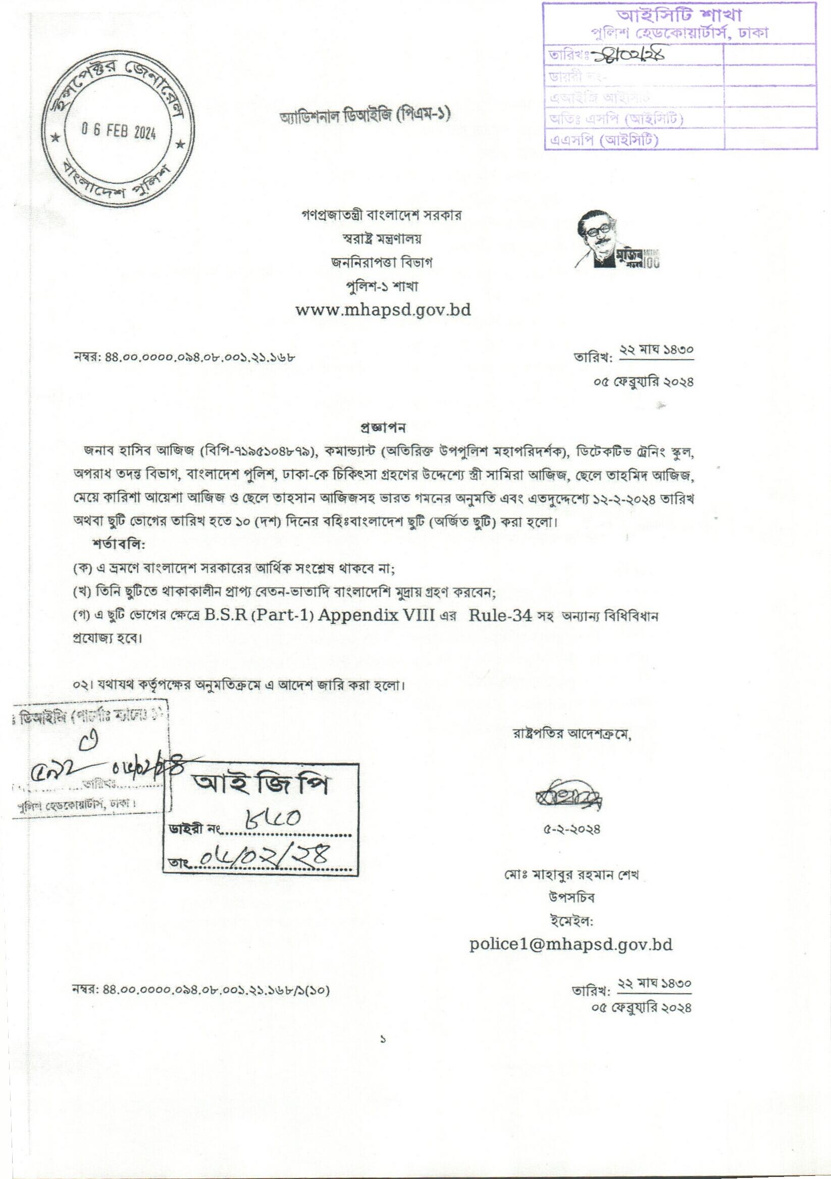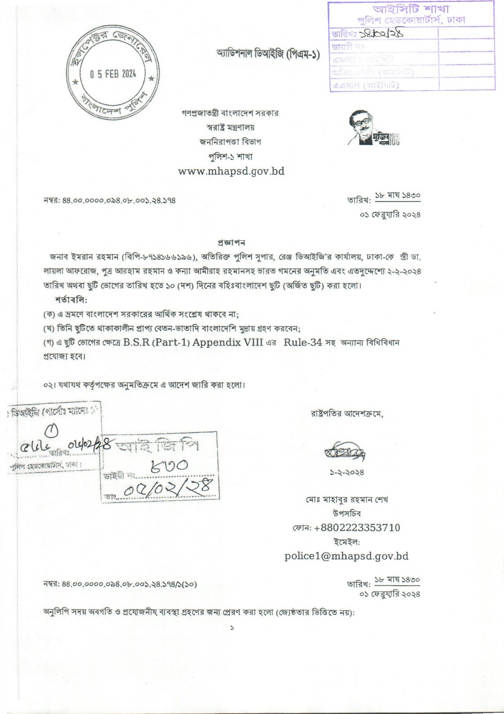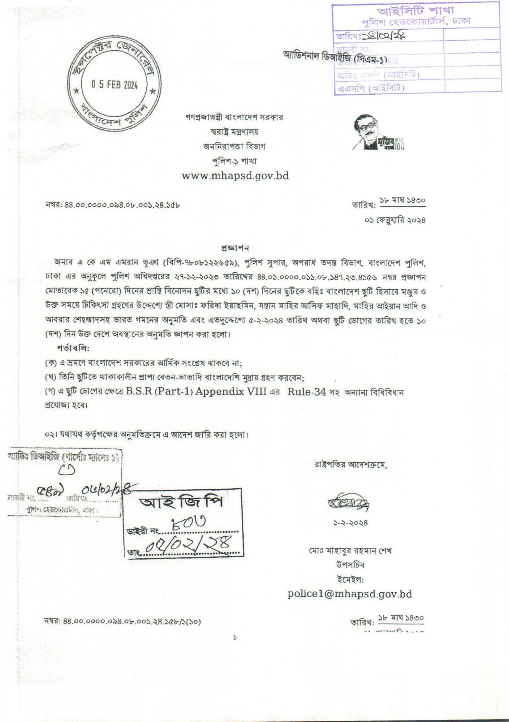 বহিঃ বাংলাদেশ ছুটি, প্রজ্ঞাপন নং- ১৭৩, তারিখঃ ০১/০২/২০২৪ খ্রিঃ।