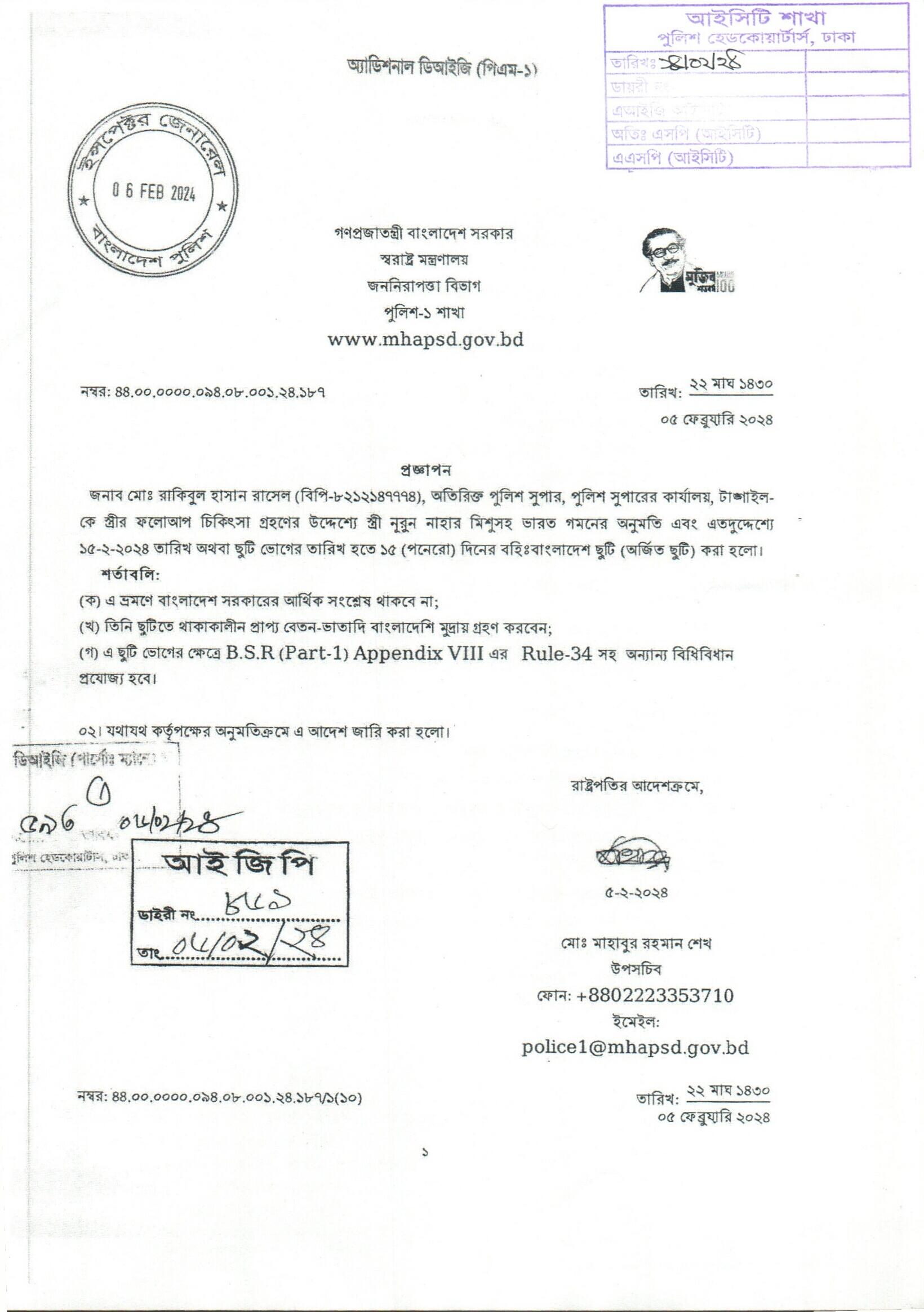 বহিঃ বাংলাদেশ ছুটি, প্রজ্ঞাপন নং- ১৮০, তারিখঃ ০৪/০২/২০২৪ খ্রিঃ।