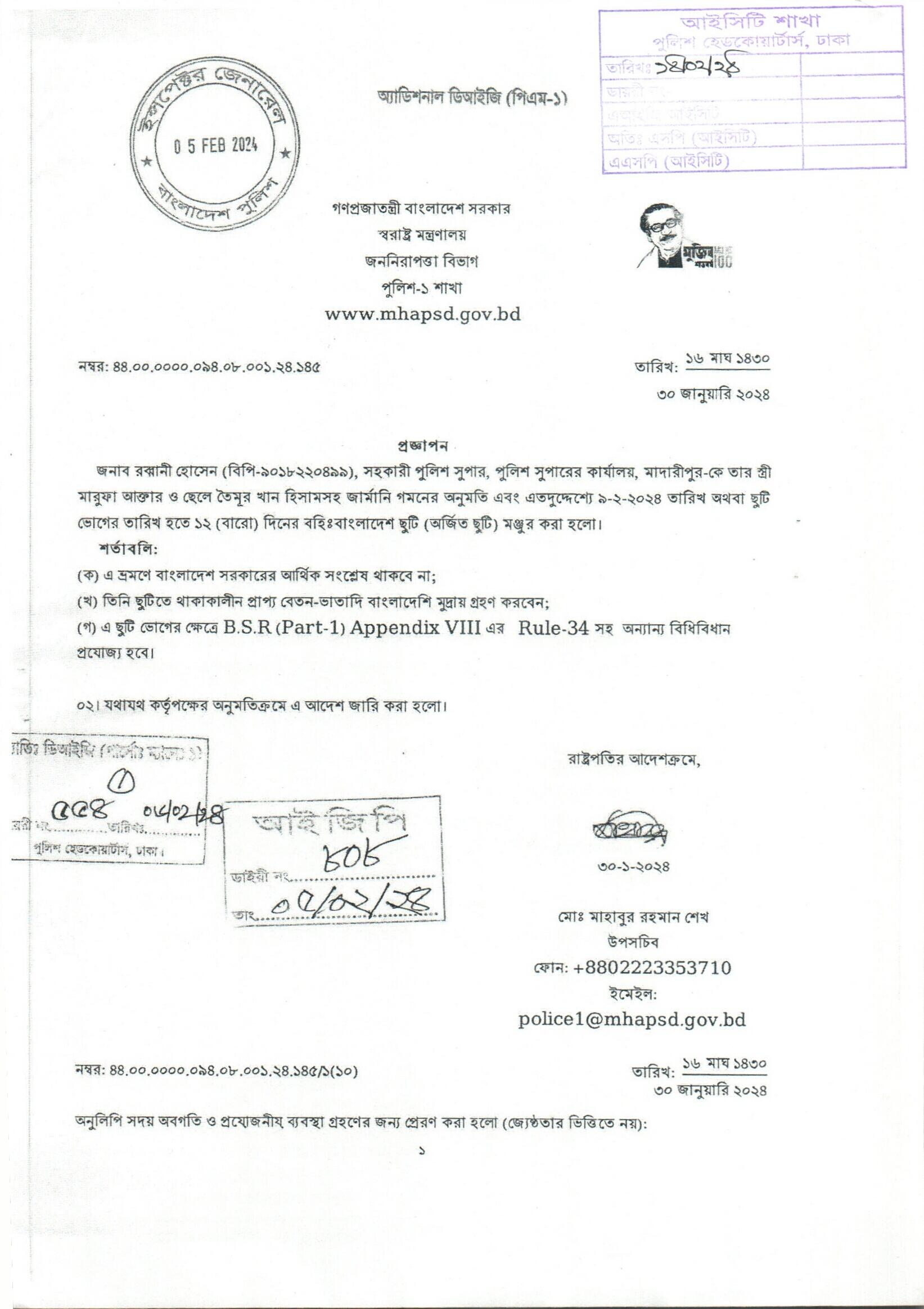 বহিঃ বাংলাদেশ ছুটি, প্রজ্ঞাপন নং- ৯৮, তারিখঃ ৩০/০১/২০২৪ খ্রিঃ।