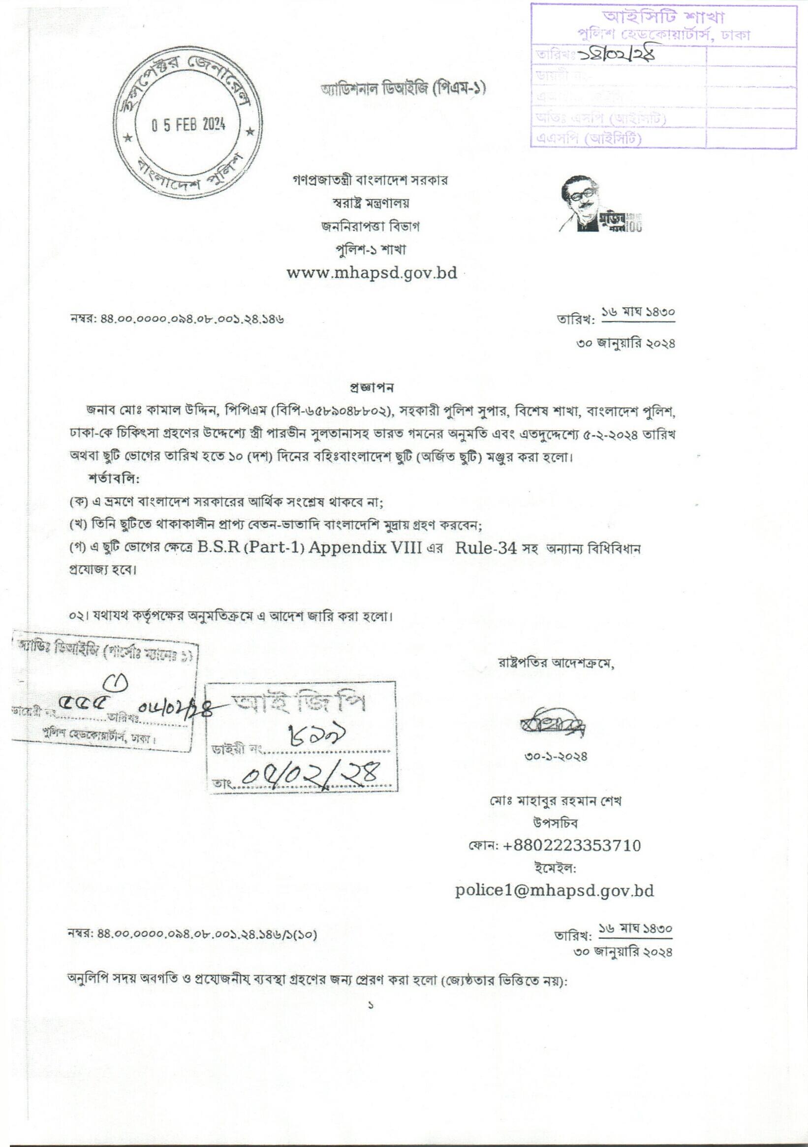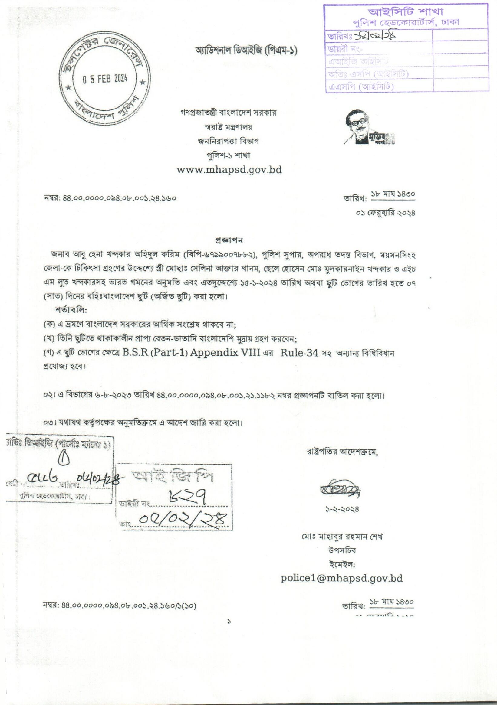 বহিঃ বাংলাদেশ ছুটি, প্রজ্ঞাপন নং- ১৫৮, তারিখঃ ০১/০২/২০২৪ খ্রিঃ।