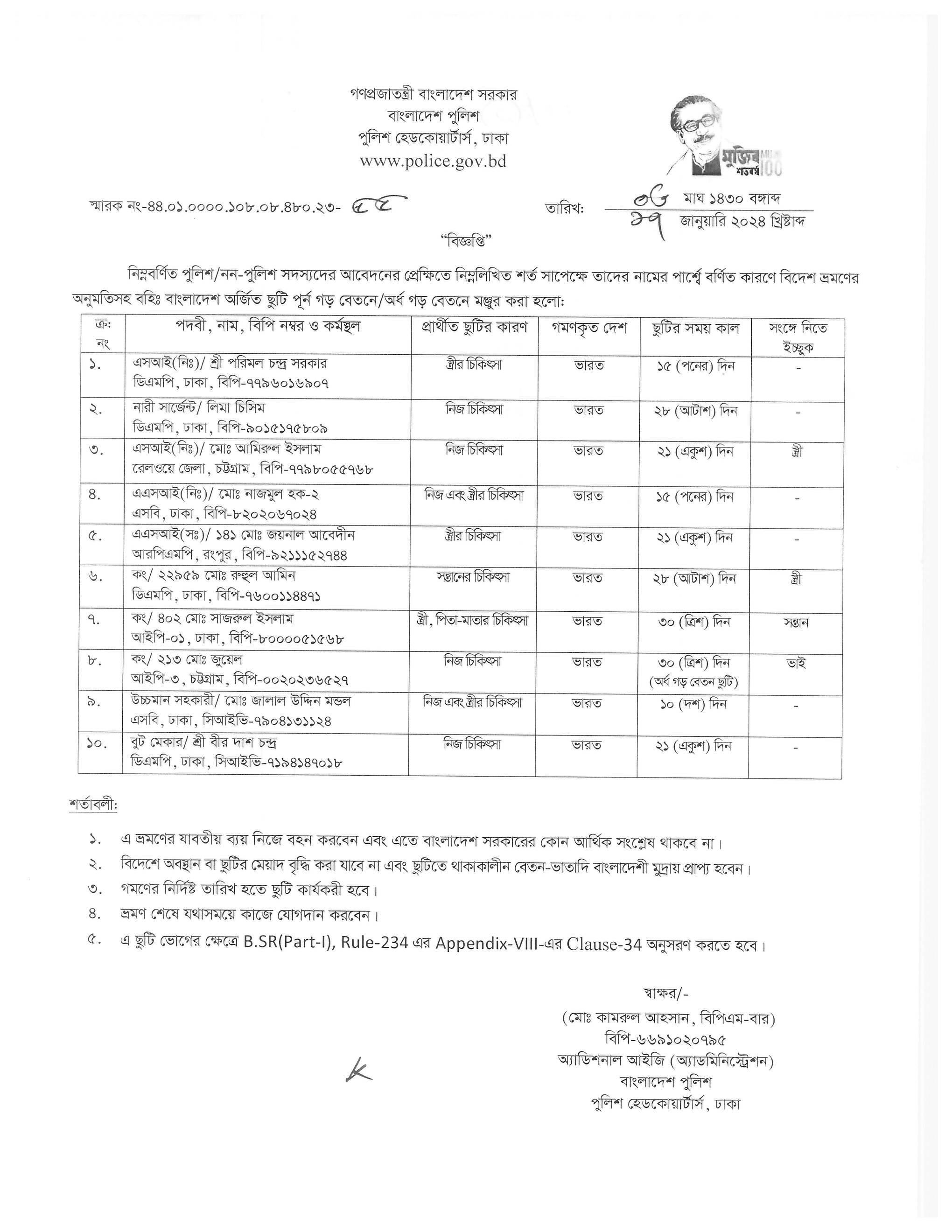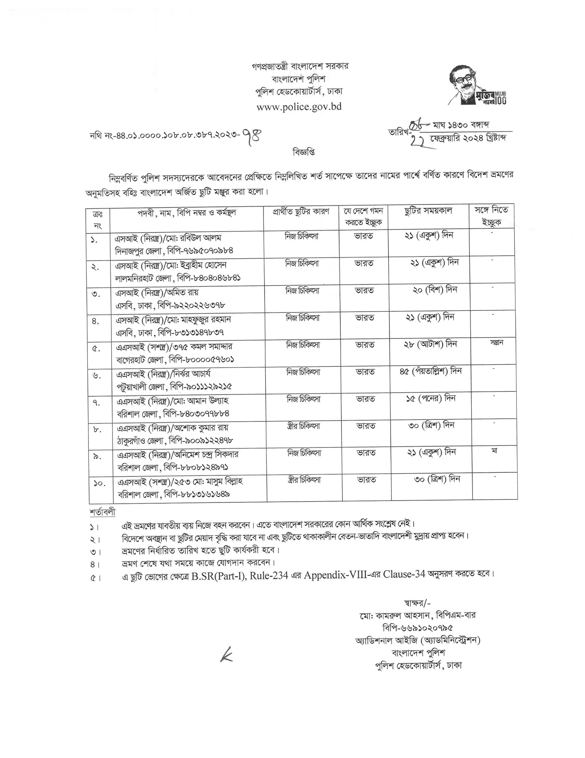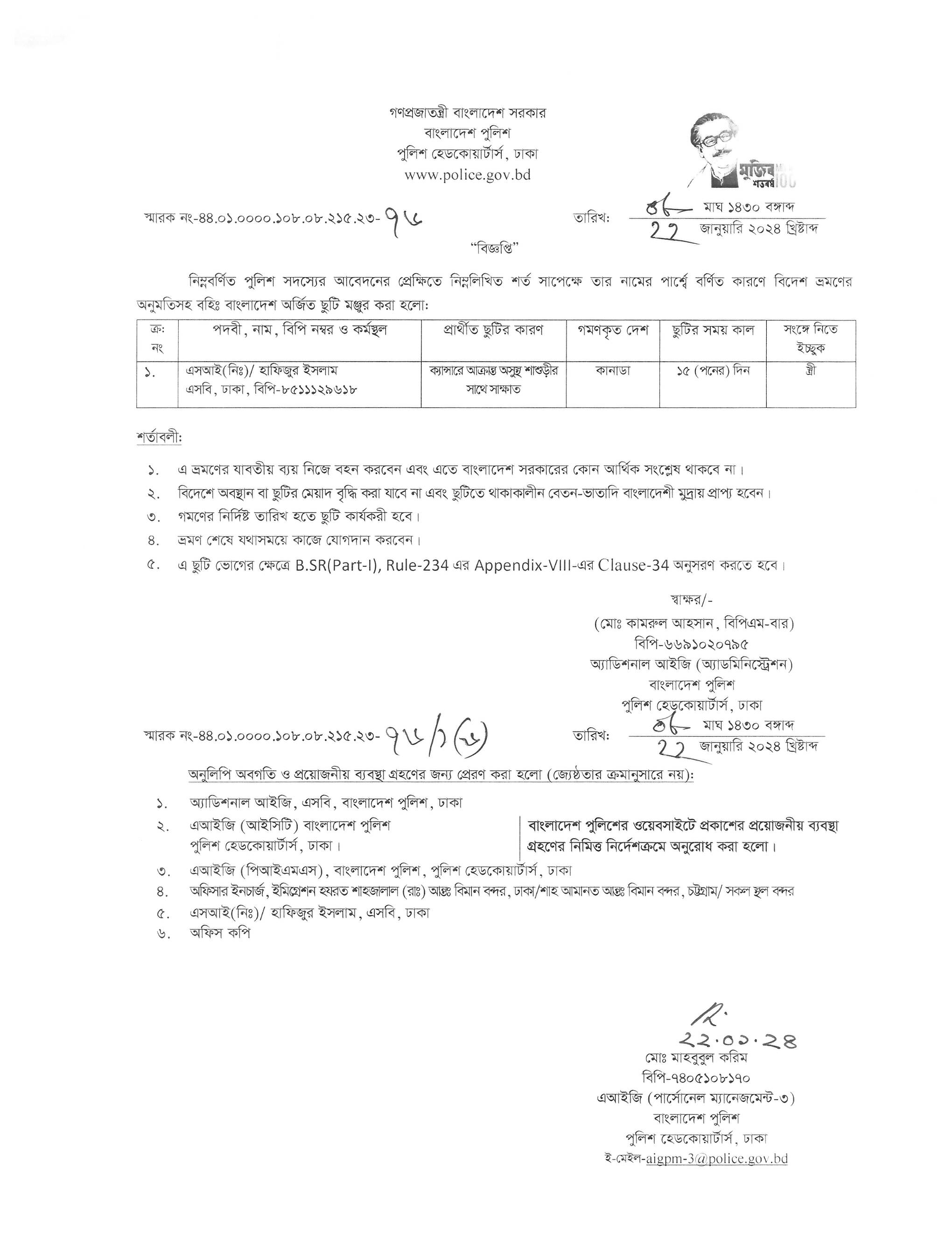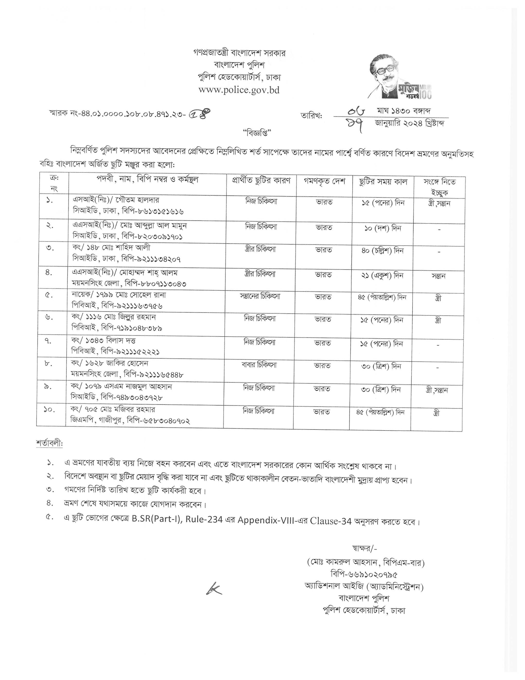 বহিঃ বাংলাদেশ ছুটি, বিজ্ঞপ্তি নং- ৪৯, তারিখঃ ১৬/০১/২০২৪ খ্রিঃ।