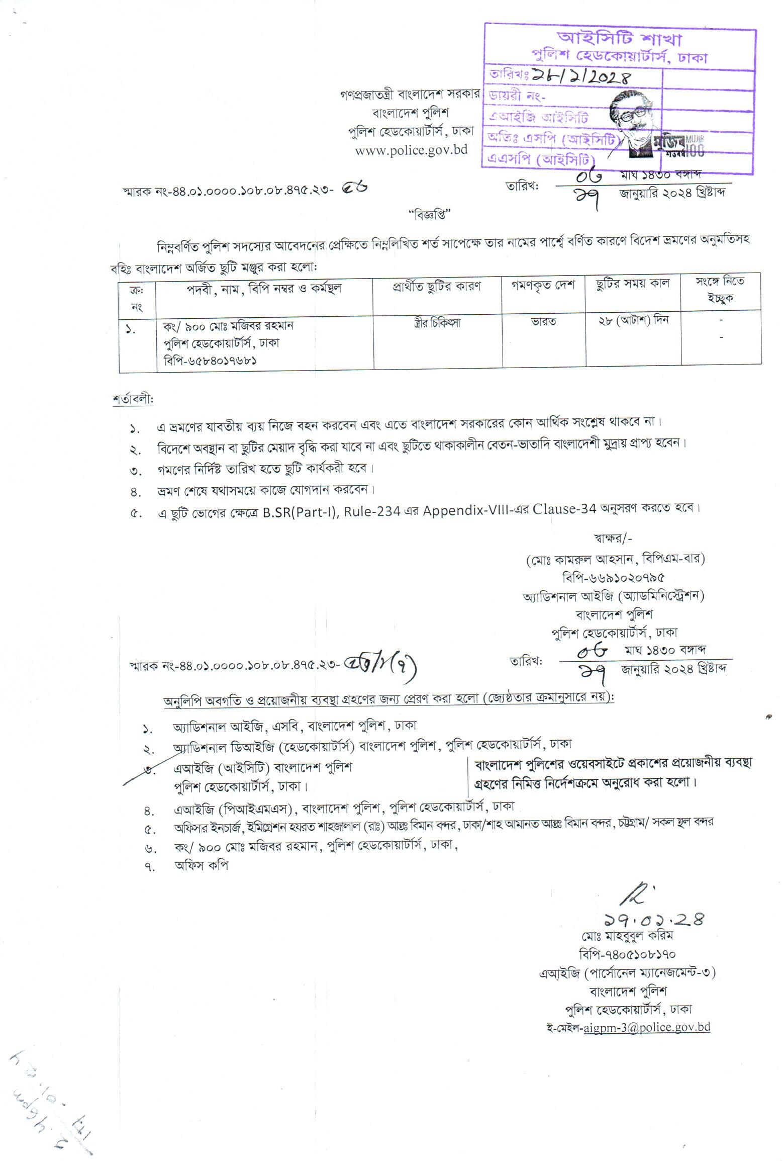 বহিঃ বাংলাদেশ ছুটি, বিজ্ঞপ্তি নং- ৬১, তারিখঃ ১৮/০১/২০২৪ খ্রিঃ।