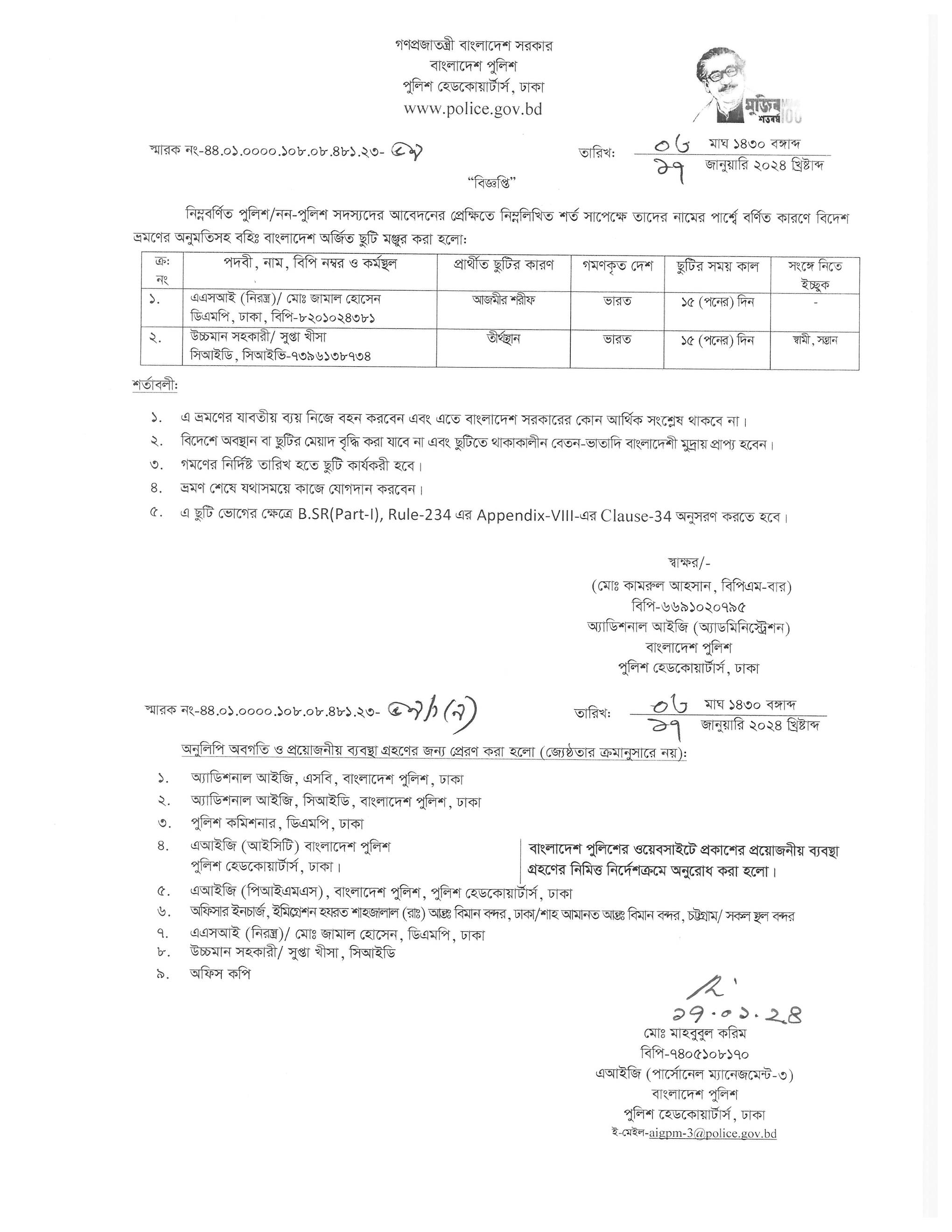 বহিঃ বাংলাদেশ ছুটি, বিজ্ঞপ্তি নং- ৪৮, তারিখঃ ১৬/০১/২০২৪ খ্রিঃ।