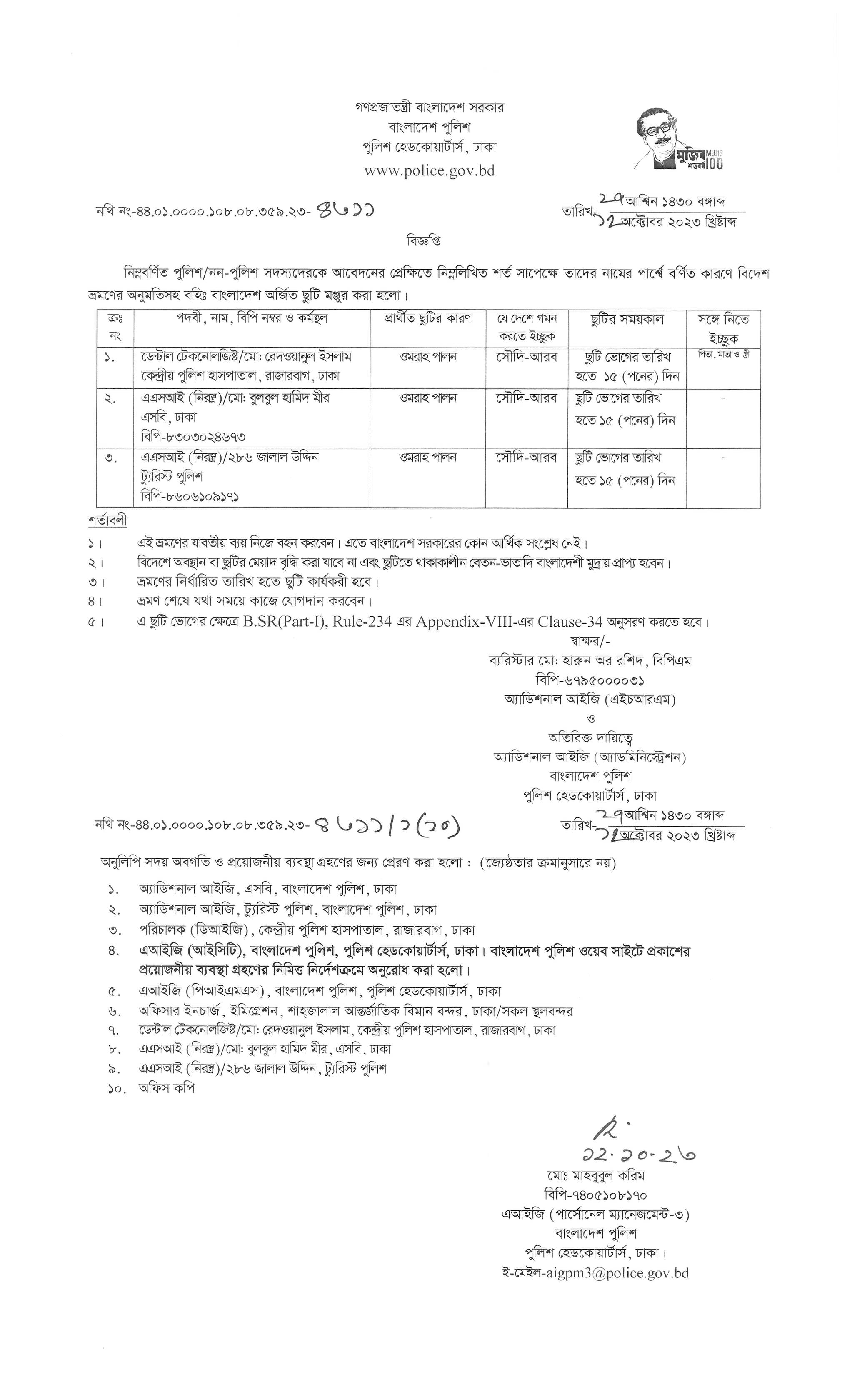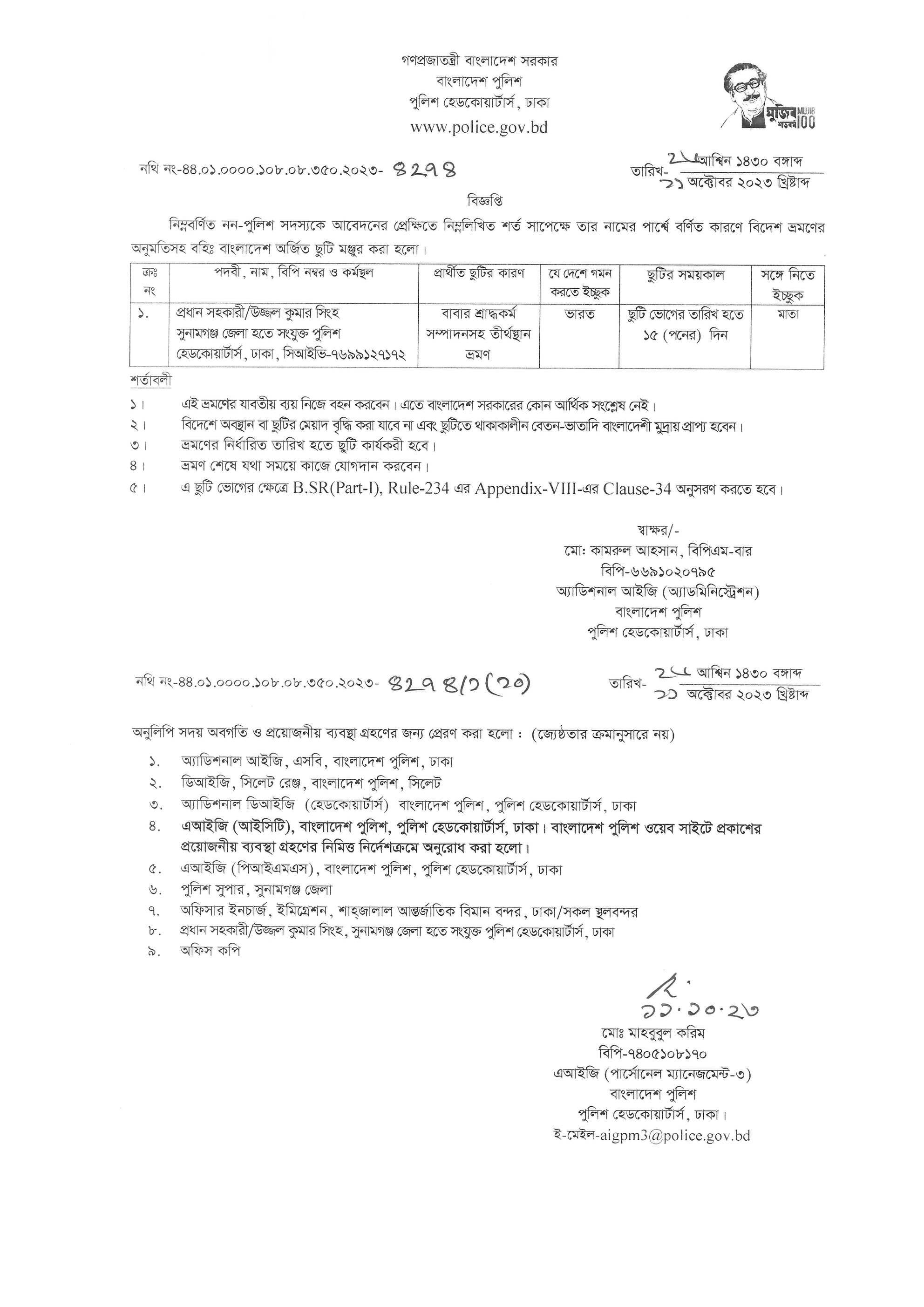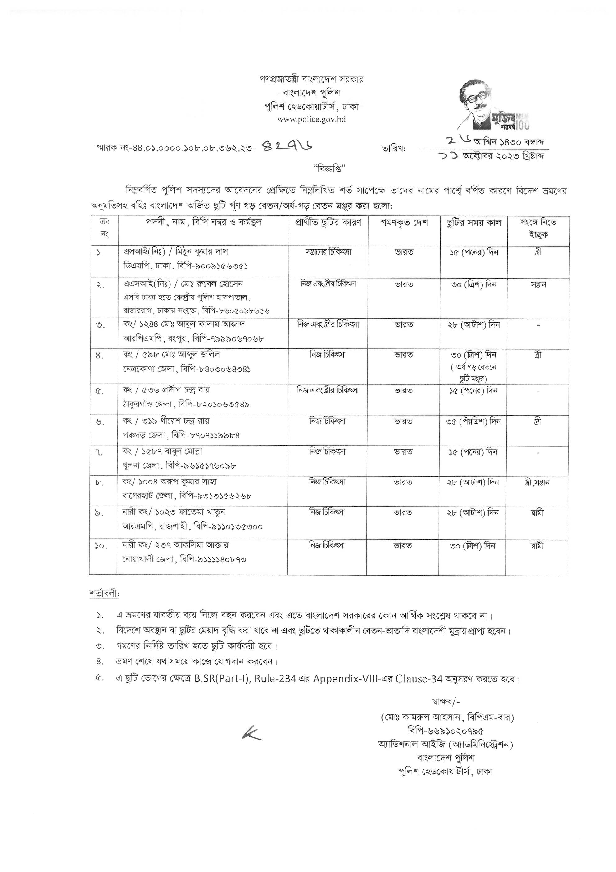 বহিঃ বাংলাদেশ ছুটি, প্রজ্ঞাপন নং-১২৯৬, তারিখঃ ১৫/১০/২০২৩ খ্রিঃ।