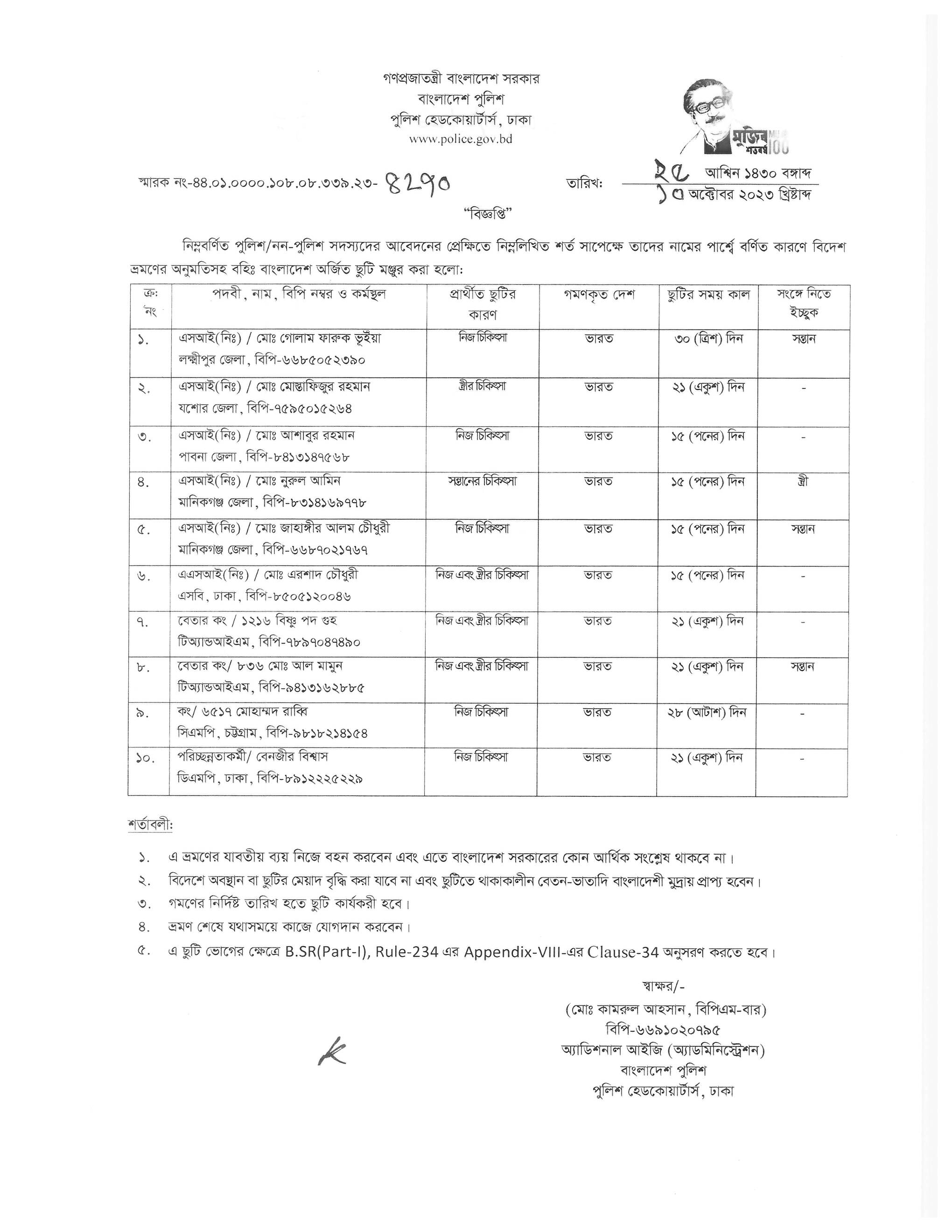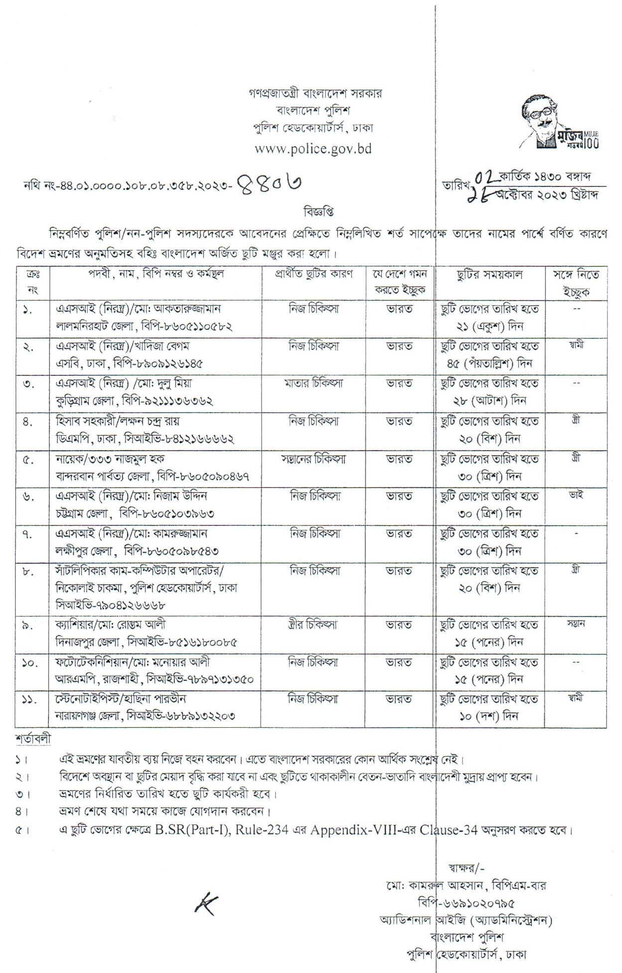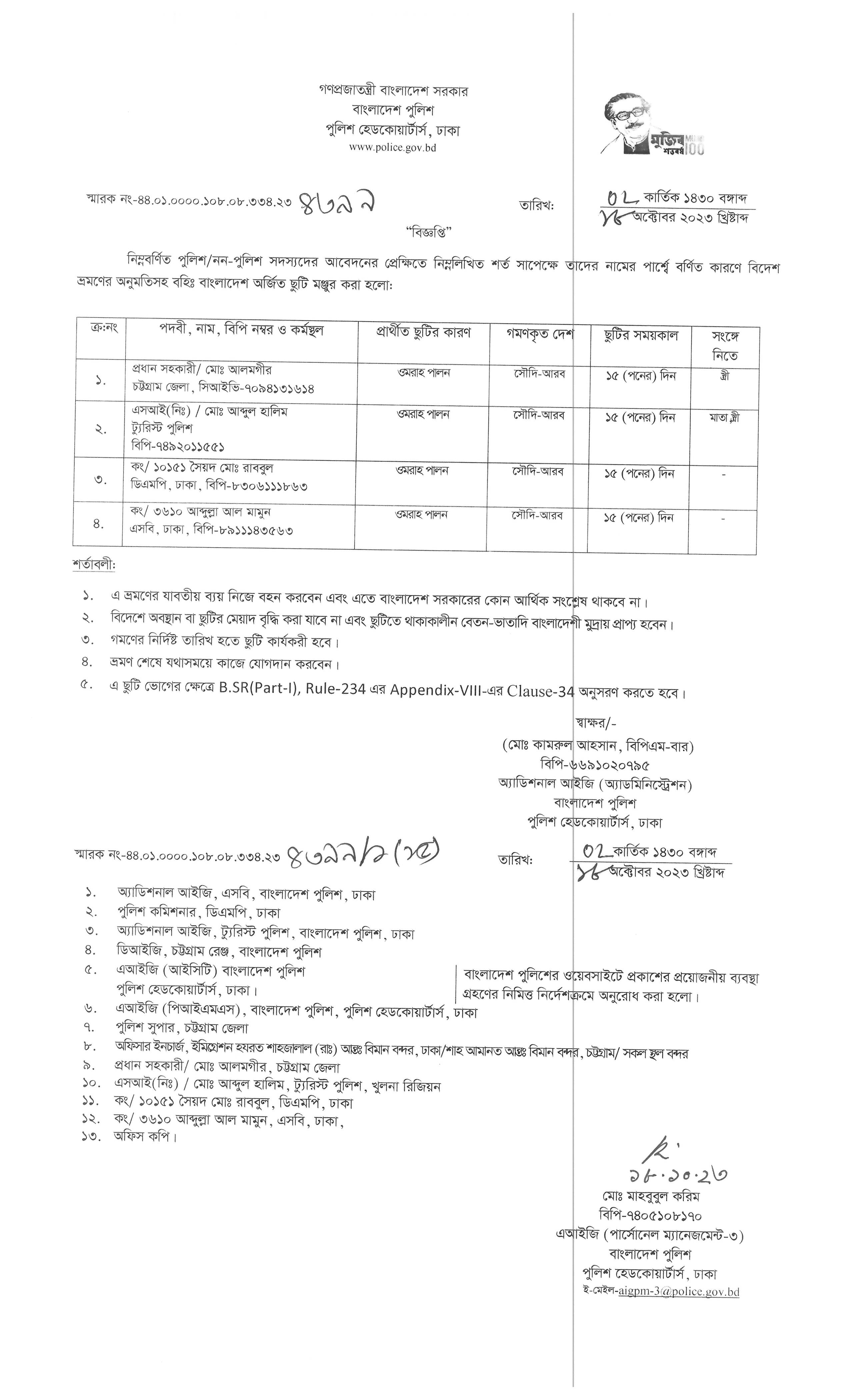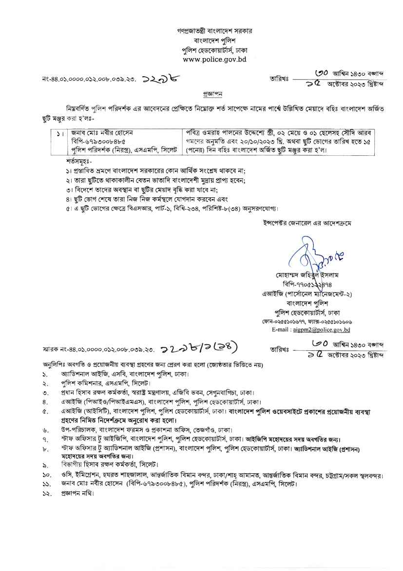 বহিঃ বাংলাদেশ ছুটি, বিজ্ঞপ্তি নং-৪২৩২ তারিখঃ ০৯/১০/২০২৩ খ্রিঃ।