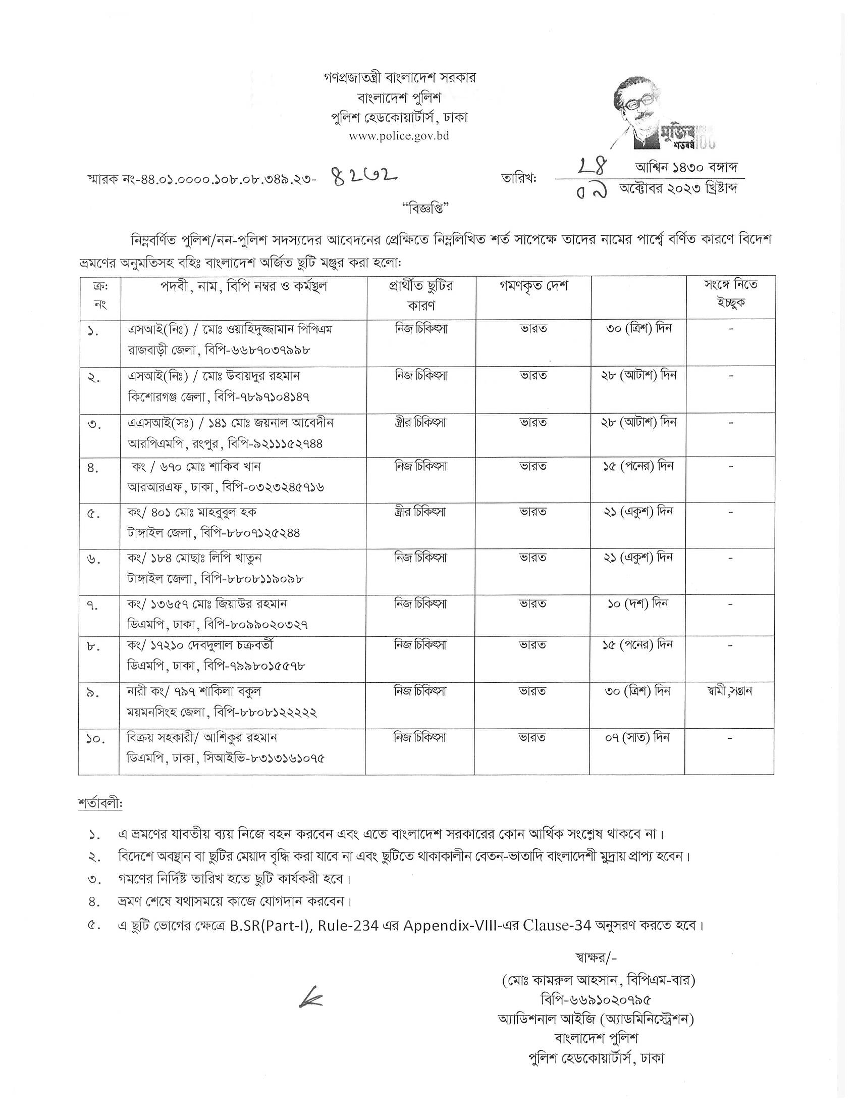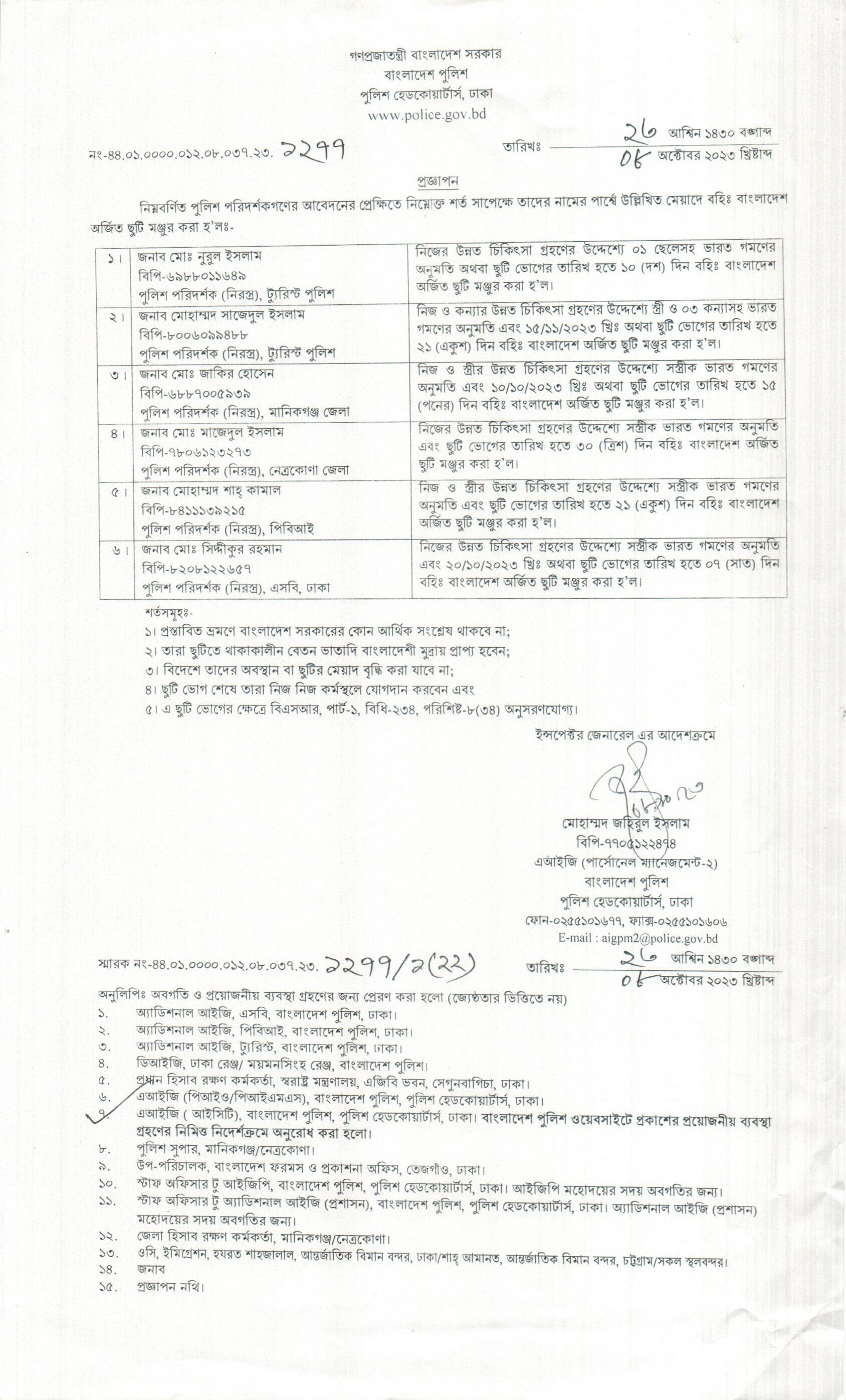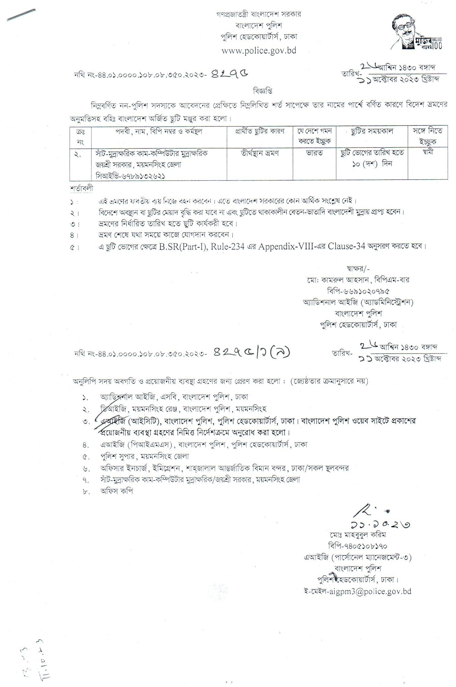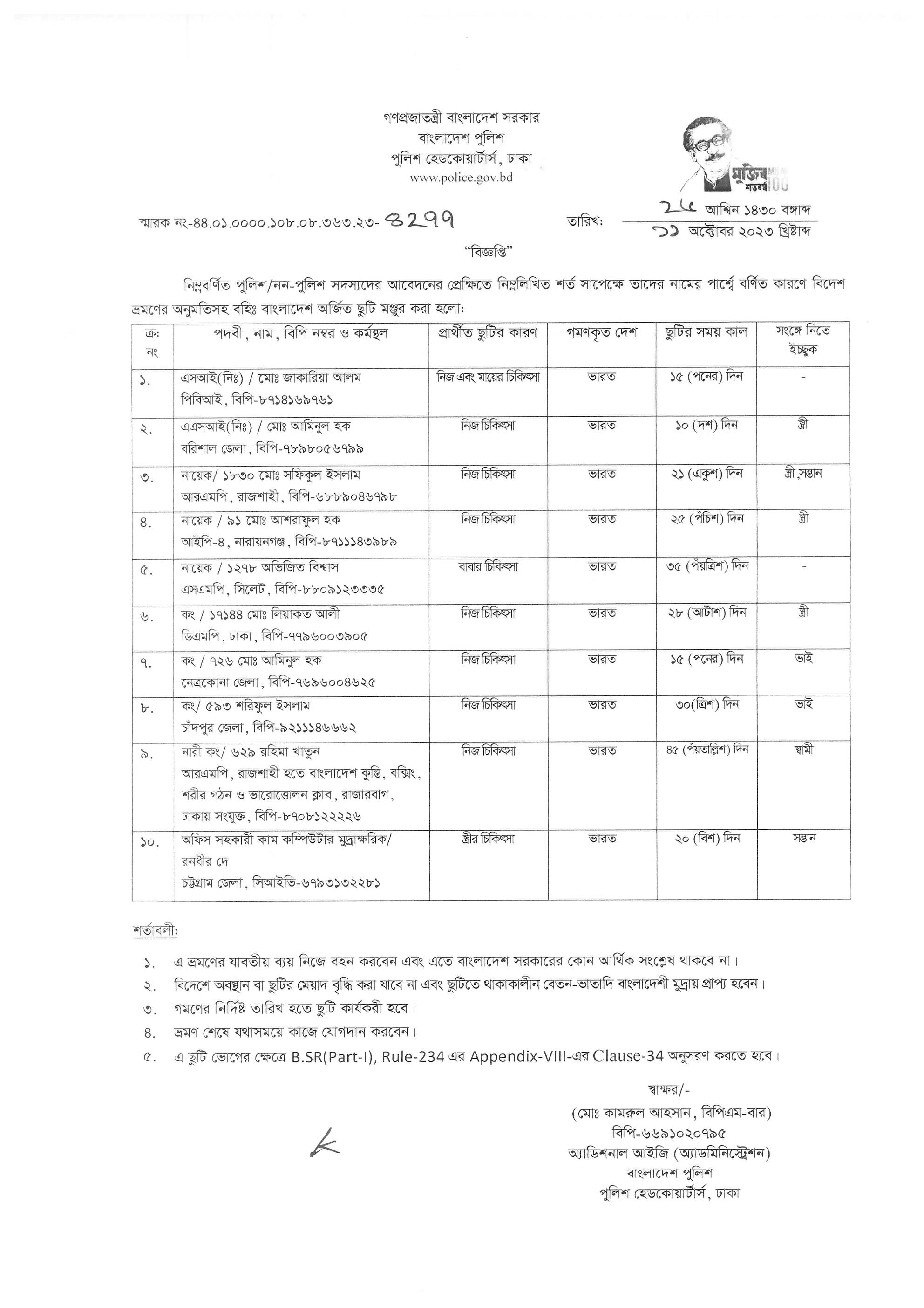 বহিঃ বাংলাদেশ ছুটি, বিজ্ঞপ্তি নং-৪২৩২ তারিখঃ ০৯/১০/২০২৩ খ্রিঃ।