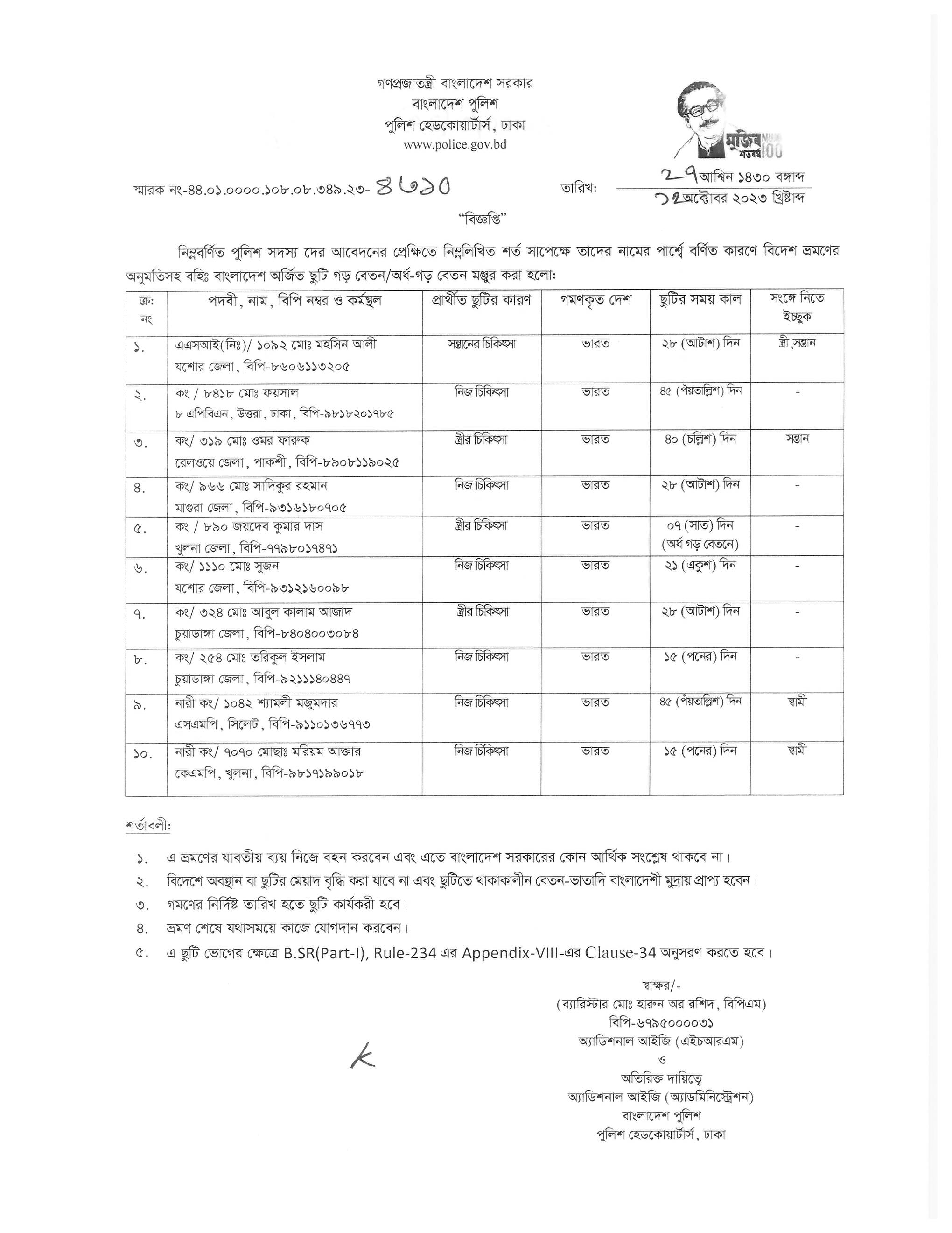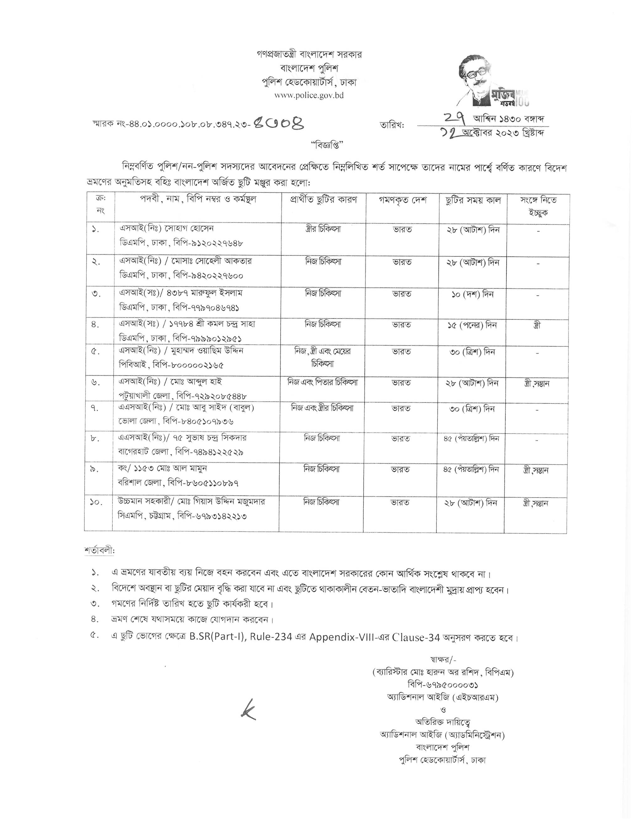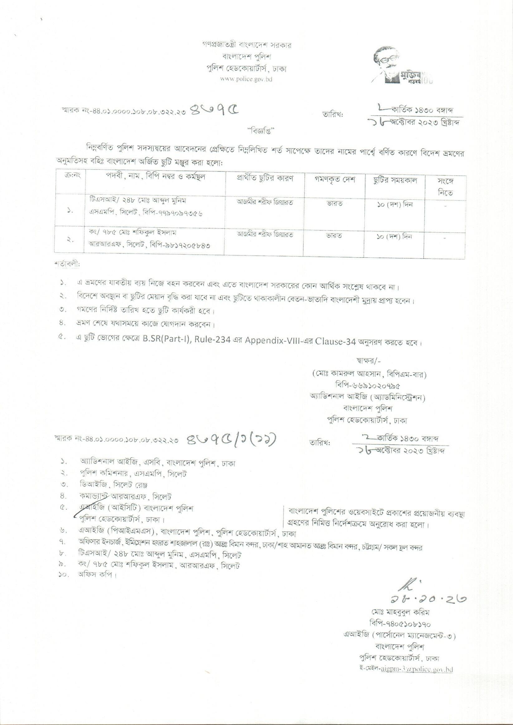 বহিঃ বাংলাদেশ ছুটি, প্রজ্ঞাপন নং-১২৭৭, তারিখঃ ০৮/১০/২০২৩ খ্রিঃ।