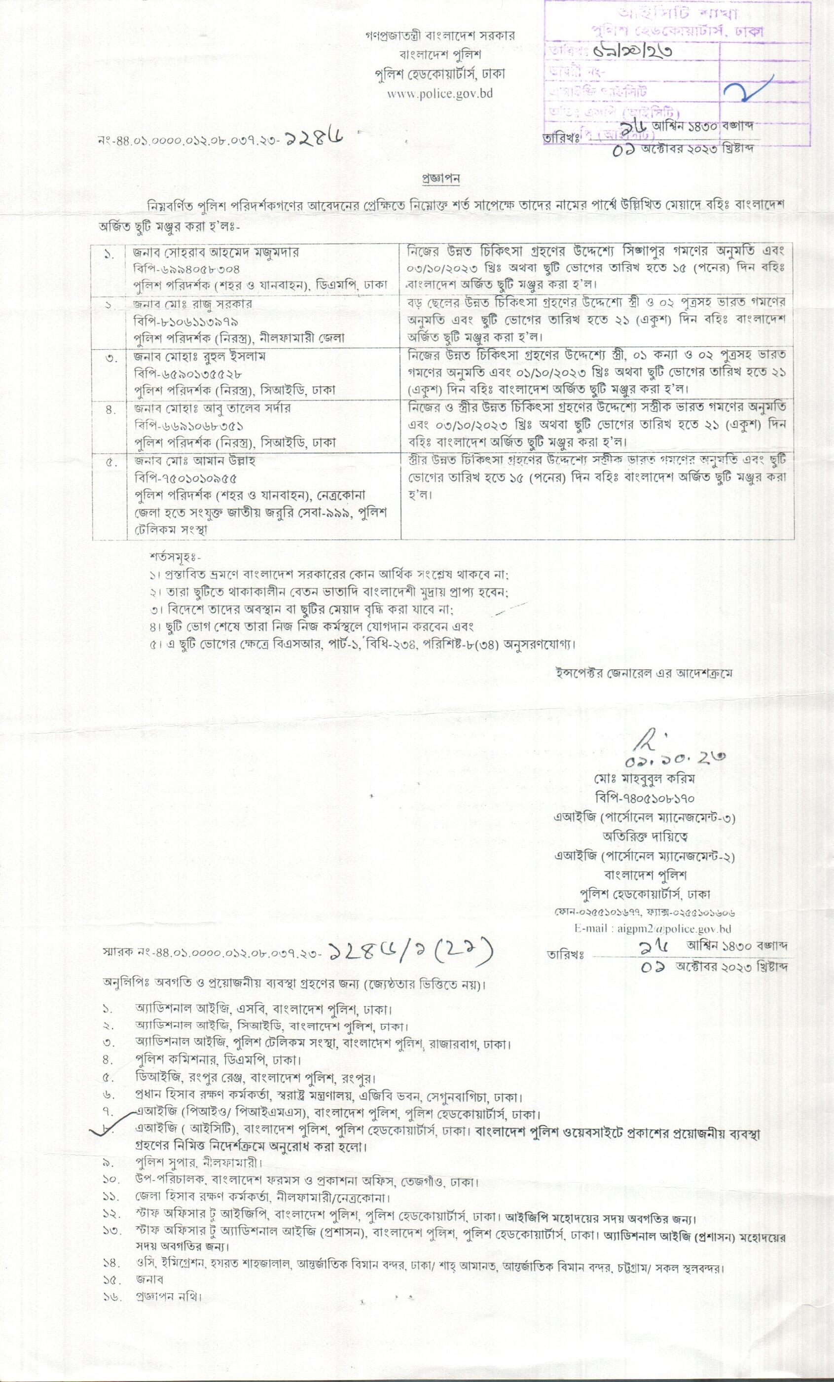 বহিঃ বাংলাদেশ ছুটি, প্রজ্ঞাপন নং-১২৫৪, তারিখঃ ০৪/১০/২০২৩ খ্রিঃ।