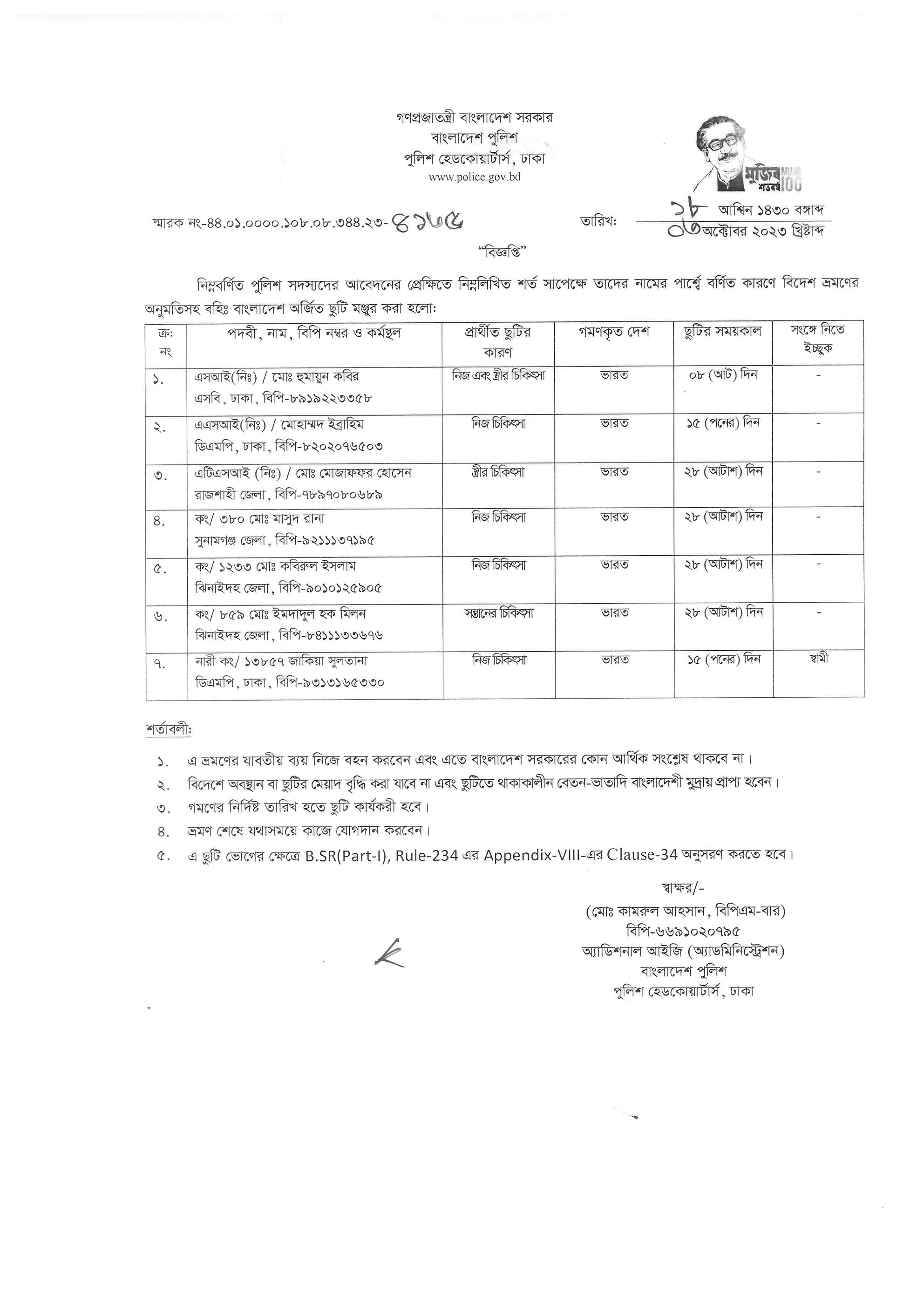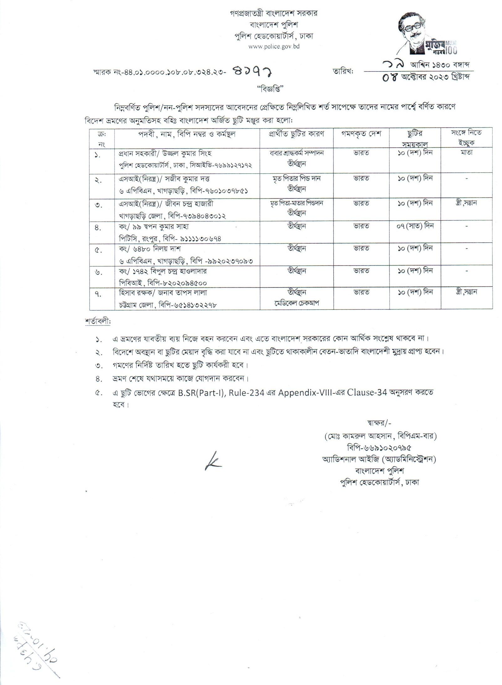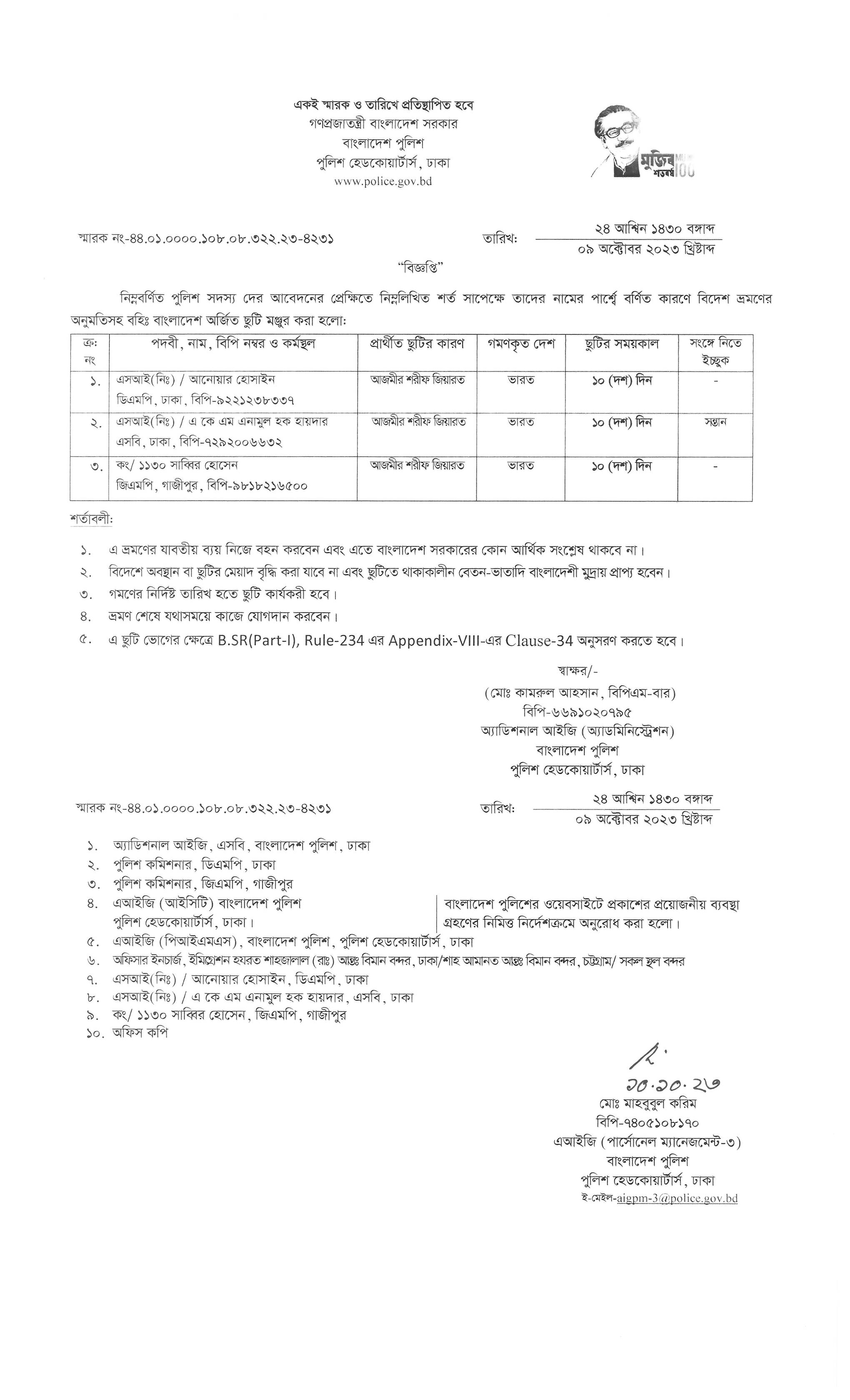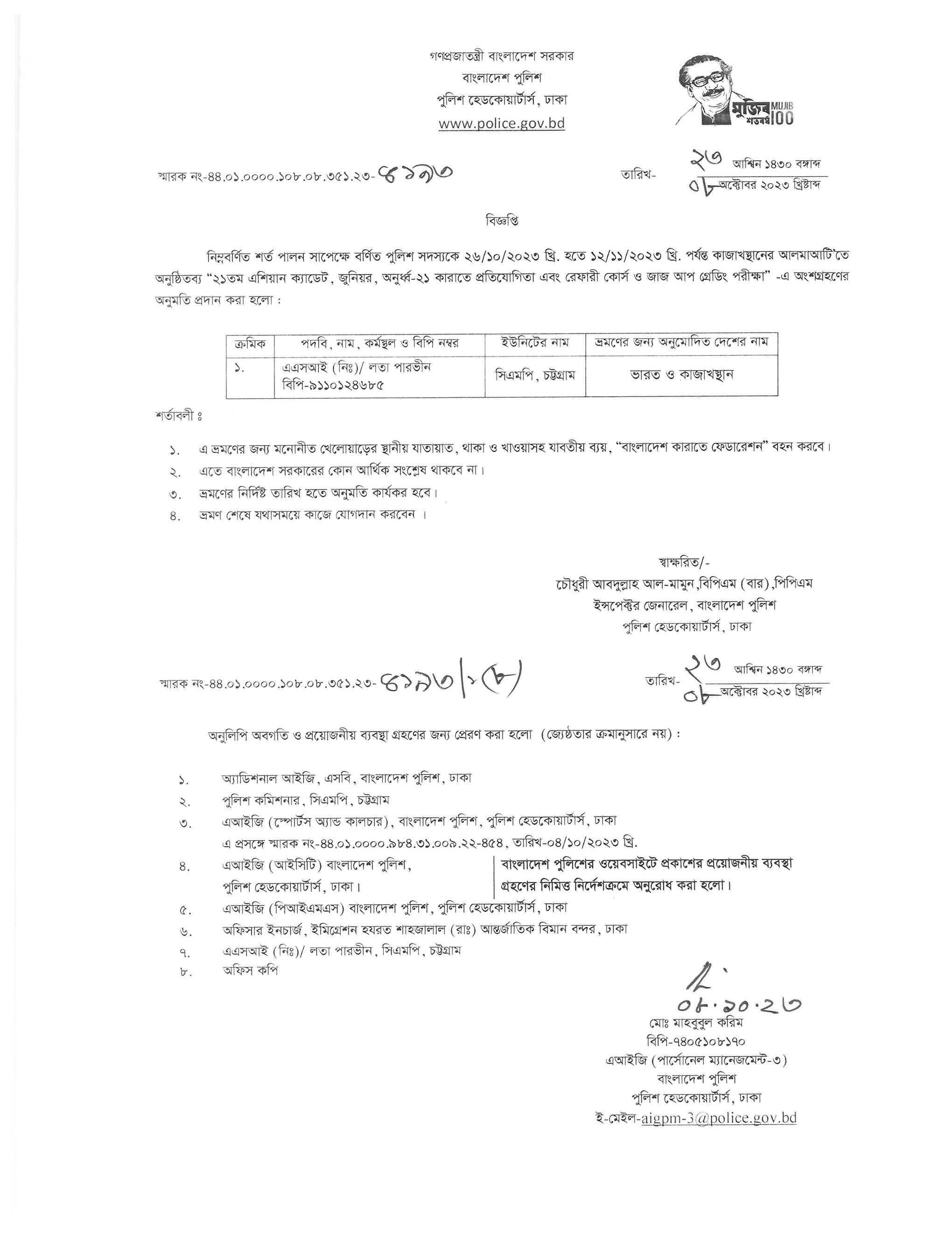 বহিঃ বাংলাদেশ গমন, বিজ্ঞপ্তি নং-৪১৯৩ তারিখঃ ০৮/১০/২০২৩ খ্রিঃ।