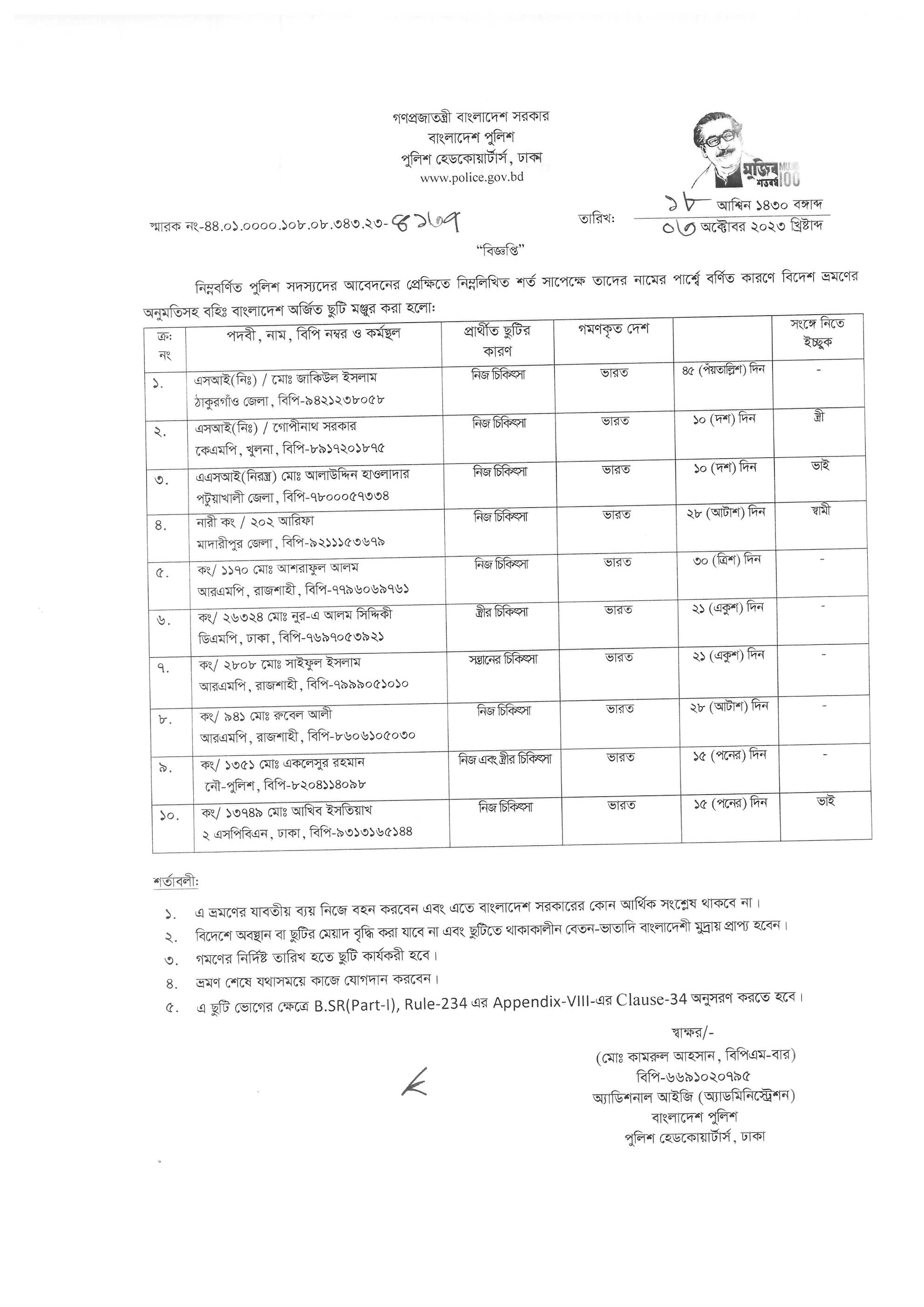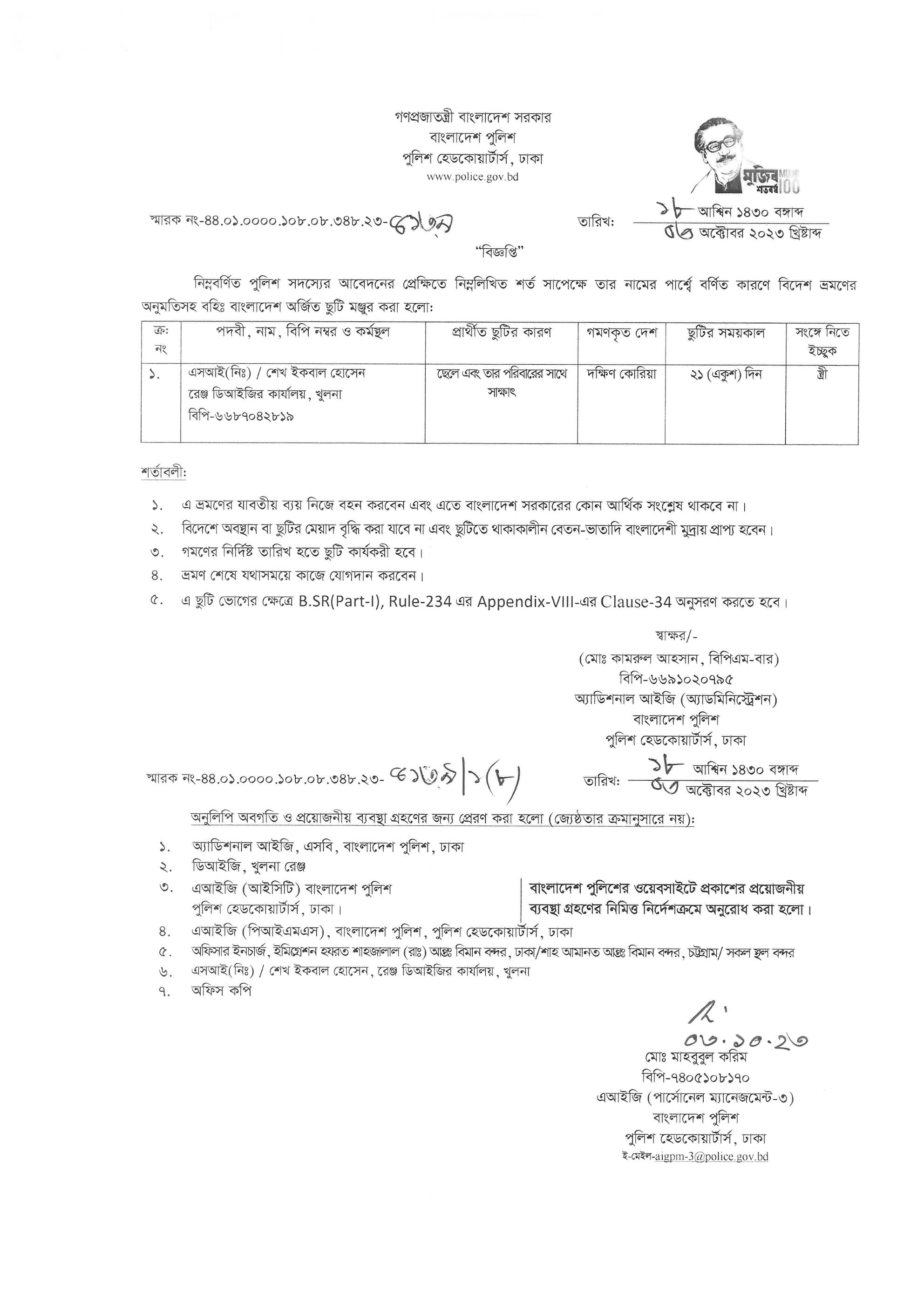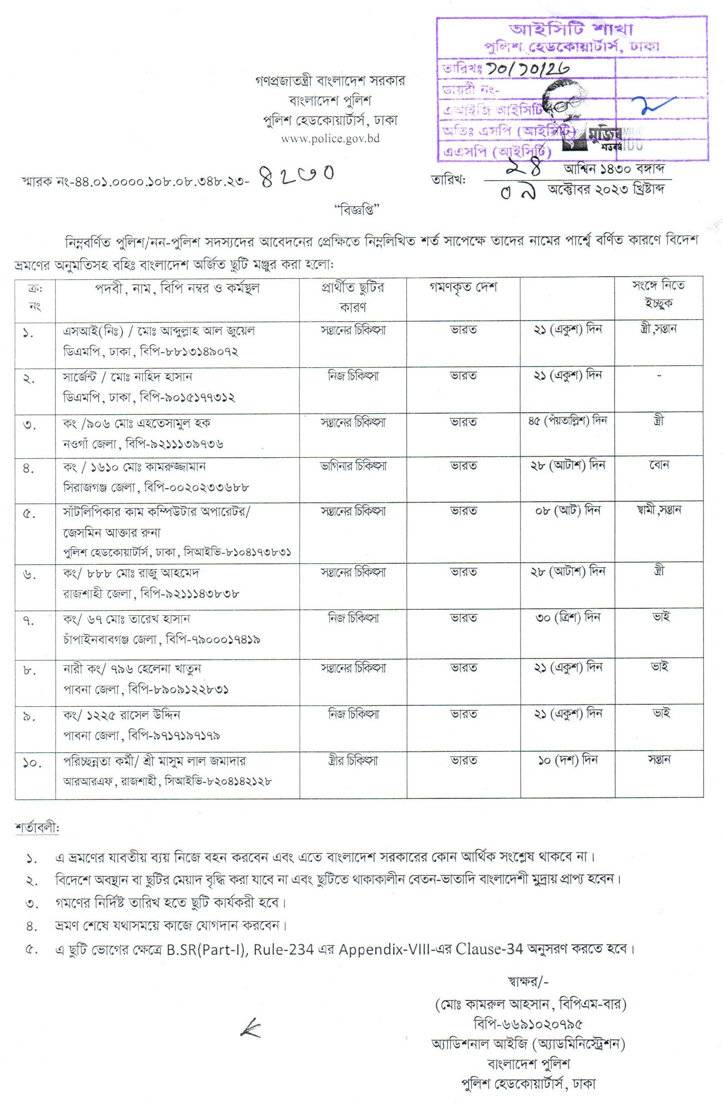 বহিঃ বাংলাদেশ গমন, বিজ্ঞপ্তি নং-৪১৯৩ তারিখঃ ০৮/১০/২০২৩ খ্রিঃ।