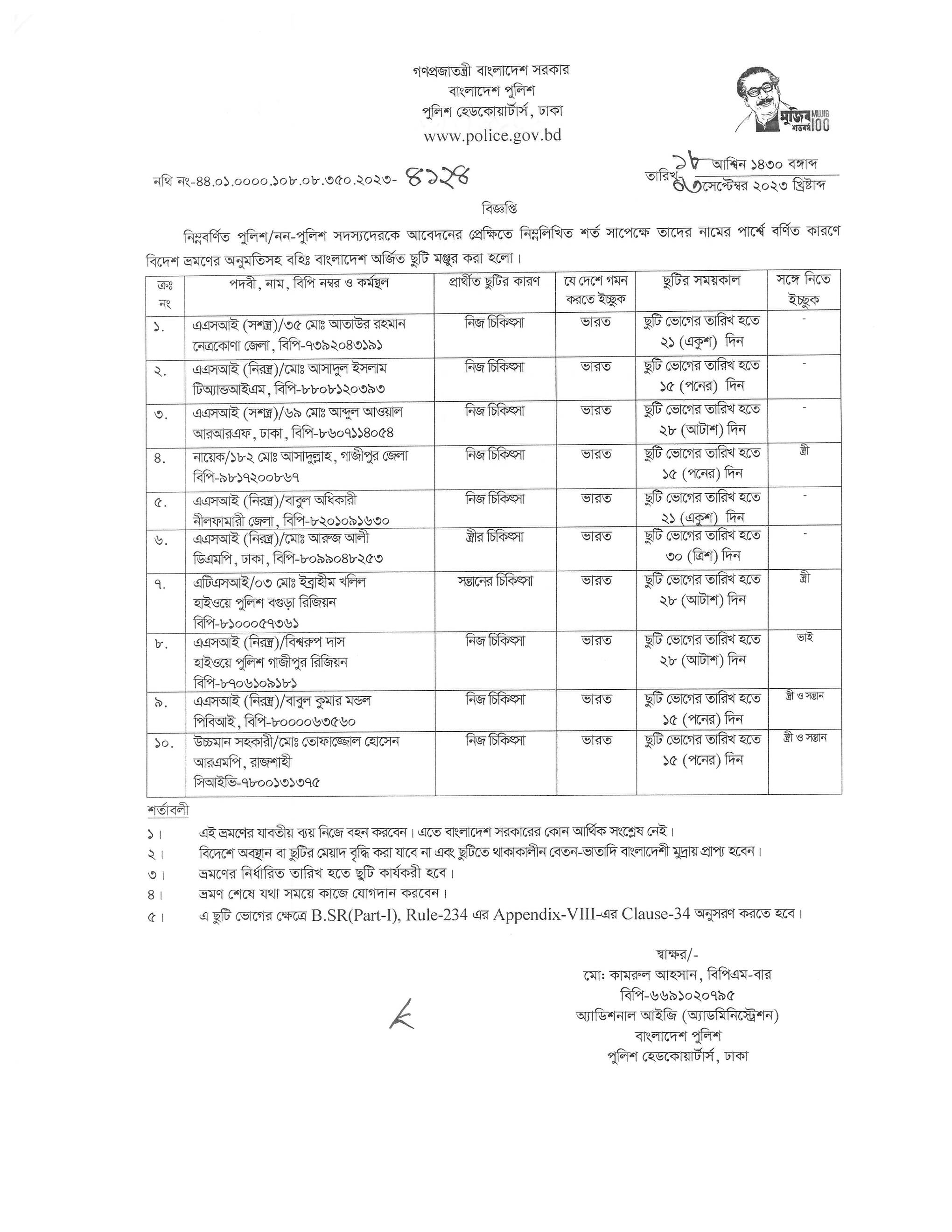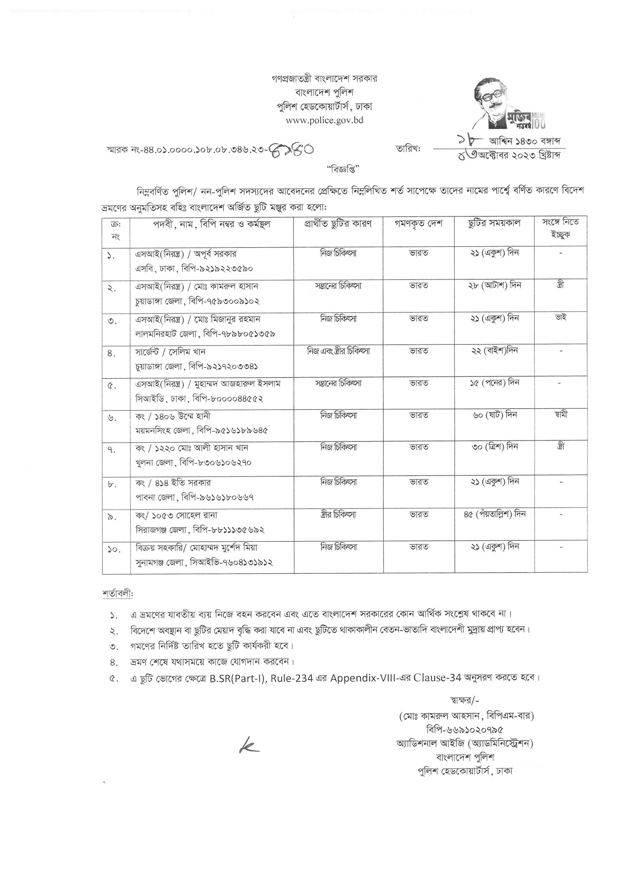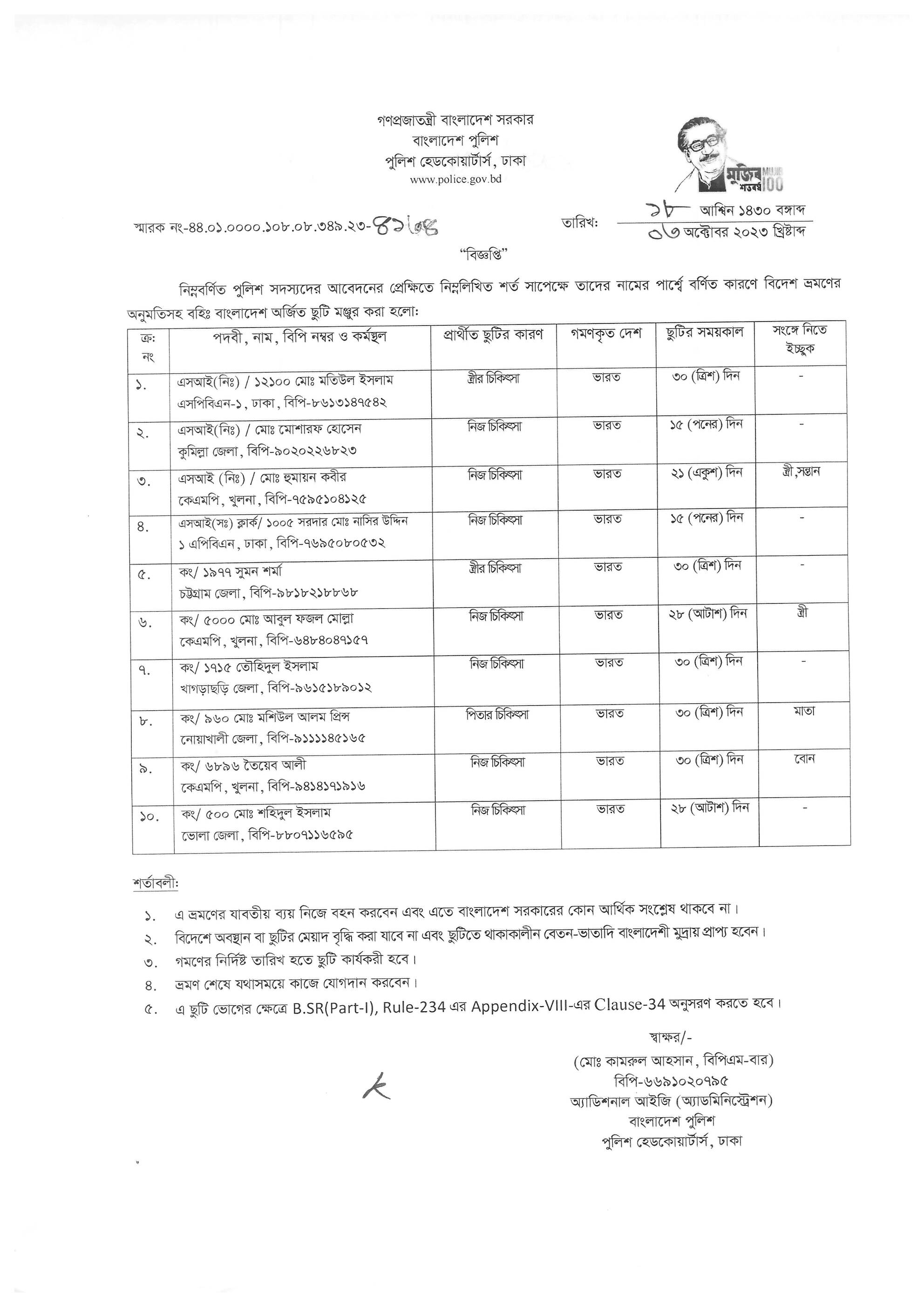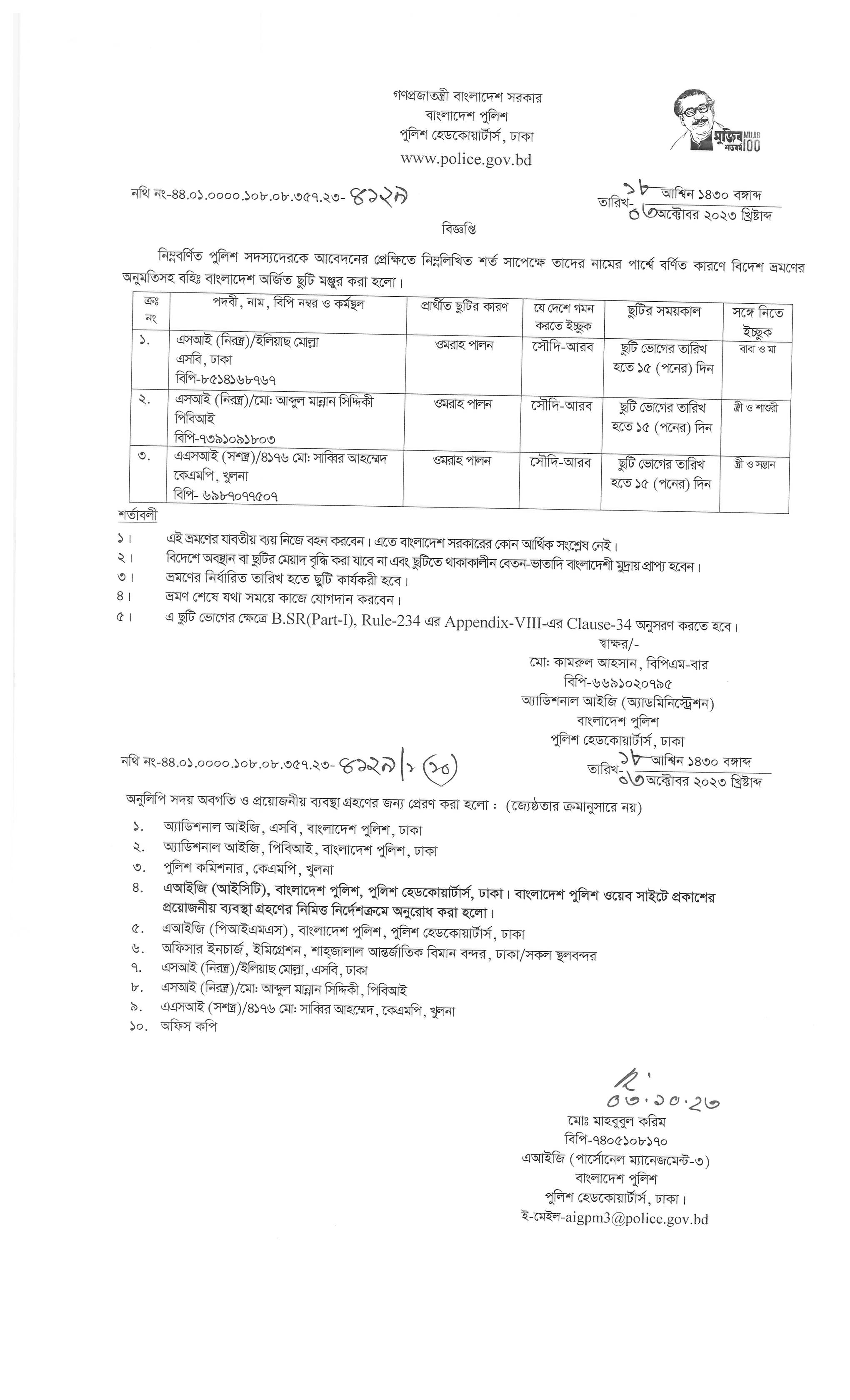 বহিঃ বাংলাদেশ গমন, বিজ্ঞপ্তি নং-৪১৯৩ তারিখঃ ০৮/১০/২০২৩ খ্রিঃ।