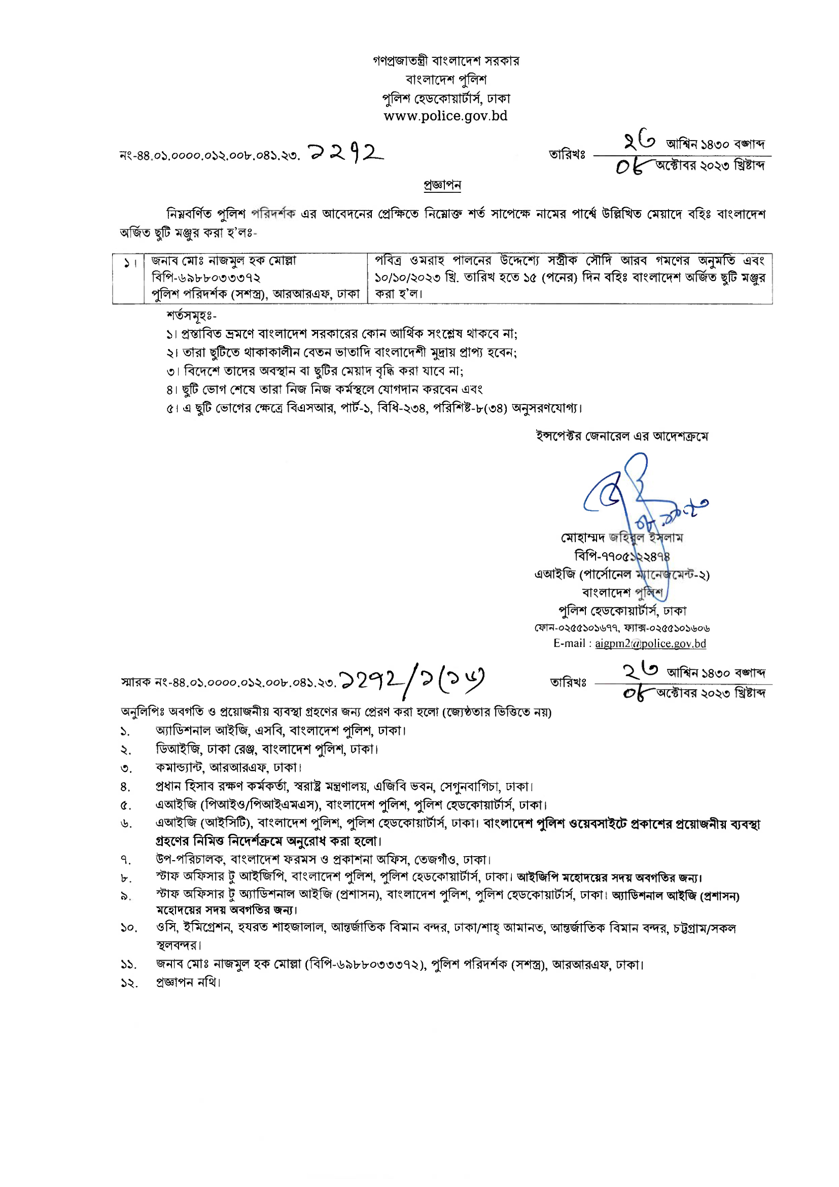 বহিঃ বাংলাদেশ ছুটি, প্রজ্ঞাপন নং-১২৪৬, তারিখঃ ০১/১০/২০২৩ খ্রিঃ।