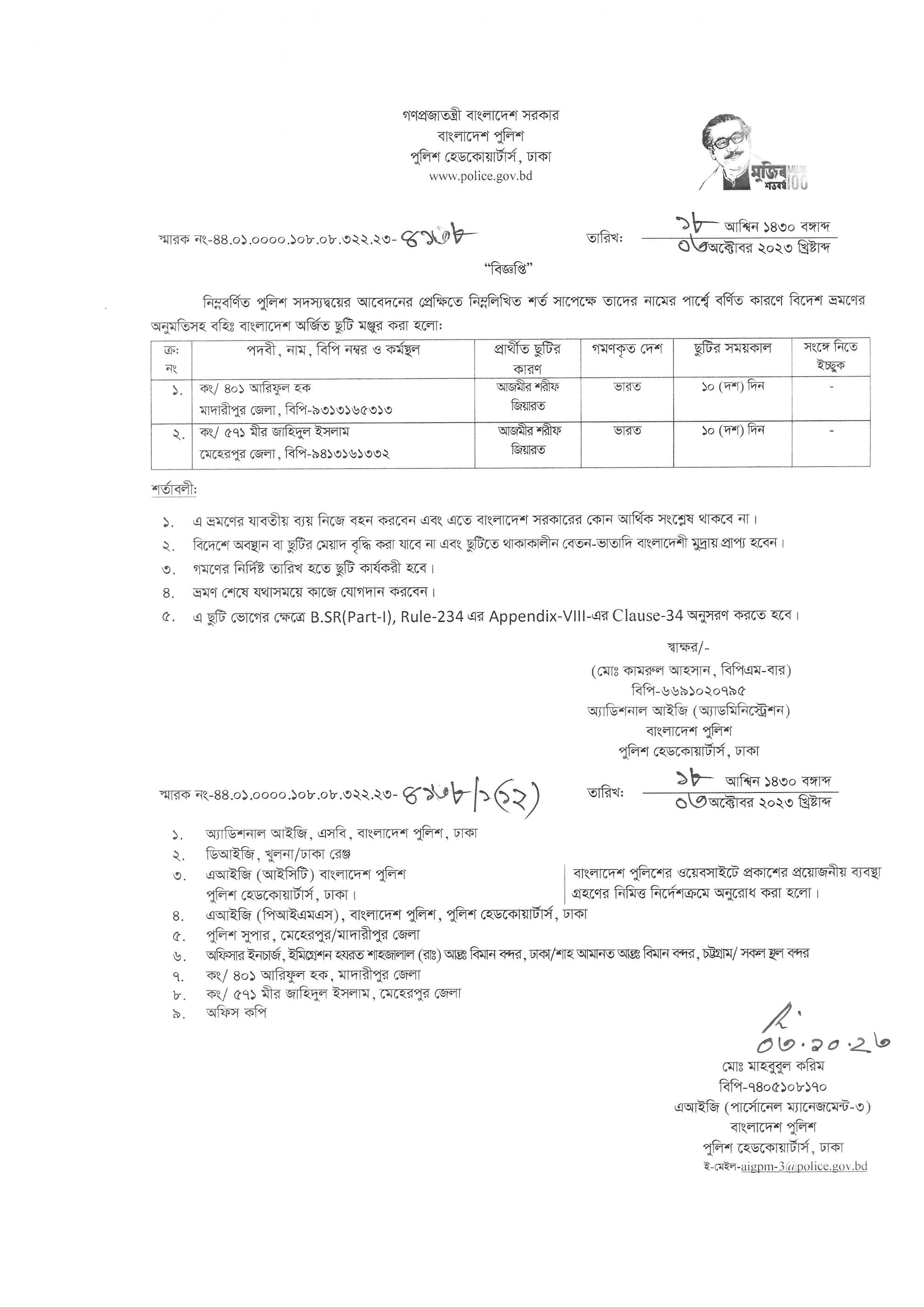 বহিঃ বাংলাদেশ ছুটি, প্রজ্ঞাপন নং-১২৫৫, তারিখঃ ০৪/১০/২০২৩ খ্রিঃ।
