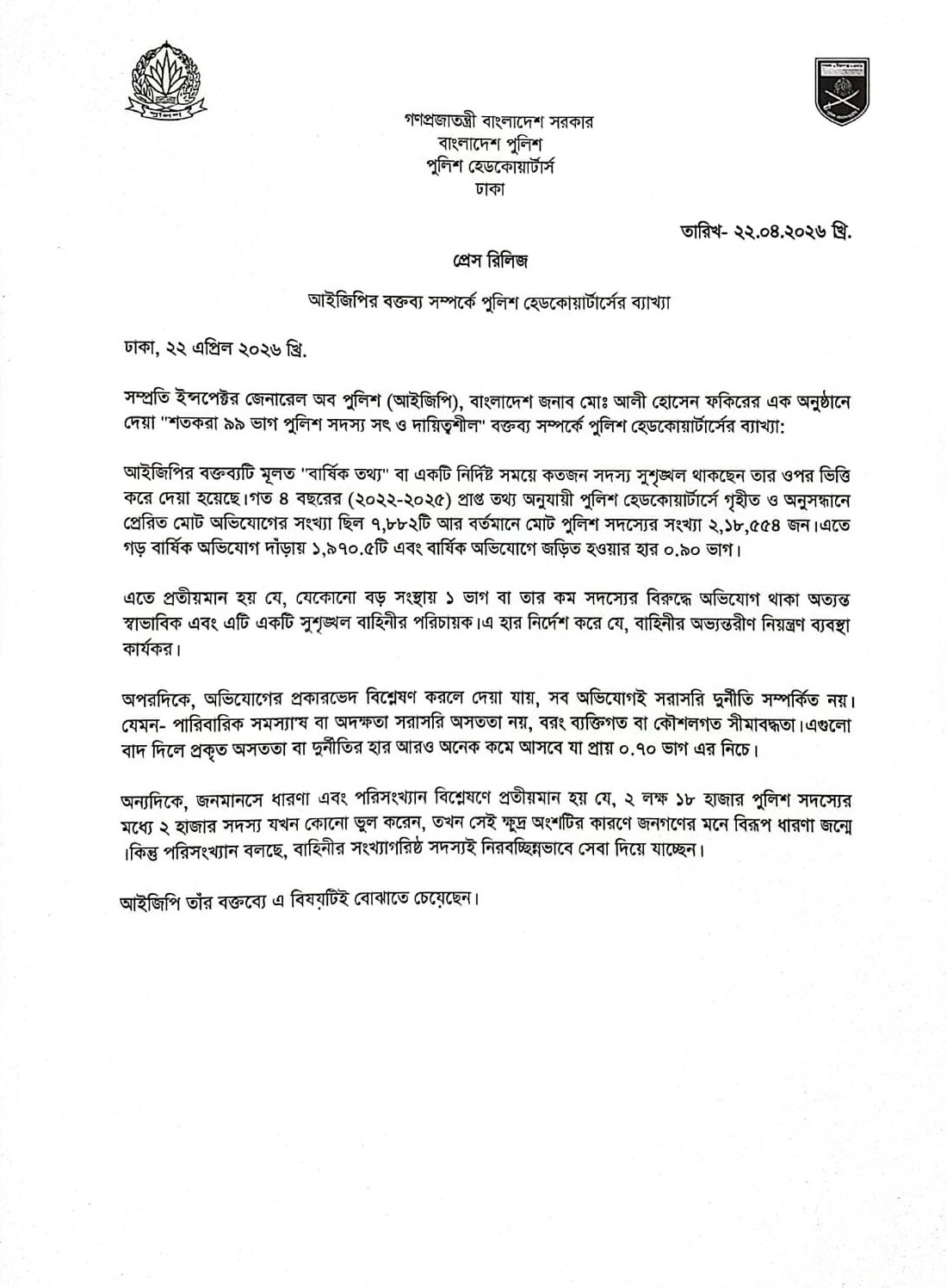 | 1 | Press Release on 22.04.26: আইজিপির বক্তব্য সম্পর্কে পুলিশ হেডকোয়ার্টার্সের ব্যাখ্যা | 22-04-2026 | View |