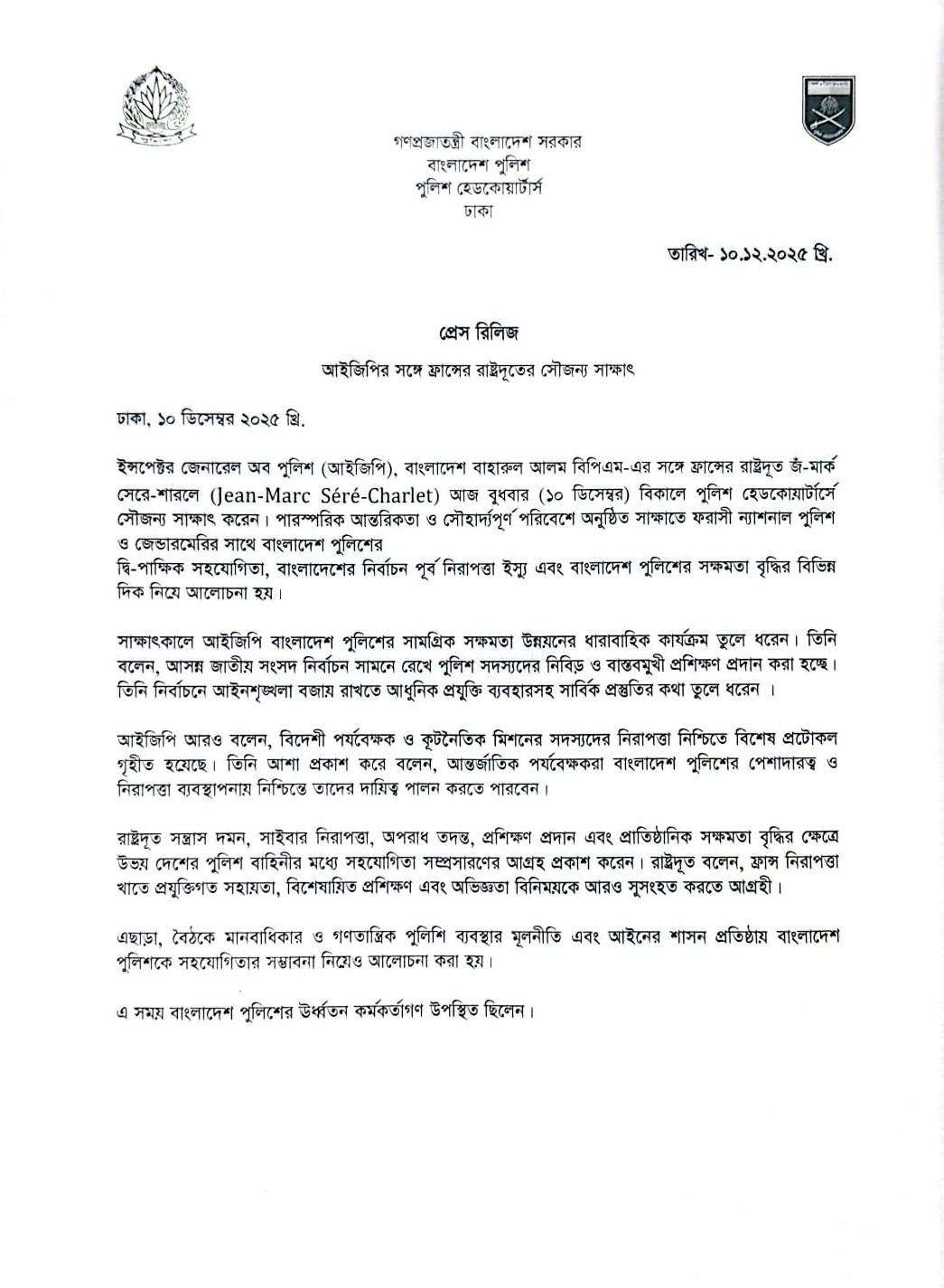 | 3 | Press Release on 10.12.25: আইজিপির সঙ্গে ফ্রান্সের রাষ্ট্রদূতের সৌজন্য সাক্ষাৎ | 10-12-2025 | View |