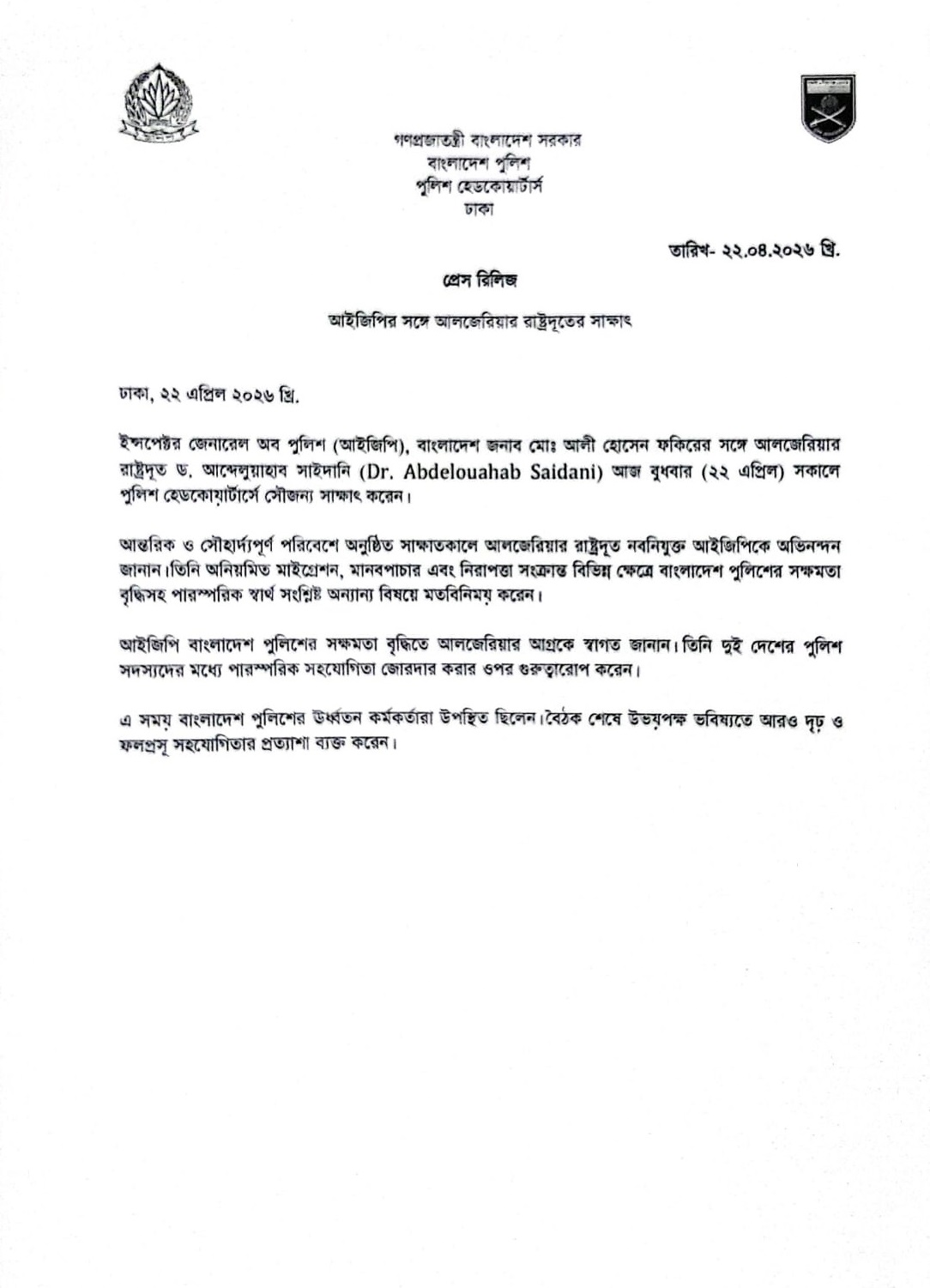 | 2 | Press Release on 22.04.26: আইজিপির সঙ্গে আলজেরিয়ার রাষ্ট্রদূতের সাক্ষাৎ | 22-04-2026 | View |