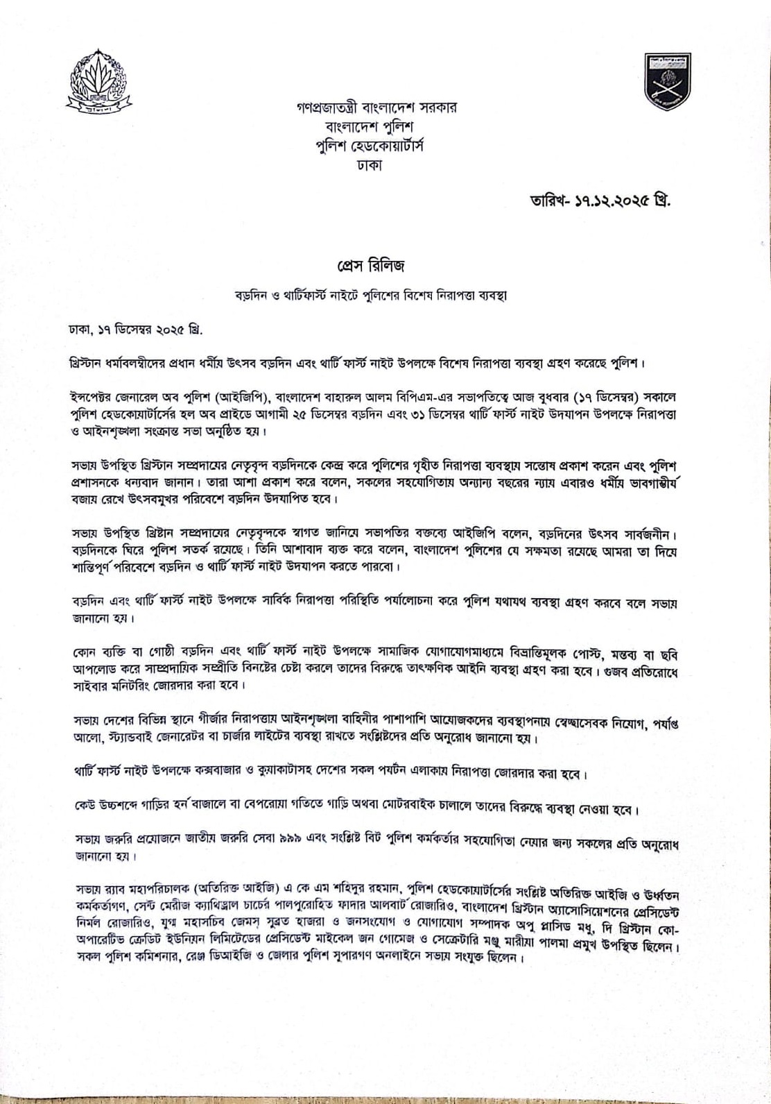 | 1 | Press Release on 17.12.25: বড়দিন ও থার্টিফার্স্ট নাইটে পুলিশের বিশেষ নিরাপত্তা ব্যবস্থা | 17-12-2025 | View |